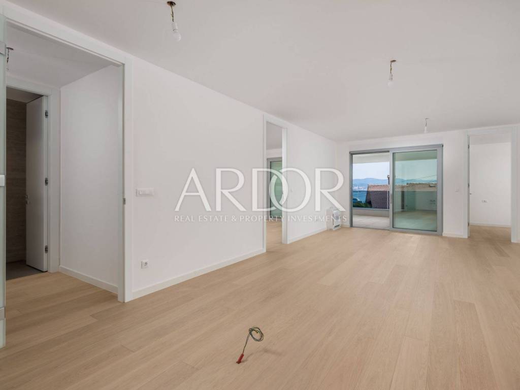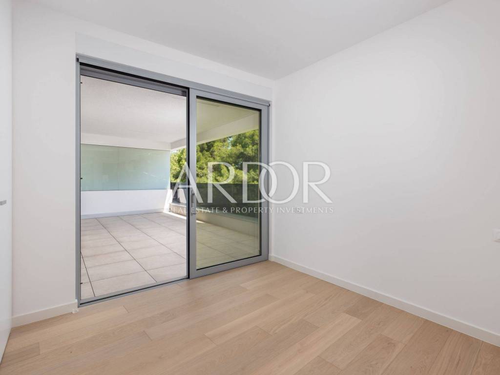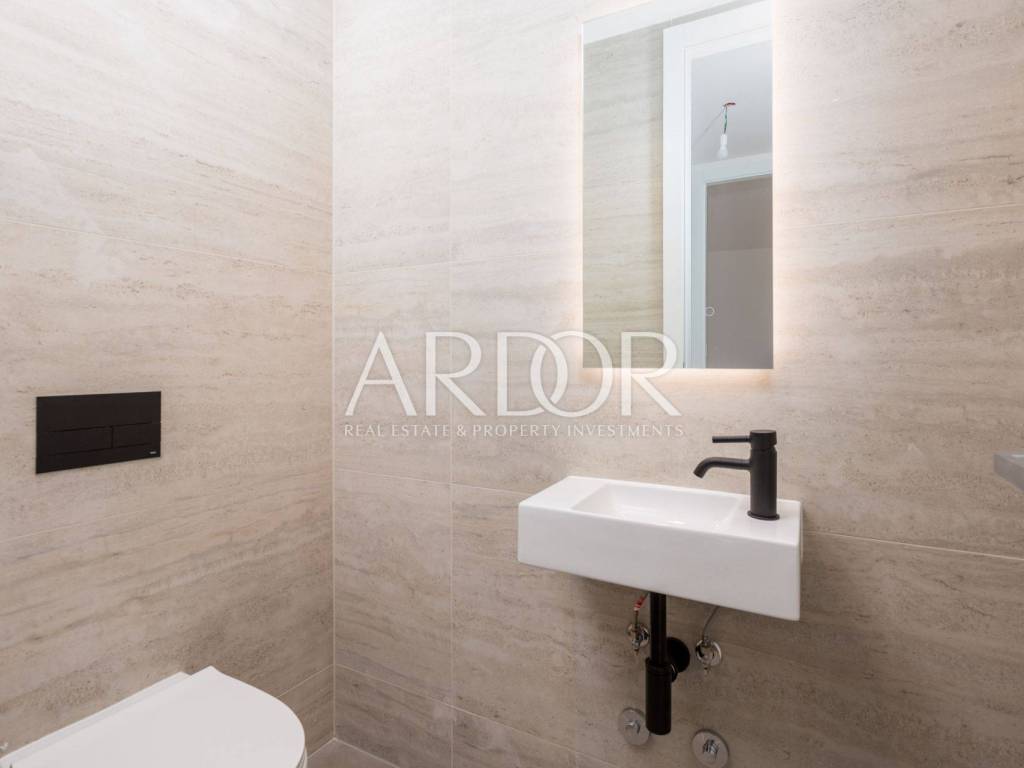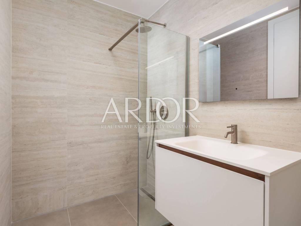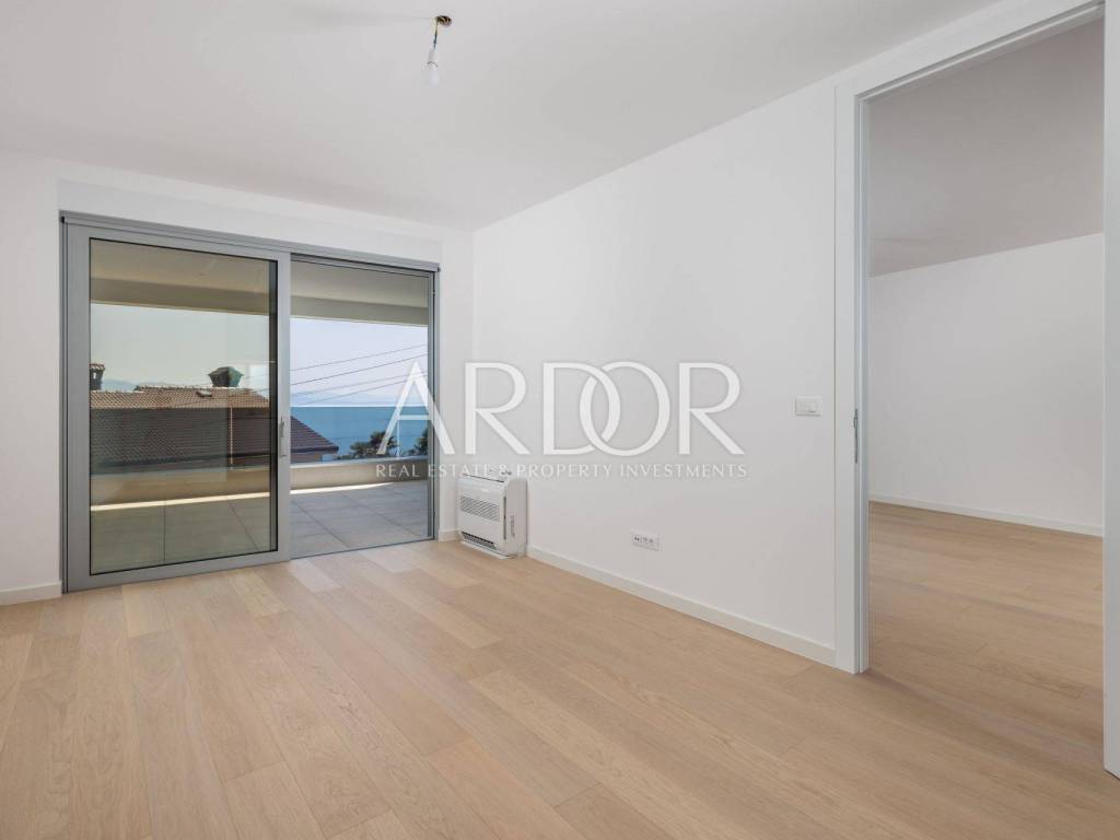 Ovaj luksuzni stan, smješten u prizemlju novogradnje, pruža spektakularan pogled na more i povijesnu jezgru Opatije. S terasom i zajedničkim bazenom, nekretnina nudi vrhunski stil života te savršeno spaja udobnost i eleganciju.