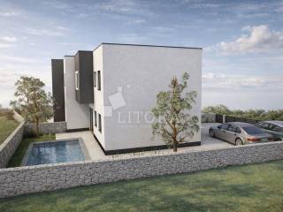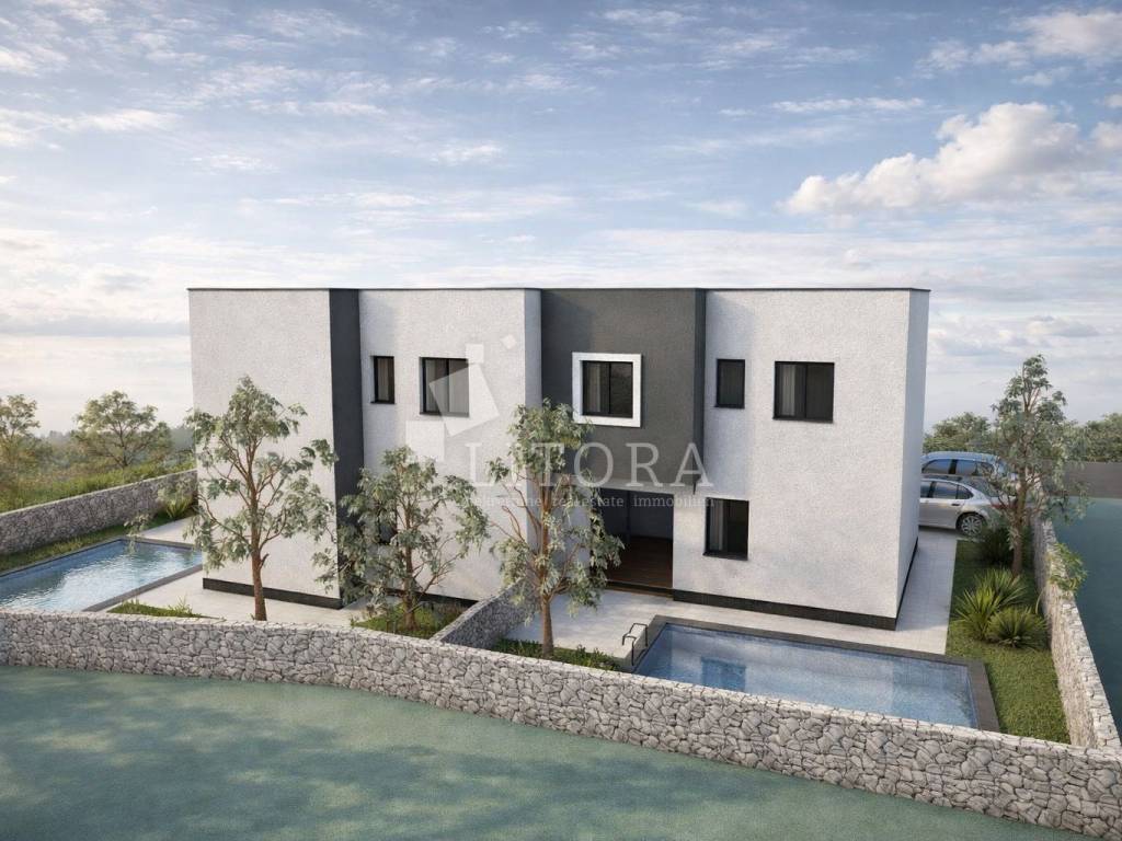 Tribunj, 140 m od plaže, u izrazito mirnom okruženju. Novogradnja – dvojna kuća s bazenom i okućnicom