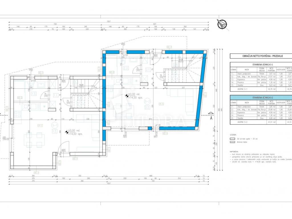 Obiteljska kuća ima ukupno 80,72 m² korisne površine i sastoji se od dvije etaže: prizemlja i 1. kata. U prizemlju se nalaze predsoblje, ostava, gostinjski WC, dnevni boravak s kuhinjom i blagovaonicom te izlazom na terasu koja je orijentirana na južnu stranu, a u sklopu koje se nalazi bazen.