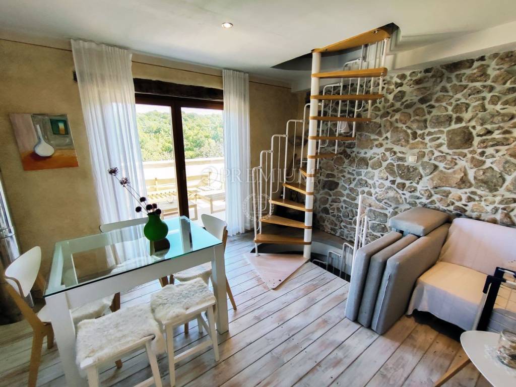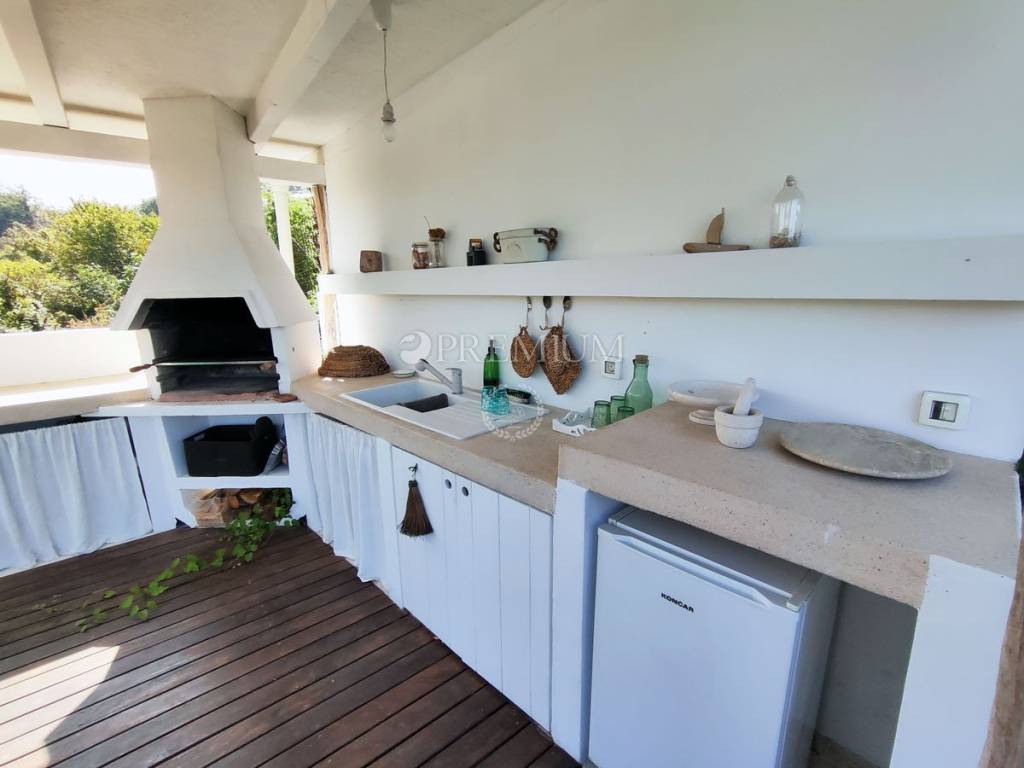 Na prvom katu nalazi se kuhinja, blagovaona i dnevni boravak s izlazom na terasu. Terasa pruža prekrasan pogled na zelenilo i djelomičan pogled na more.