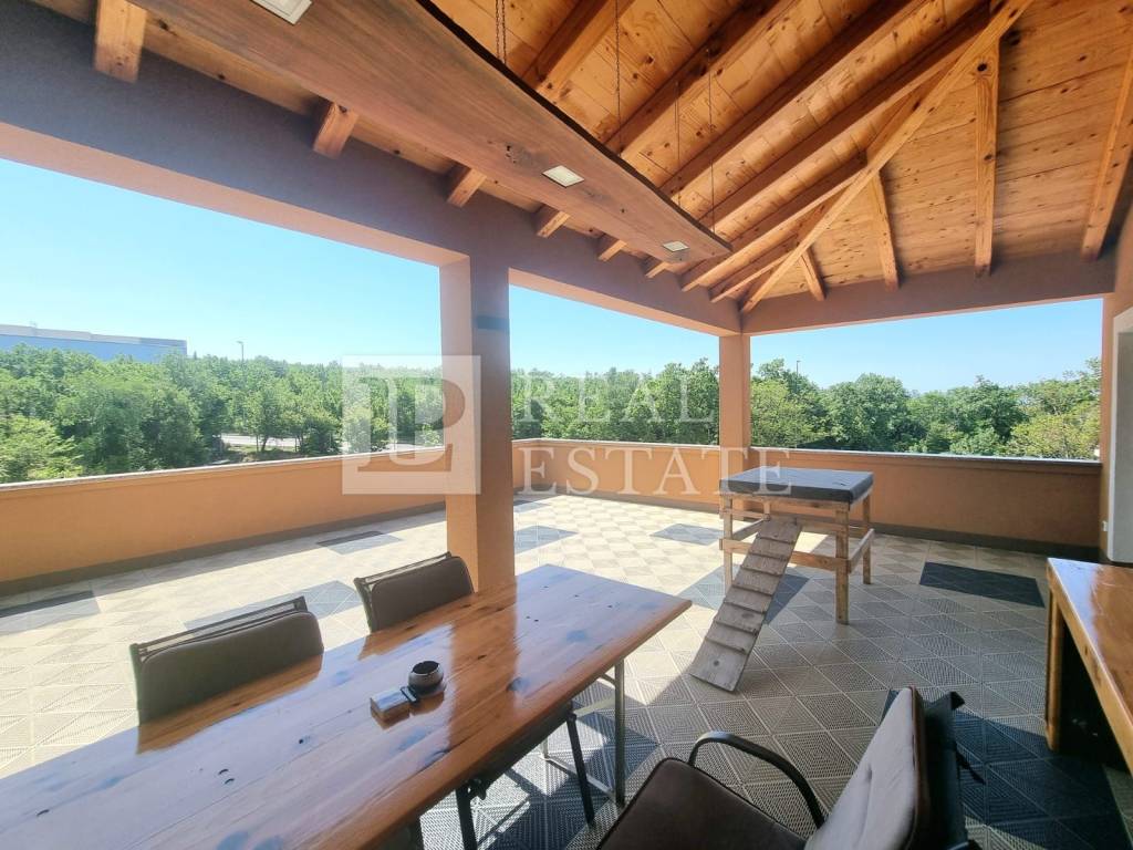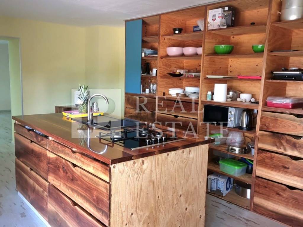 Unutarnjim stepenicama se dolazi na kat na kojem se nalazi kuhinja s blagovaonicom, zaista ogromni dnevni boravak te toalet. Iz dnevnog boravka se izlazi na terasu veličine 56 m2. Isto tako, moguće je s druge strane dnevnog boravka izaći na još jednu terasu veličine 65 m2. Na katu se nalaze i ostava te kotlovnica.