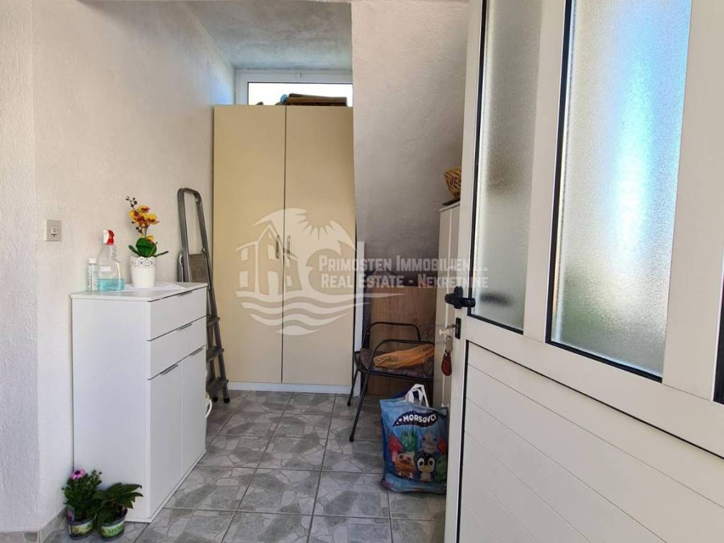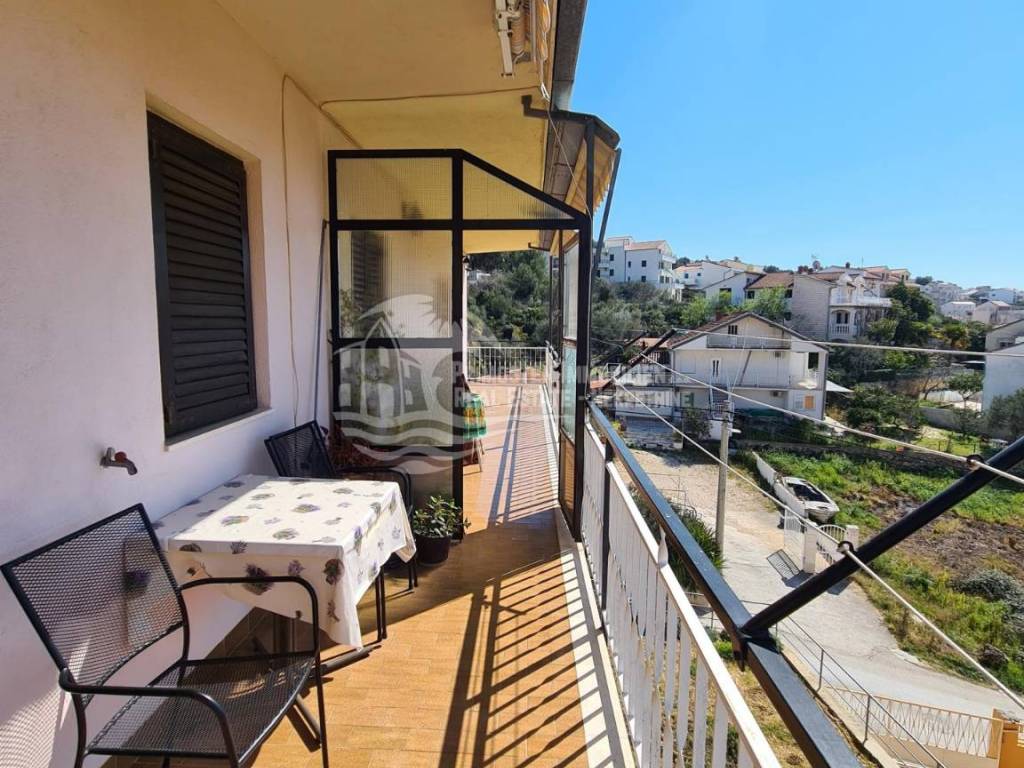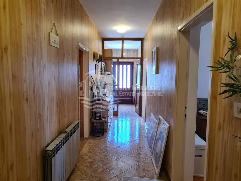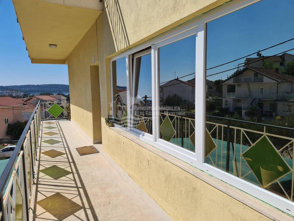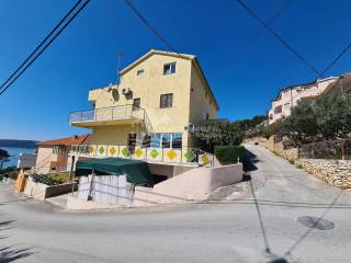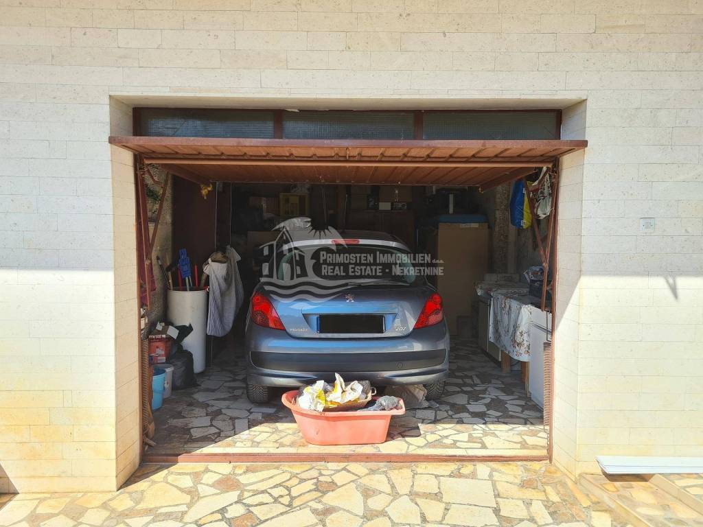 Kuća u Trogiru, 80 m od mora i plaže, sastoji se od suterena, prizemlja i dva kata. Stambena površina je 335 m², a izgrađena je na zemljištu od 524 m². U sklopu suterena se nalazi prostor za ljetnu kuhinju koji sadrži i prostoriju za dnevni boravak, ostava te garaža u kojoj se nalazi bazen za centralno grijanje na lož ulje. Ispred se nalazi i vrt. Stubištem se dolazi na dio prizemlja na kojem se nalazi prostrani peterosobni stan koji se sastoji od dnevnog boravka, kuhinje, četiri spavaće sobe, kupaonice i separatnog WC-a. Tri spavaće sobe imaju izlaz na terasu koja prolazi sa cijelom lijevom stranom stambene jedinice. Pripadajući dio je također i vanjski roštilj sa stražnje strane kuće u razini ove etaže. Također u sklopu sa stražnje strane se nalazi i manji prostor koji se koristi kao dodatni roštilj i ostava za drva. Nadalje, na prvoj etaži se nalaze dva stana. Prvi stan je trosoban te se sastoji od dnevnog boravka, kuhinje, dvije spavaće sobe i kupaonice te ima izlaz na terasu. Drugi stan je dvosoban te se sastoji od dnevnog boravka, kuhinje, spavaće sobe i kupaonice te također ima izlaz na terasu. U sklopu su instalirani i radijatori koji se mogu priključiti na centralno grijanje. Također u razini ove etaže se nalazi dodatni parking sa stražnje strane. Stubištem se dolazi na drugu etažu koja je ujedno i posljednja etaža. Tu se nalaze dva manja stana (cca 25 m² svaki stan). Svaki stan ima kuhinju i dnevni boravak, jednu spavaću sobu, kupaonicu i manju ostavu. Stanovi imaju izlaz na veliku terasu s koje se pruža fantastični panoramski pogled na more koji se ne može zakloniti. Kuća ima sve priključke (struja, voda, kanalizacija), svi stanovi imaju svoje brojilo za struju i vodu te zasebne ulaze. Sve stambene jedinice su etažirane. More se nalazi u blizini, a centar Trogira je udaljen oko 1 km. Zračna luka Split je udaljena oko 10 km.