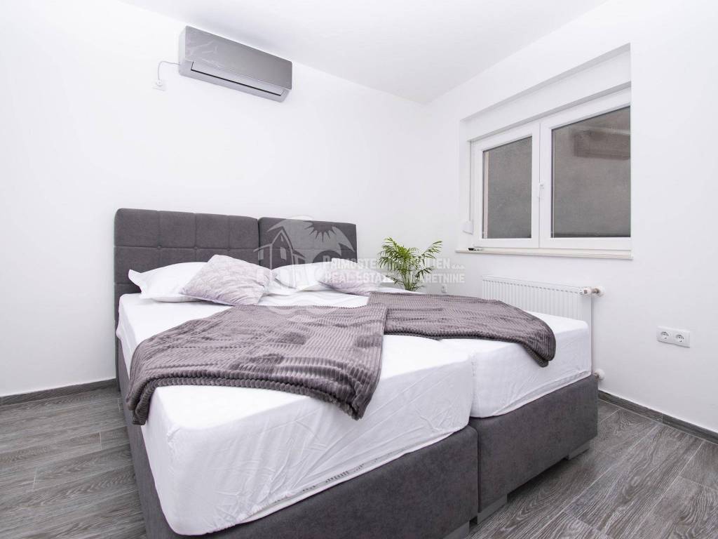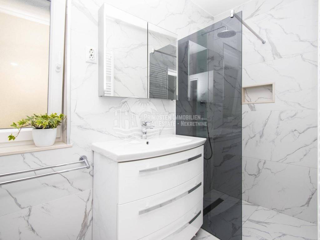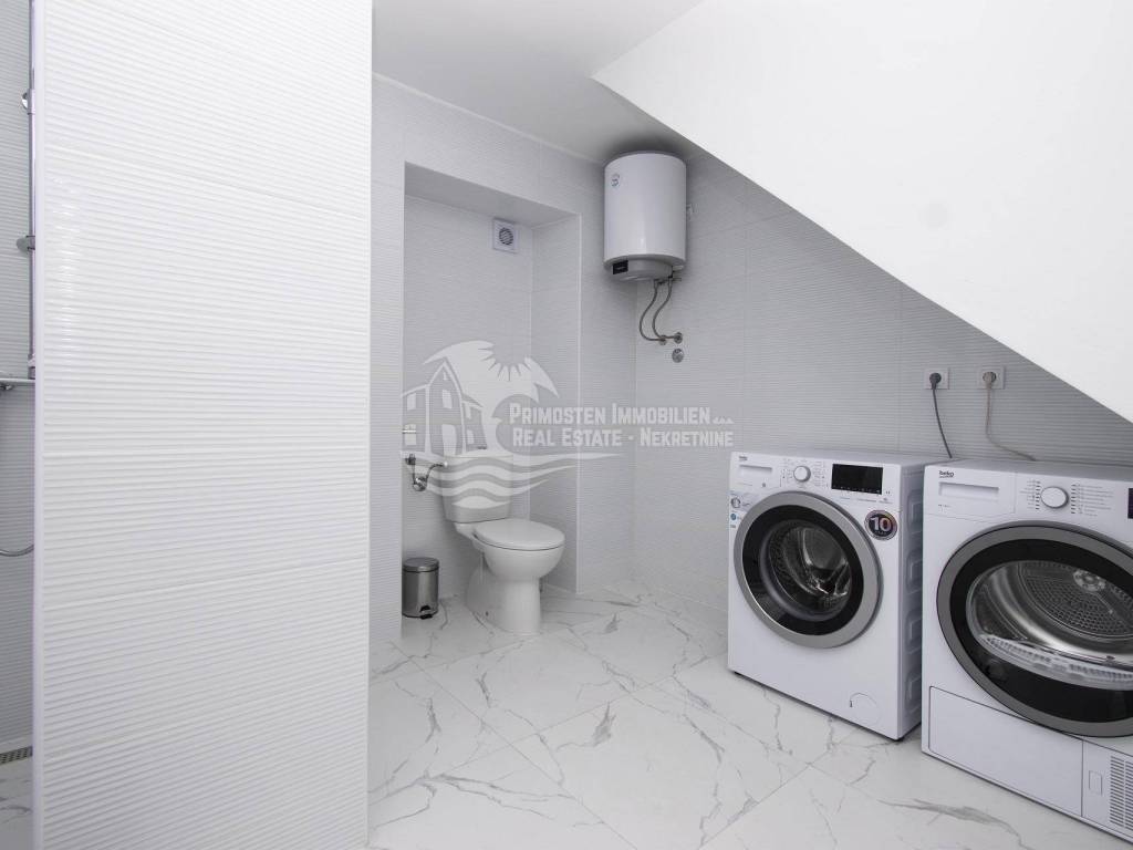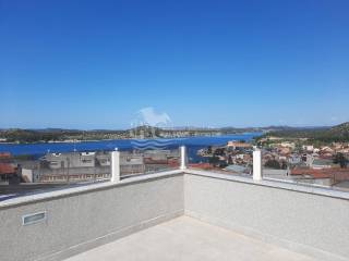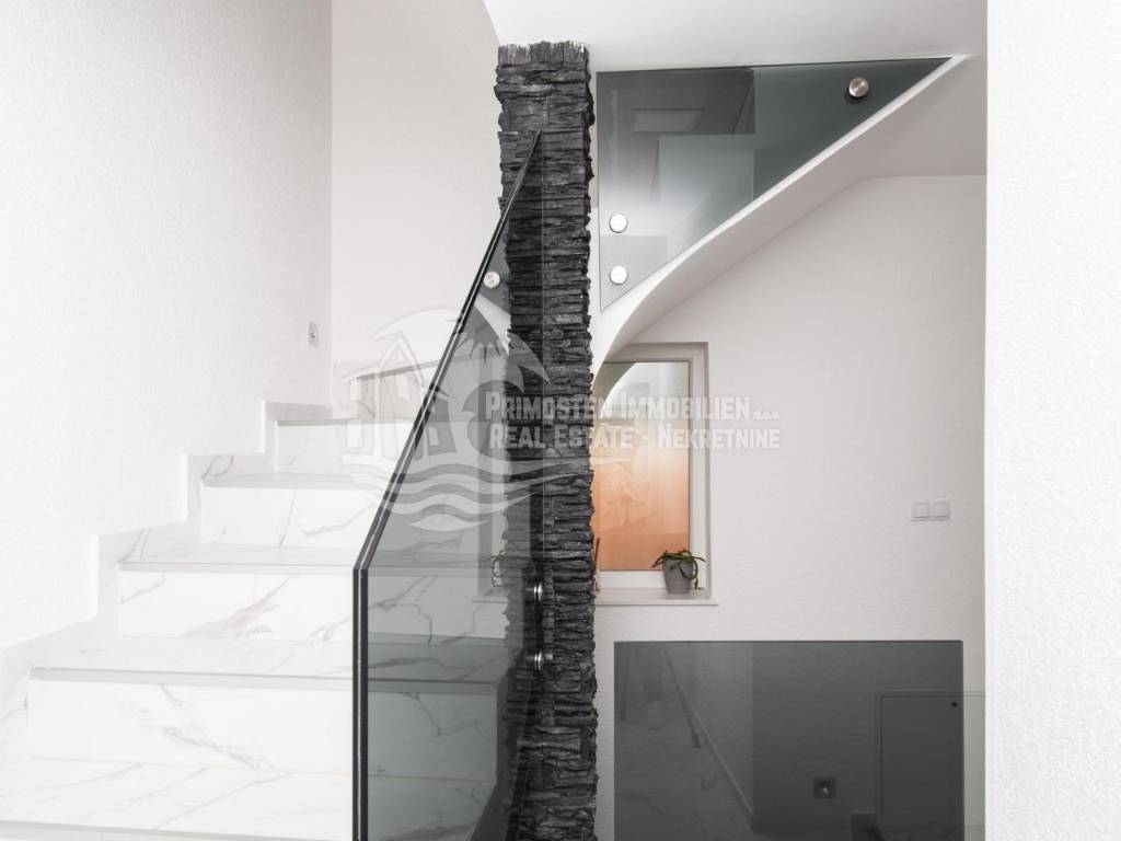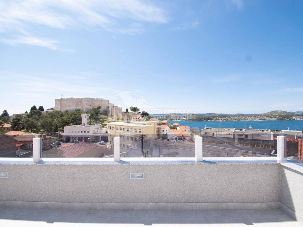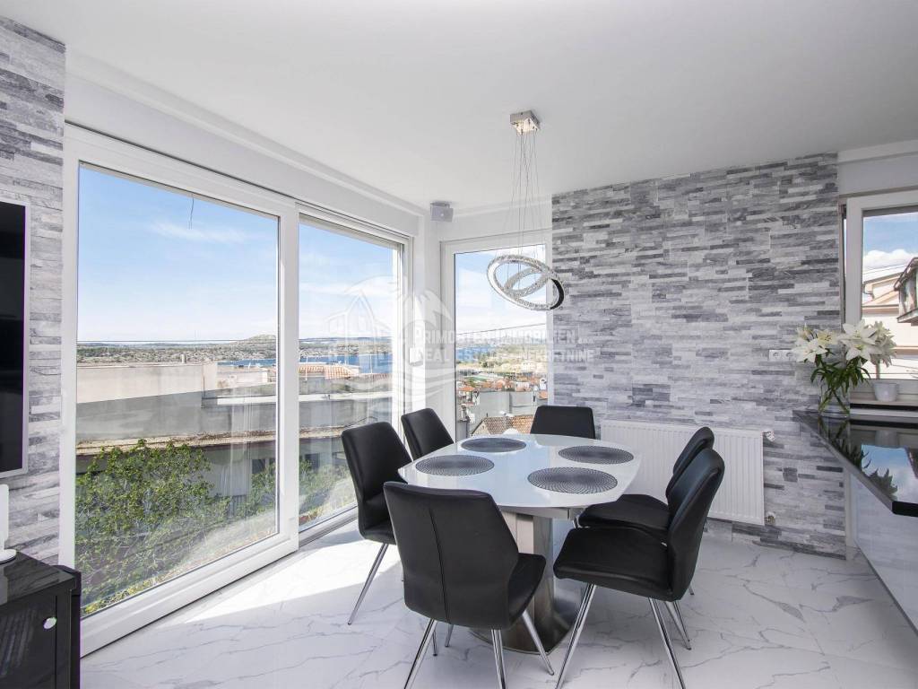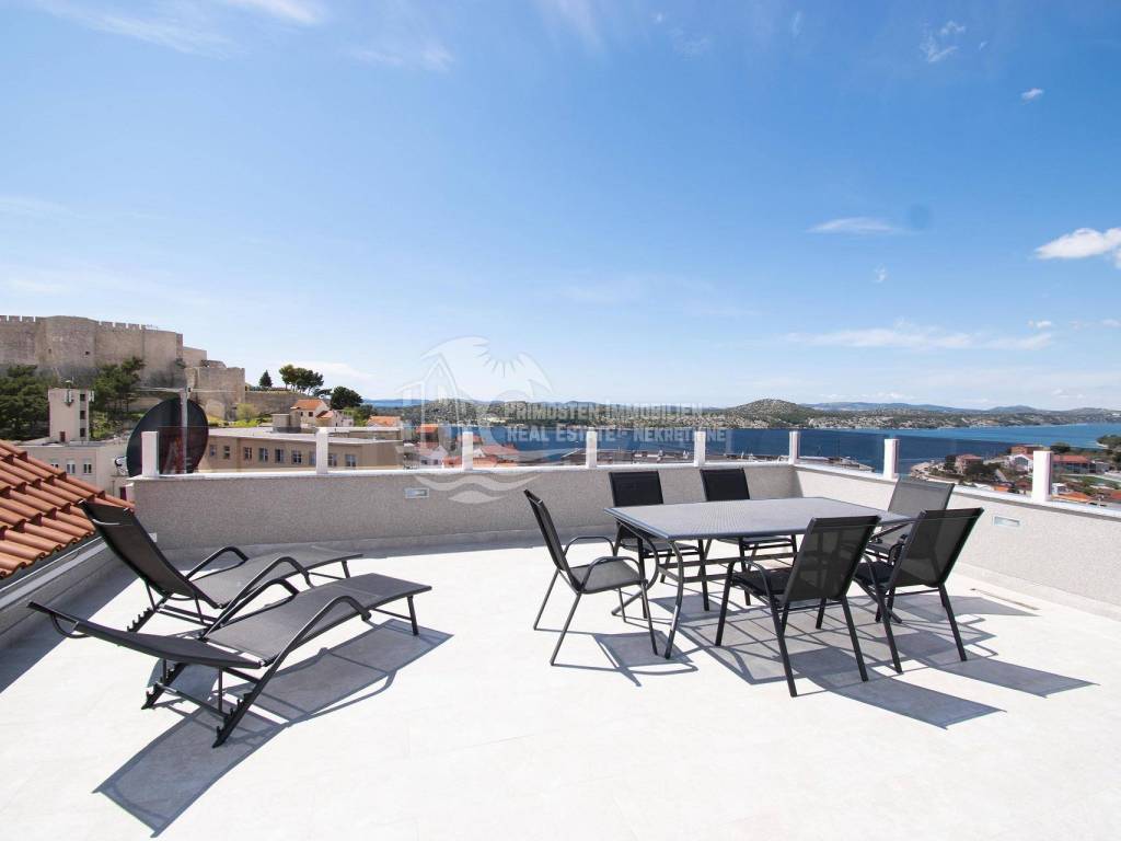 Prodaje se moderna renovirana kuća u Šibeniku, površine 214 m² te je izgrađena na parceli 111 m². Sastoji se od prizemlja i dva kata. U prizemlju se nalaze dva ulaza od kojih je jedan ulaz za garažu od 45 m², a drugi obuhvaća ulazni prostor i kupaonicu. Sa prizemlja se stubištem dolazi na prvi kat na kojem se nalazi spavaća soba sa kupaonicom, hodnik te spremište. Također u sklopu se nalazi još i unutarnje stubište za drugi kat na kojem se nalaze dnevni boravak, kuhinja, blagovaonica, spavaća soba i kupaonica. Sa ove etaže se pruža lijepi pogled na more i grad te je lijepo prostrano raspoređena. Površina stana je 90 m². Na prizemlju se nalazi još i drugi ulaz preko kojeg se dolazi u dvoetažni stan od 50 m², a koji se sastoji od hodnika, dnevnog boravka, kuhinje i spavaće sobe na katu, te kupaonice i hodnika na prizemlju. Stubište spaja prizemlje i prvi kat. Stanu još pripada i nenatkrivena terasa od 16 m². Nadalje na prvom katu se nalazi stubište koje vodi na prostranu krovnu terasu od 65 m² koja uključuje garnituru za sjedenje i jacuzzi. Sa terase se pruža fantastičan panoramski pogled na more i grad Šibenik. Kuća je nedavno renovirana, klimatizirana, ima modernu tehničku opremu te se prodaje sa namještajem. Također još su uključena i dva dodatna parkirna mjesta. Udaljenost od mora i centra grada je oko 500 m.