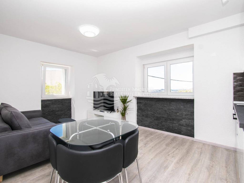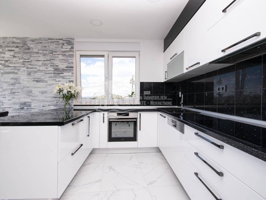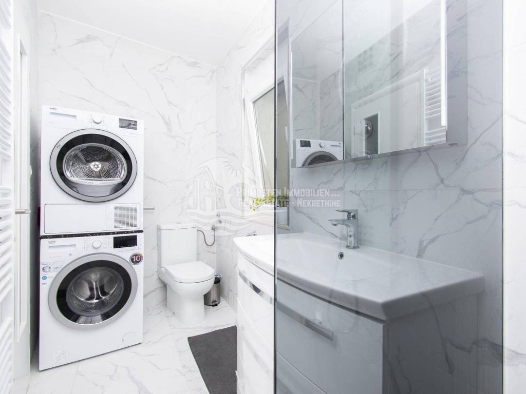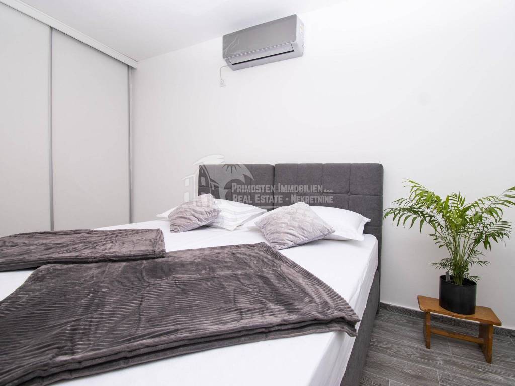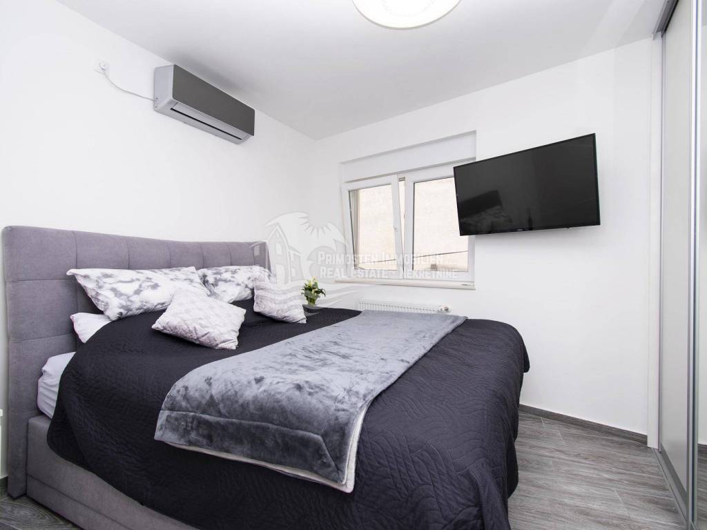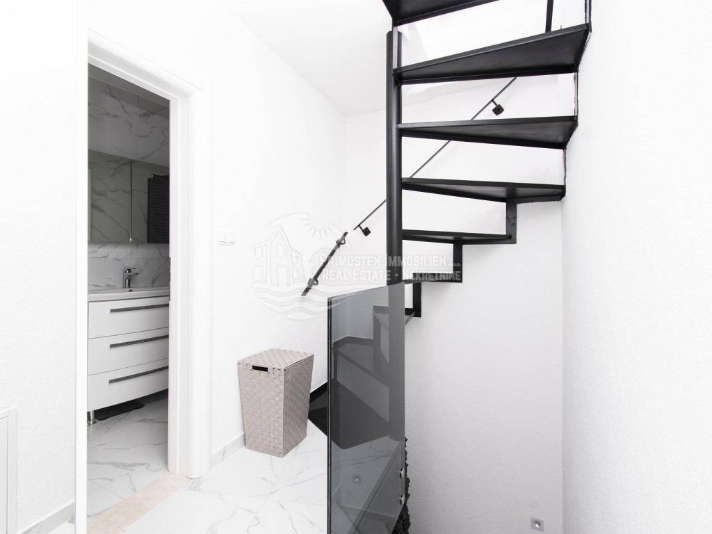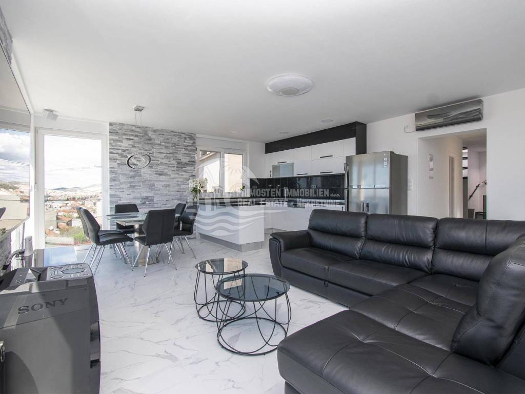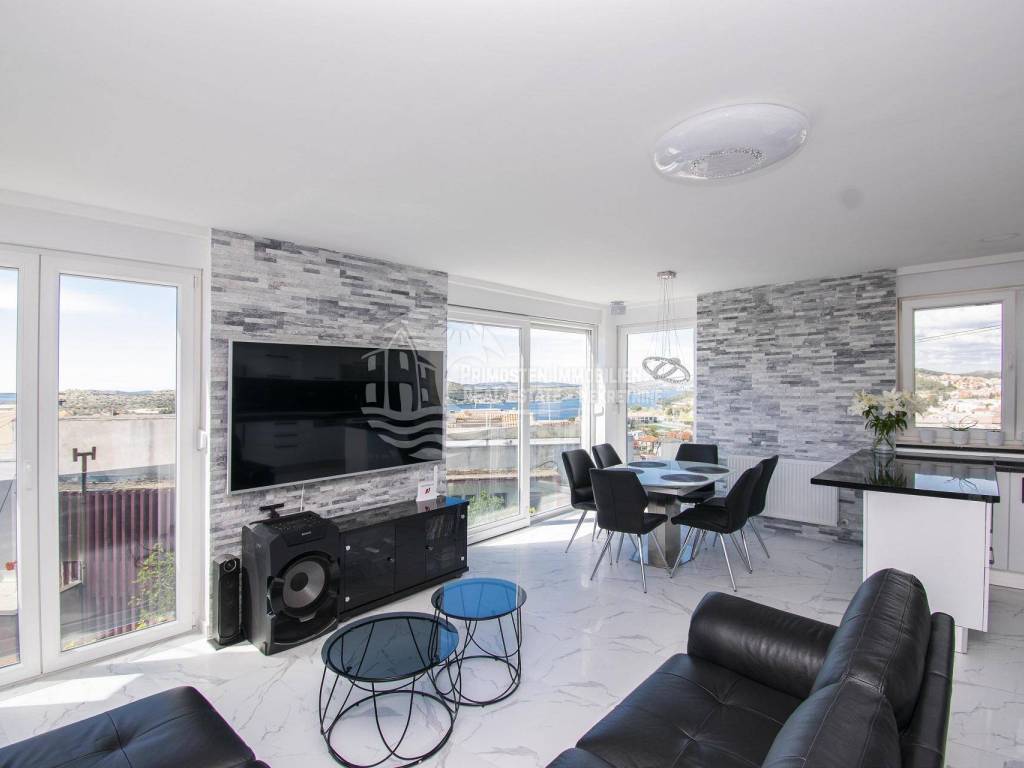 Prodaje se moderna renovirana kuća u Šibeniku, površine 214 m² te je izgrađena na parceli 111 m². Sastoji se od prizemlja i dva kata. U prizemlju se nalaze dva ulaza od kojih je jedan ulaz za garažu od 45 m², a drugi obuhvaća ulazni prostor i kupaonicu. Sa prizemlja se stubištem dolazi na prvi kat na kojem se nalazi spavaća soba sa kupaonicom, hodnik te spremište. Također u sklopu se nalazi još i unutarnje stubište za drugi kat na kojem se nalaze dnevni boravak, kuhinja, blagovaonica, spavaća soba i kupaonica. Sa ove etaže se pruža lijepi pogled na more i grad te je lijepo prostrano raspoređena. Površina stana je 90 m². Na prizemlju se nalazi još i drugi ulaz preko kojeg se dolazi u dvoetažni stan od 50 m², a koji se sastoji od hodnika, dnevnog boravka, kuhinje i spavaće sobe na katu, te kupaonice i hodnika na prizemlju. Stubište spaja prizemlje i prvi kat. Stanu još pripada i nenatkrivena terasa od 16 m². Nadalje na prvom katu se nalazi stubište koje vodi na prostranu krovnu terasu od 65 m² koja uključuje garnituru za sjedenje i jacuzzi. Sa terase se pruža fantastičan panoramski pogled na more i grad Šibenik. Kuća je nedavno renovirana, klimatizirana, ima modernu tehničku opremu te se prodaje sa namještajem. Također još su uključena i dva dodatna parkirna mjesta. Udaljenost od mora i centra grada je oko 500 m.