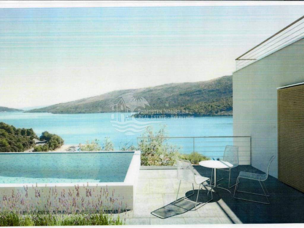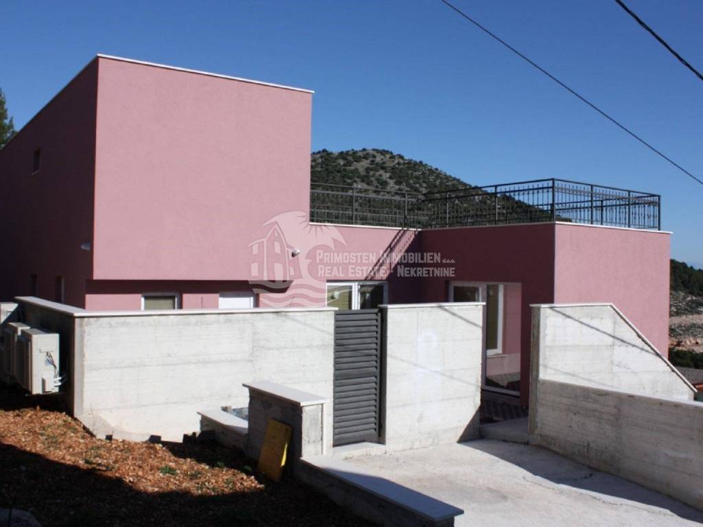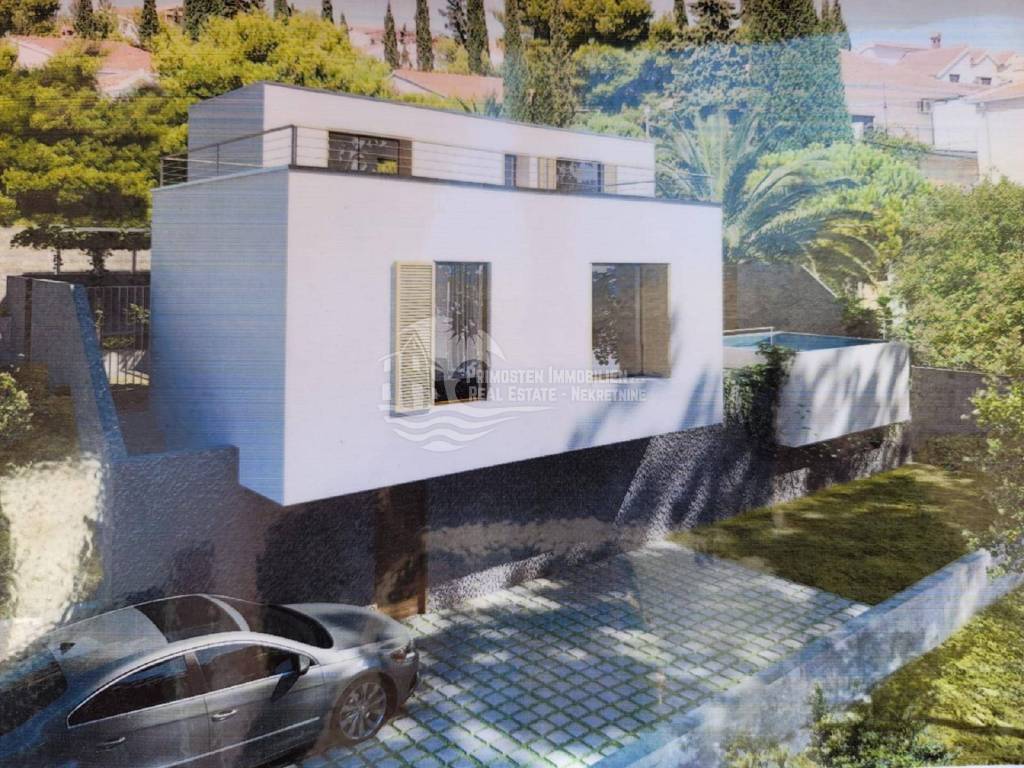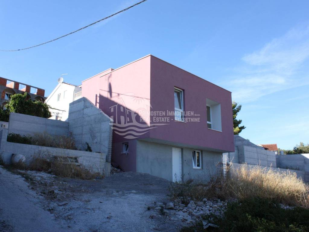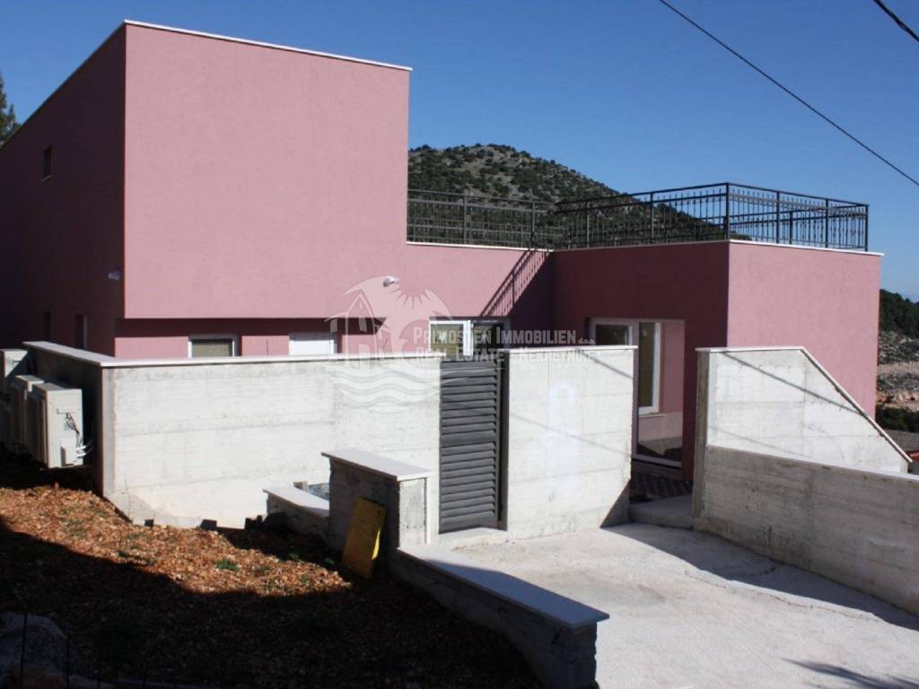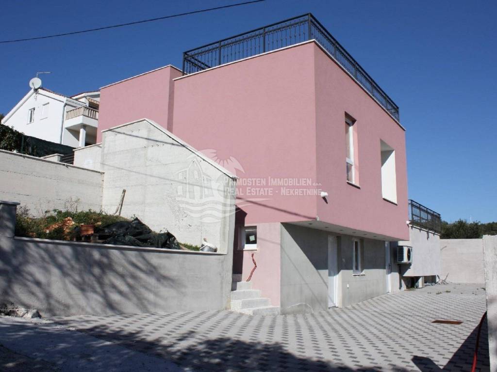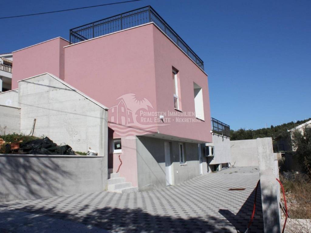 Vila u izgradnji s očaravajućim pogledom na more. Udaljenost od mora je cca 300 m zračne linije. Smještena je na padini u mjestu Marina. Kuća ima stambenu površinu 180 m², površinu okućnice je 340 m² a izgrađena je na parceli netto površine 520 m². Sastoji se od suterena, prizemlja i kata. U suterenu (29 m²) se nalazi kuhinja s blagovaonicom i dnevnim boravkom te kupaonica s WC-om. Nadalje, na prizemlju se nalazi dnevni boravak i kuhinja s pogledom na more, kupaonica i jedna spavaća soba. Na katu se nalaze dvije spavaće sobe, kupaonica te velika terasa od 50 m² južne orijentacije s pogledom na more. U sklopu kuće se nalazi bazen, roštilj, parkiralište sa 5 parkirnih mjesta te vrt.