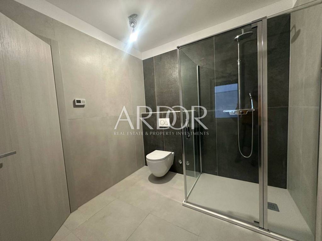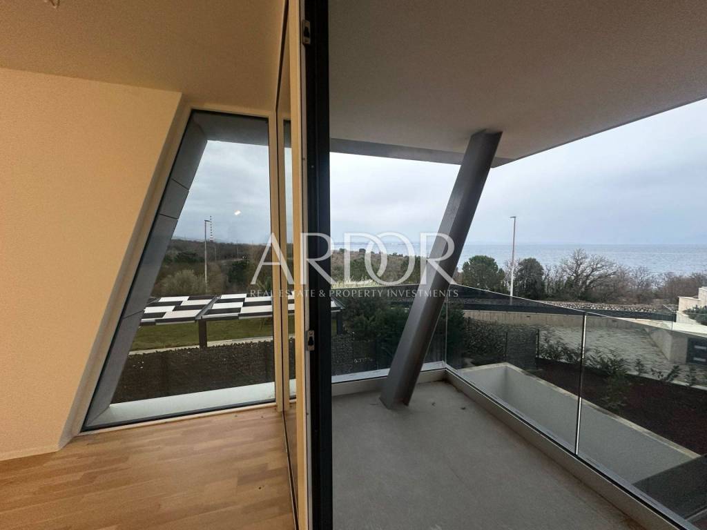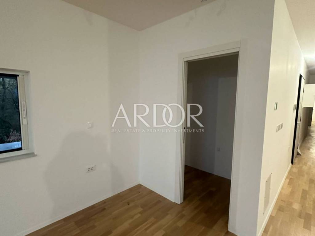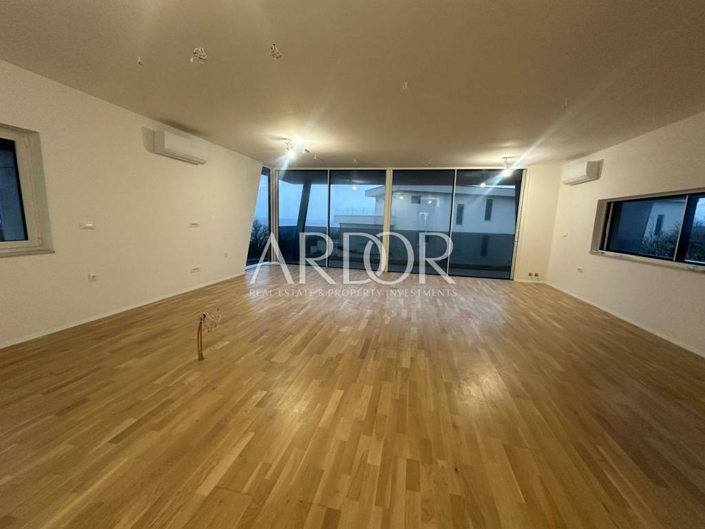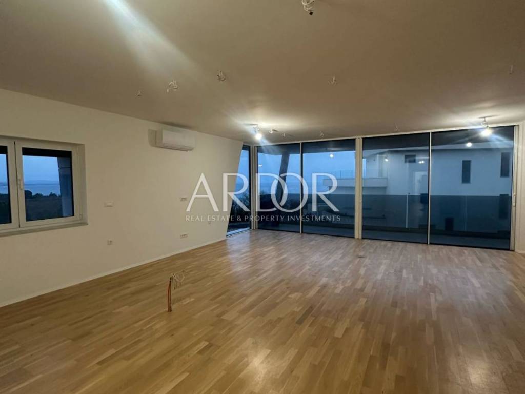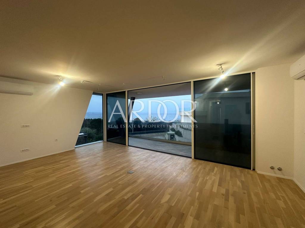 Stan se proteže duž cijele etaže i sastoji se od tri prostrane spavaće sobe. Dvije sobe dijele zajedničku kupaonicu, dok glavna spavaća soba ima vlastitu kupaonicu i garderobu. Južno orijentirani open space dnevni boravak, kuhinja i blagovaonica otvaraju se prema terasi s očaravajućim pogledom na more i prirodu, stvarajući savršen prostor za opuštanje i obiteljska druženja. Terasa pruža idealan ambijent za uživanje na otvorenom. Dodatno, stan uključuje gostinjski WC, utility room i hodnik koji povezuje sve prostorije.