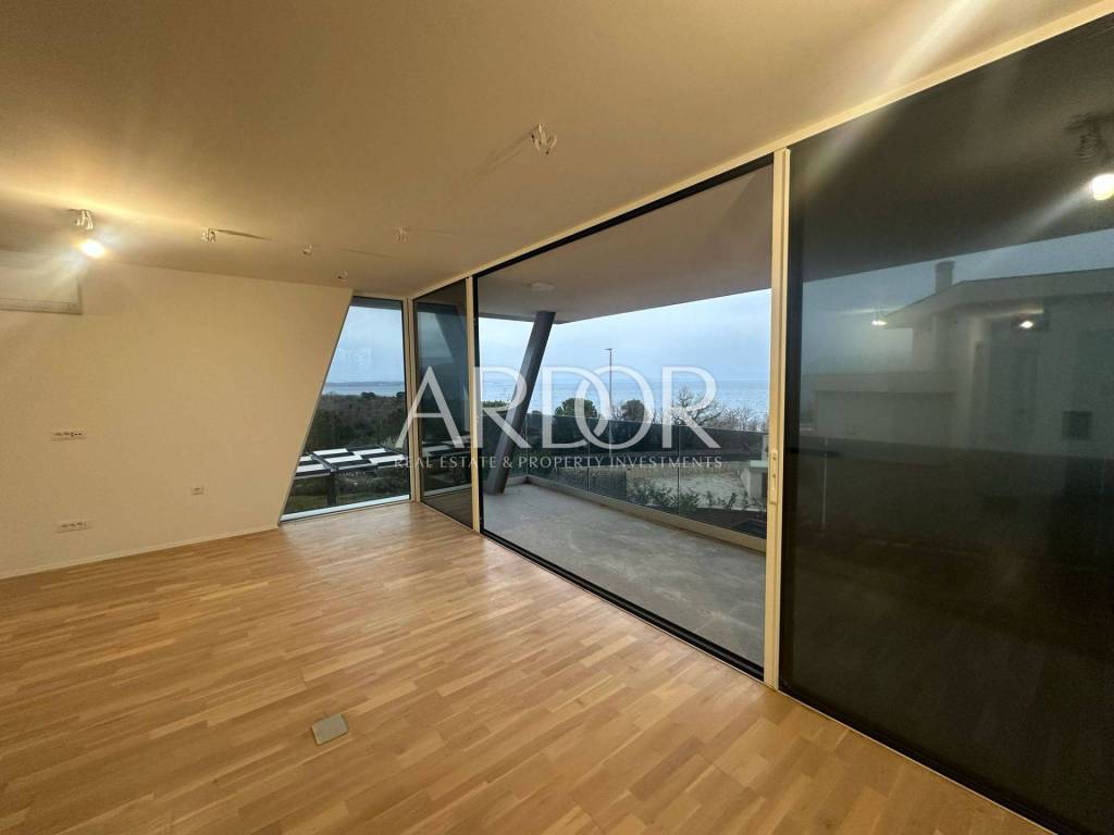 U ponudi imamo luksuzan stan smješten na prvom katu moderne novogradnje, smještene u prvom redu do mora, s prekrasnim pogledom na more iz gotovo svake prostorije. Stan je prostran i osunčan tijekom cijelog dana zahvaljujući odličnoj orijentaciji.