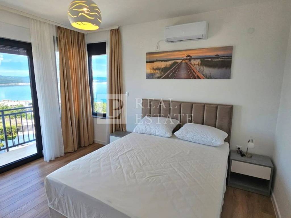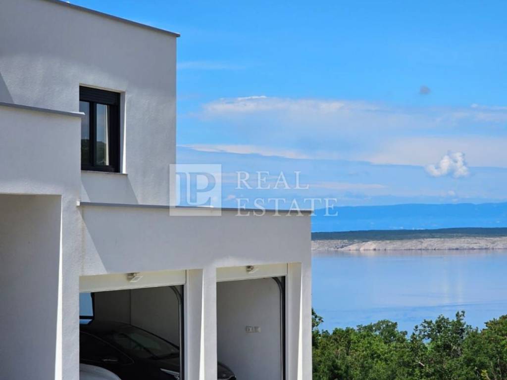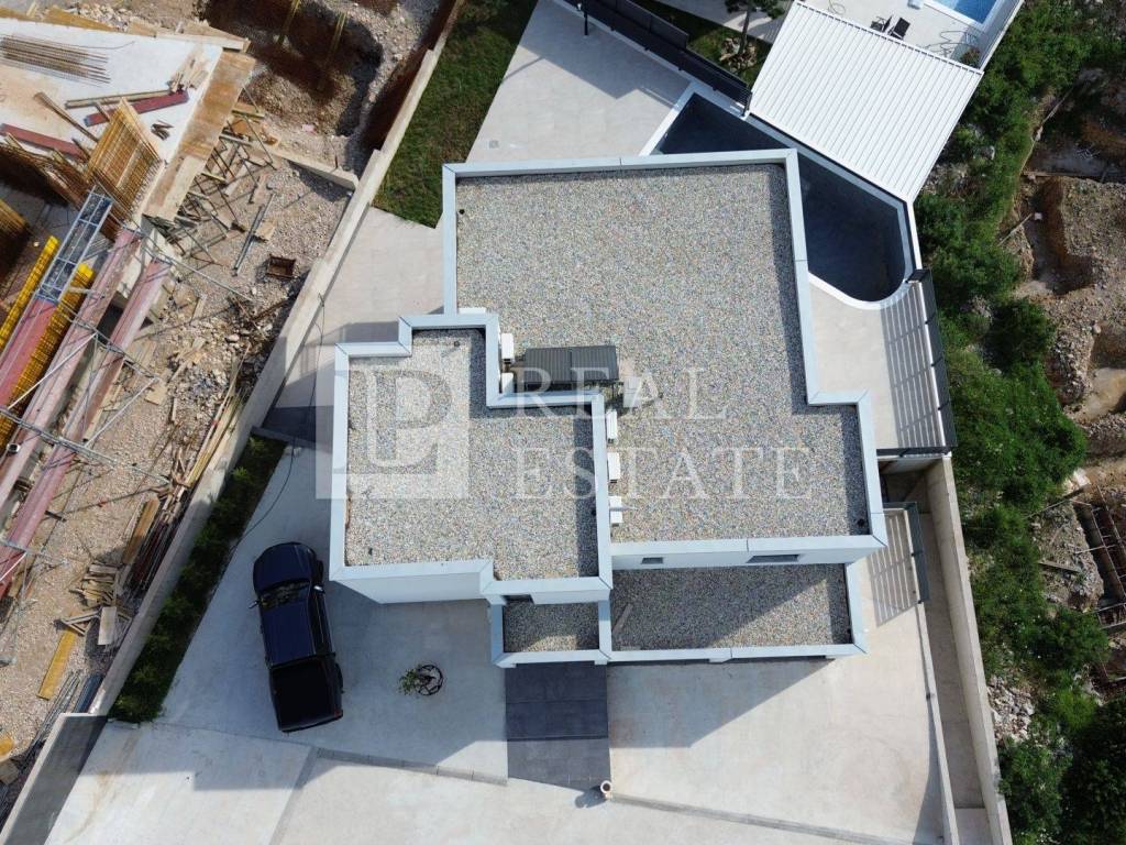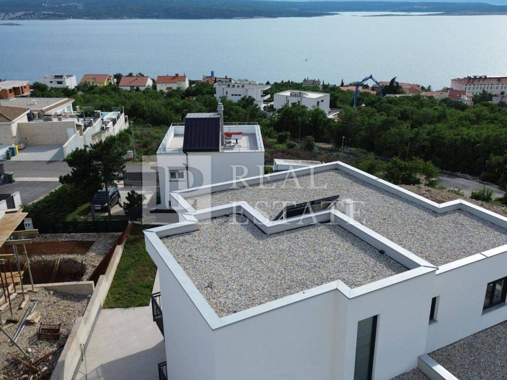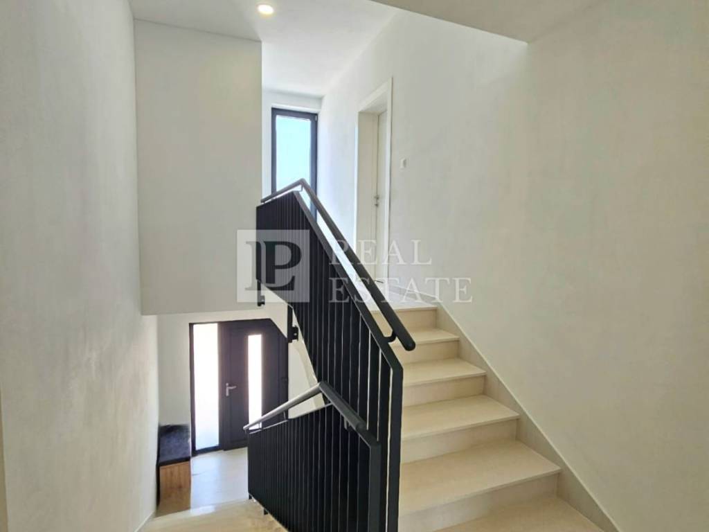 Unutarnjim stepenicama se dolazi na kat gdje se nalaze četiri spavaće sobe od kojih svaka ima vlastitu kupaonicu, vešeraj te jedno dodatno spremište. Svaka soba koja se nalazi na katu ima i svoju terasu s koje se pruža otvoreni pogled na Kvarner i otok Krk. Unutar okućnice ove raskošne nekretnine nalazi se infinity bazen s kojeg se prostire pogled na more čime je omogućeno dodatno uživanje i opuštanje u istom. Na bazen je moguće izaći direktno iz dnevnog boravka pri otvaranju klizne stijene. Garaža za dva automobila je dodatna prednost ove nekretnine.