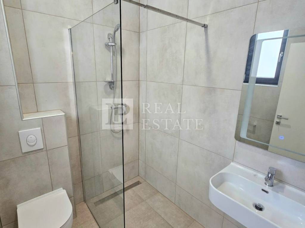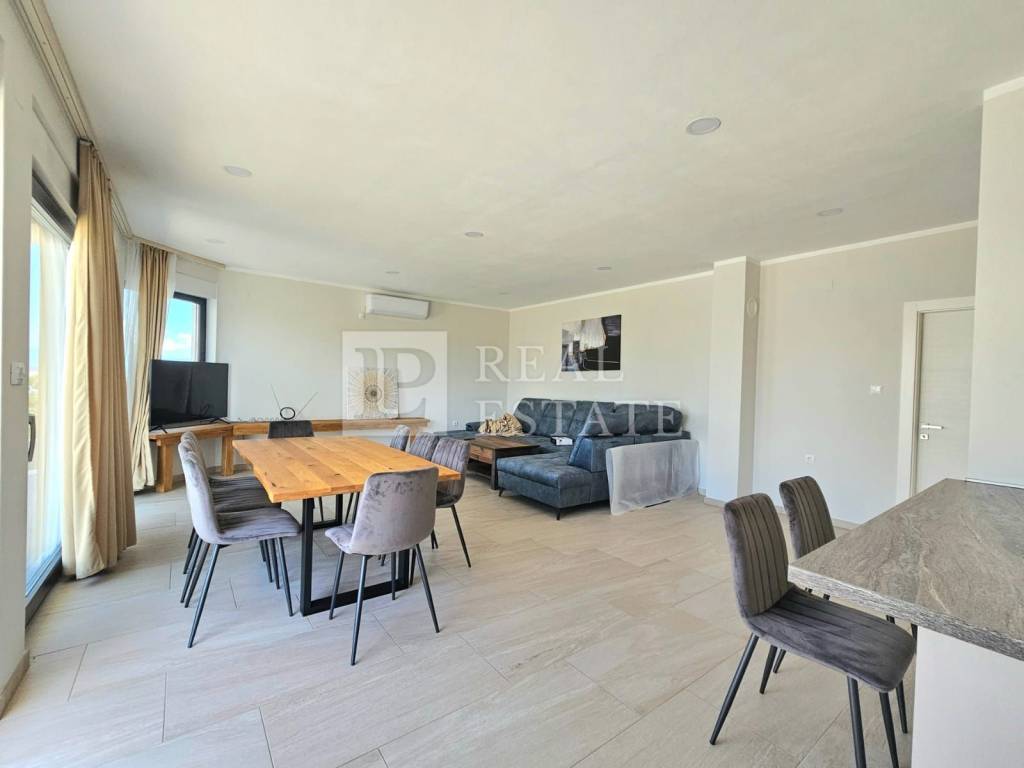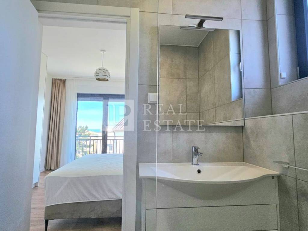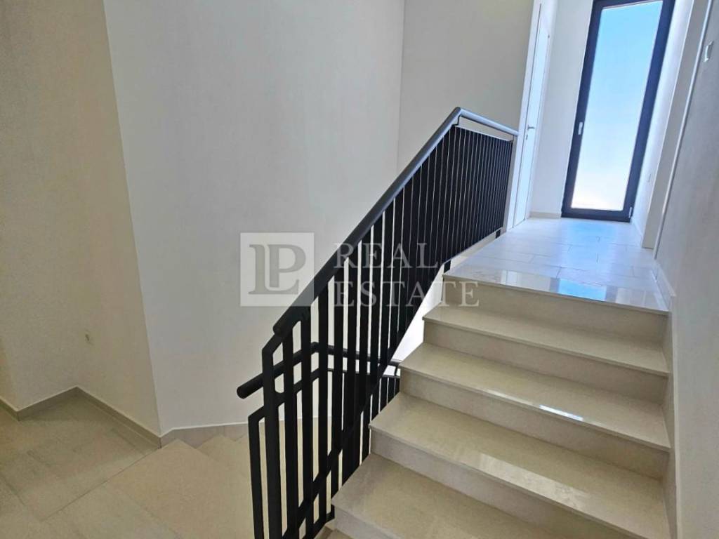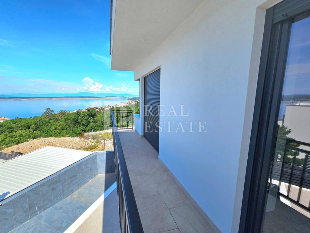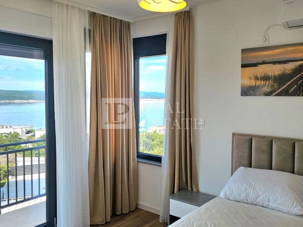 Unutarnjim stepenicama se dolazi na kat gdje se nalaze četiri spavaće sobe od kojih svaka ima vlastitu kupaonicu, vešeraj te jedno dodatno spremište. Svaka soba koja se nalazi na katu ima i svoju terasu s koje se pruža otvoreni pogled na Kvarner i otok Krk. Unutar okućnice ove raskošne nekretnine nalazi se infinity bazen s kojeg se prostire pogled na more čime je omogućeno dodatno uživanje i opuštanje u istom. Na bazen je moguće izaći direktno iz dnevnog boravka pri otvaranju klizne stijene. Garaža za dva automobila je dodatna prednost ove nekretnine.