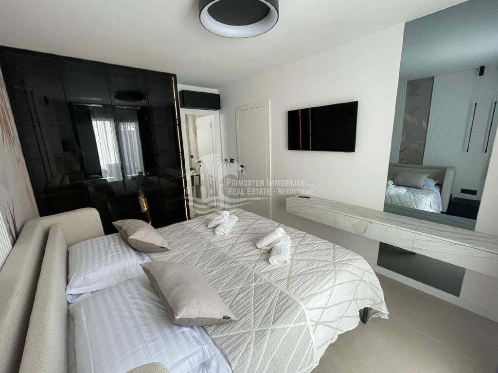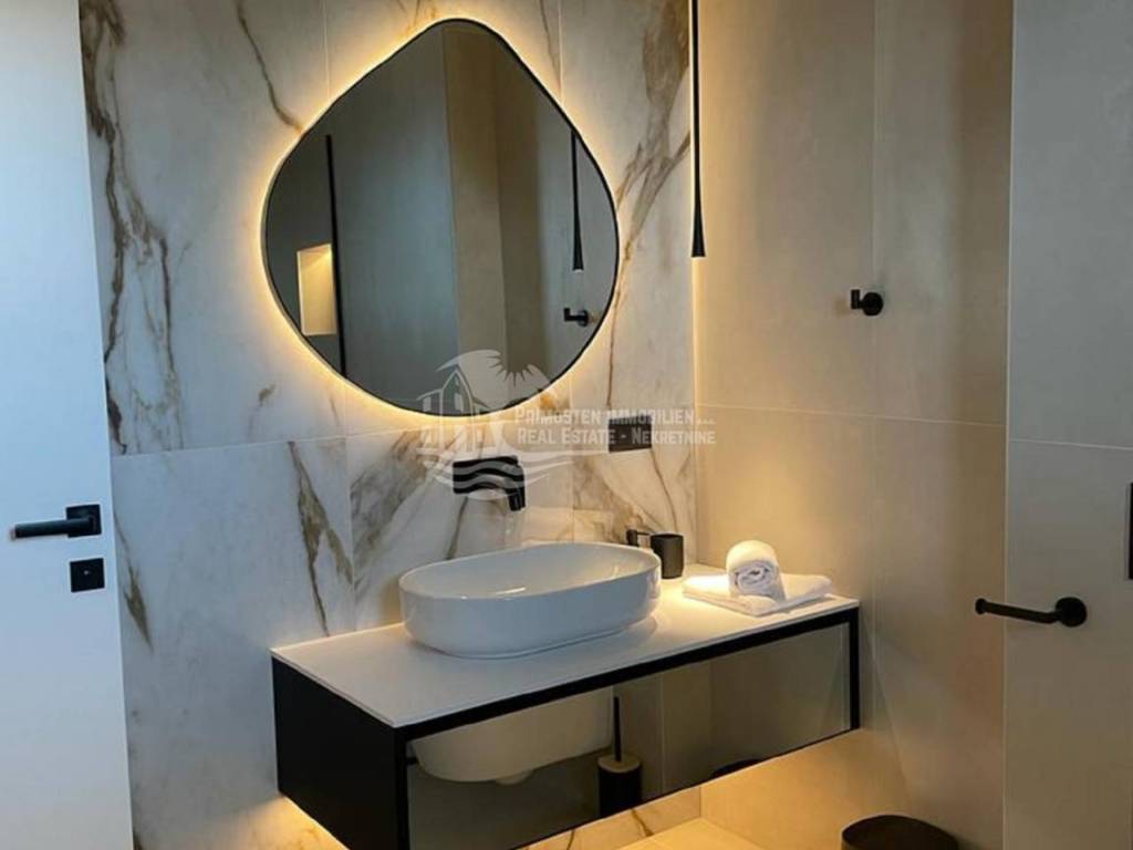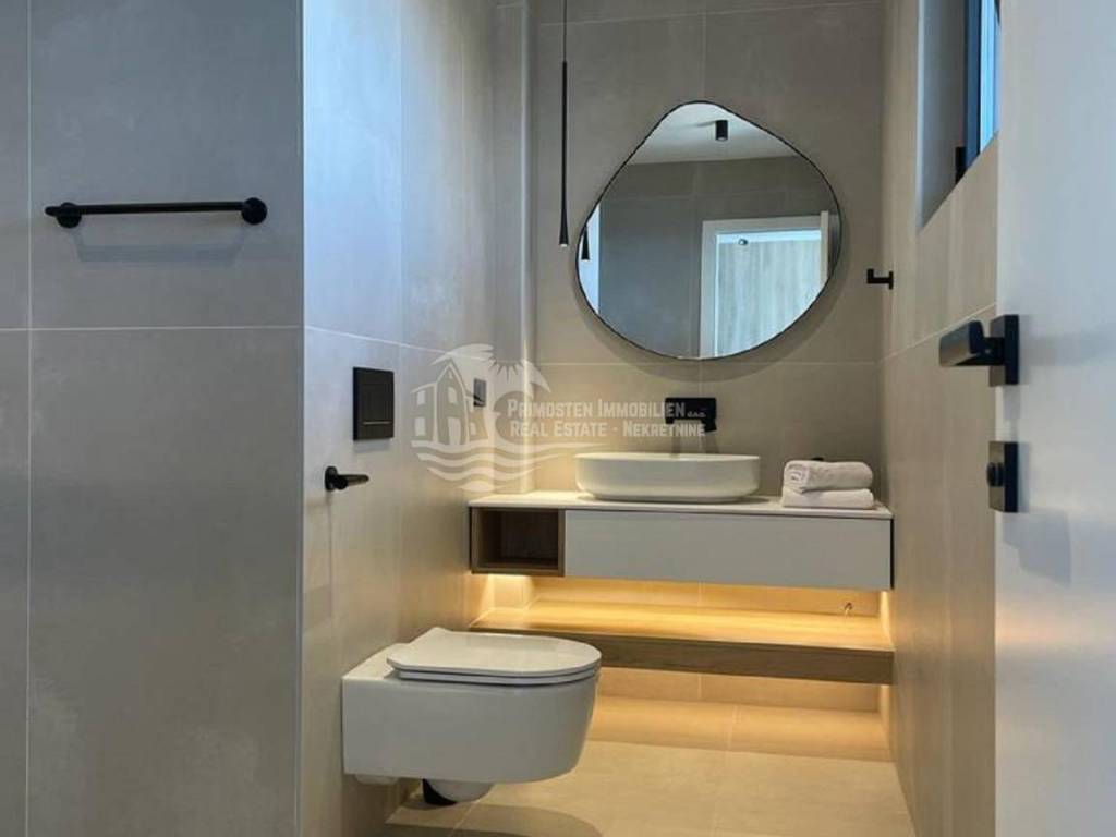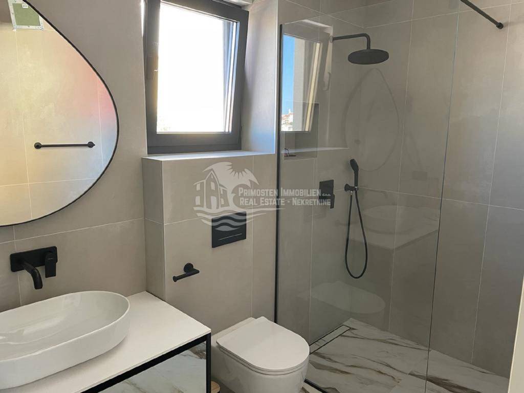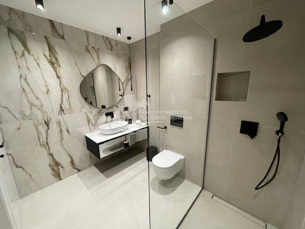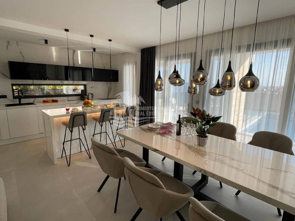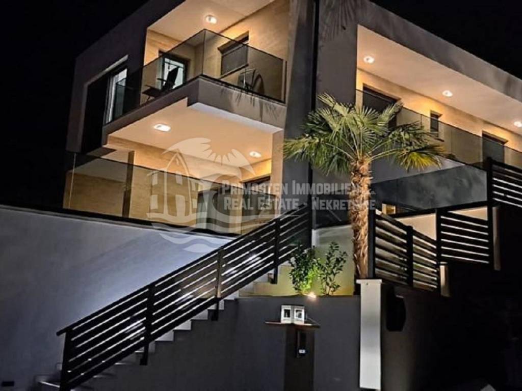 Posredujemo u prodaji ove elegantne nekretnine luksuznog uređenja koja se prostire na 344 kvadratnih metara i pruža maksimalni komfor i udobnost zahvaljujući prvoklasnim sadržajima i visokokvalitetnoj opremi. Ova moderna vila je izgrađena na parceli od 544 m2 u Okrugu gornjem u trećem redu do mora. Vila je organizirana na tri etaže. Na prizemlju se nalazi prostrani dnevni boravak, blagovaonica i kuhinja, WC, ostava i jedna spavaća soba sa kupaonicom. Iz dnevnog dijela se izlazi na natkrivenu terasu gdje se nalazi grijani bazen i sunčalište gdje možete uživati u predivnom pogledu na more i spektakularnim zalascima sunca. Unutarnjim stepenicama vile se dolazi na prvi kat gdje su smještene tri spavaće sobe od kojih svaka ima pripadajuću kupaonicu te balkon s otvorenim pogledom na more. U suterenu su smještene garaža, strojarnica bazena, fitness, sauna, praonica i kupaonica. Vila se prodaje kompletno namještena. Od tehničke opreme ima alarmni sustav, portafon, podno grijanje u cijeloj kući, sve prostorije su klimatizirane i građena je prema najnovijim standardima gradnje. Vila ima garažu i parking nekoliko automobila.