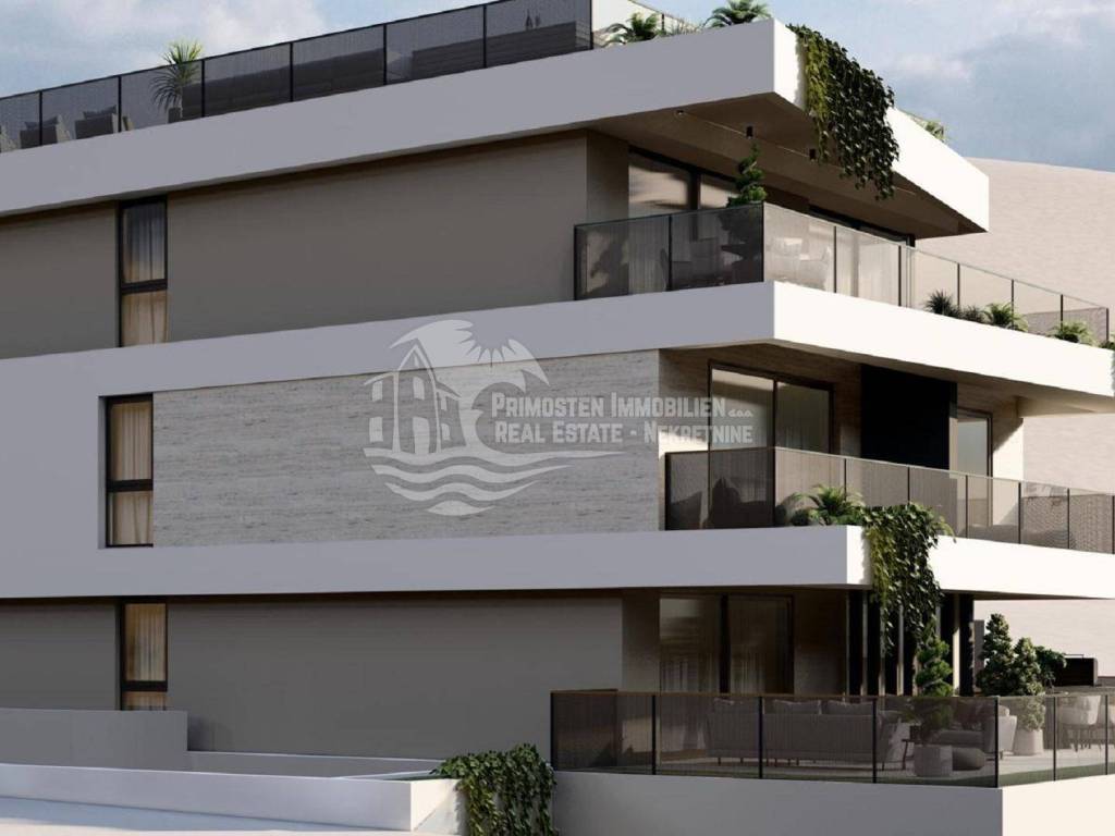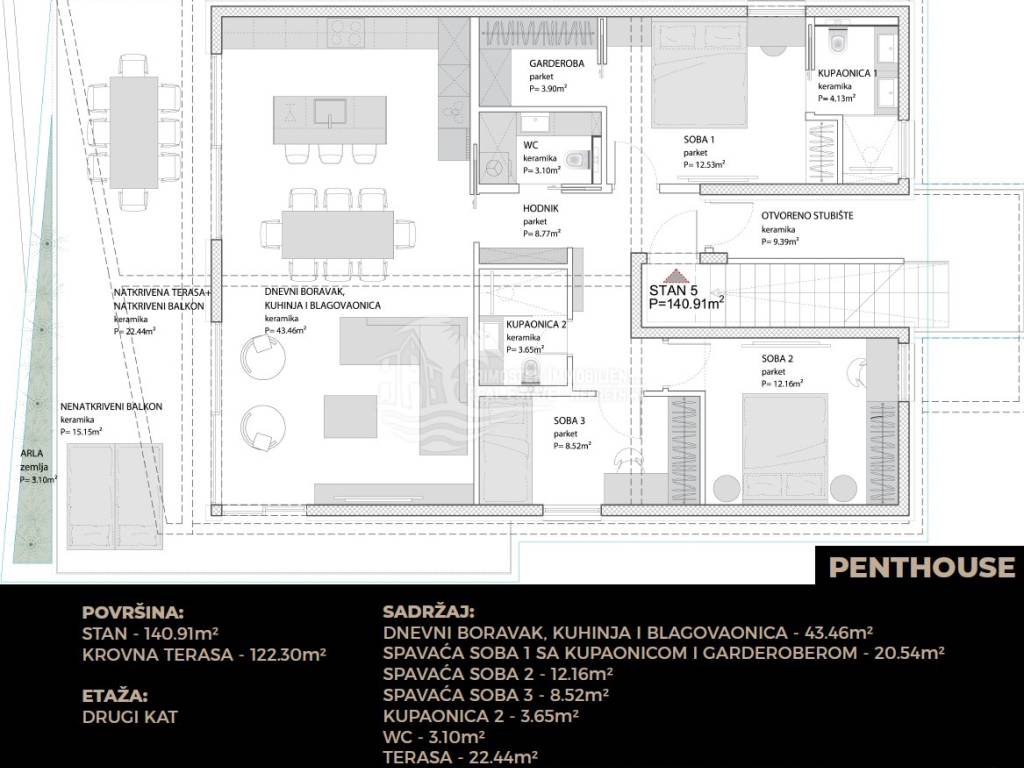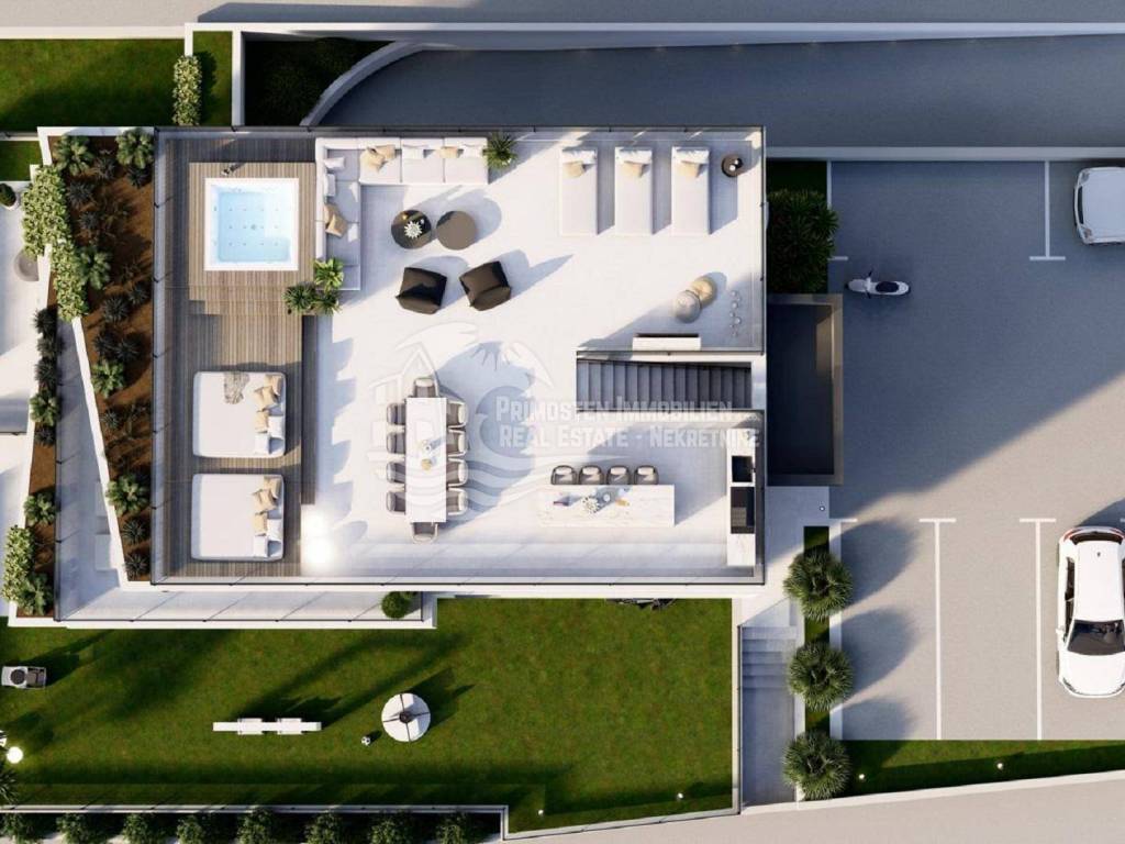 SENZACIONALNA PONUDA! Posredujemo u prodaji Penthousea koji se nalazi na drugom katu moderne zgrade u izgradnji koja se sastoji od 5 stambenih jedinica. Ova zgrada se nalazi na odličnoj lokaciji blizu svih turističkih sadržaja i udaljena 500 m od mora. Stan S5 se sastoji od dnevnog boravka, kuhinje i blagovaonice, tri spavaće sobe, dvije, kupaonice, WC-a i hodnika. Jedna od spavaćih soba je Master soba sa svojom vlastitom kupaonicom i garderobom. Iz dnevnog dijela se izlazi na prostranu terasu. Stanu pripada i krovna terasa od 122,30 m2, dva vanjska parkirna mjesta i jedno garažno mjesto. Zgrada se radi prema najnovijim standardima gradnje, u gradnji su koristeni isključivo materijali 1 klase, pločice velikih formata, spušteni stropovi s ugradbenom rasvjetom te moderne sanitarije. Stanovi će biti kompletno klimatizirani, te će biti postavljeno podno grijanje. Postoji mogućnost kupnje garažnog parkirnog mjesta. Planirani zavšetak radova je 2025. Zadivljujuća lokacija u blizini mora i plaže, kvalitetna gradnja, spektakularan pogled na more iz gotovo svakog kuta, blizina međunarodne zračne luke Split, blizina Šibenika, Trogira i Splita koji su uvršteni na popis svjetske baštine UNESCO-a, te blizina nekoliko marina neke su od predosti ovog Penthousea.