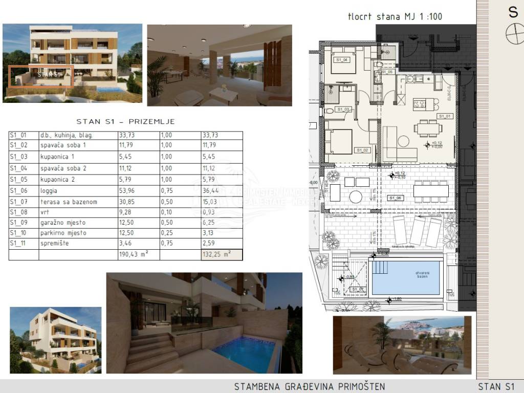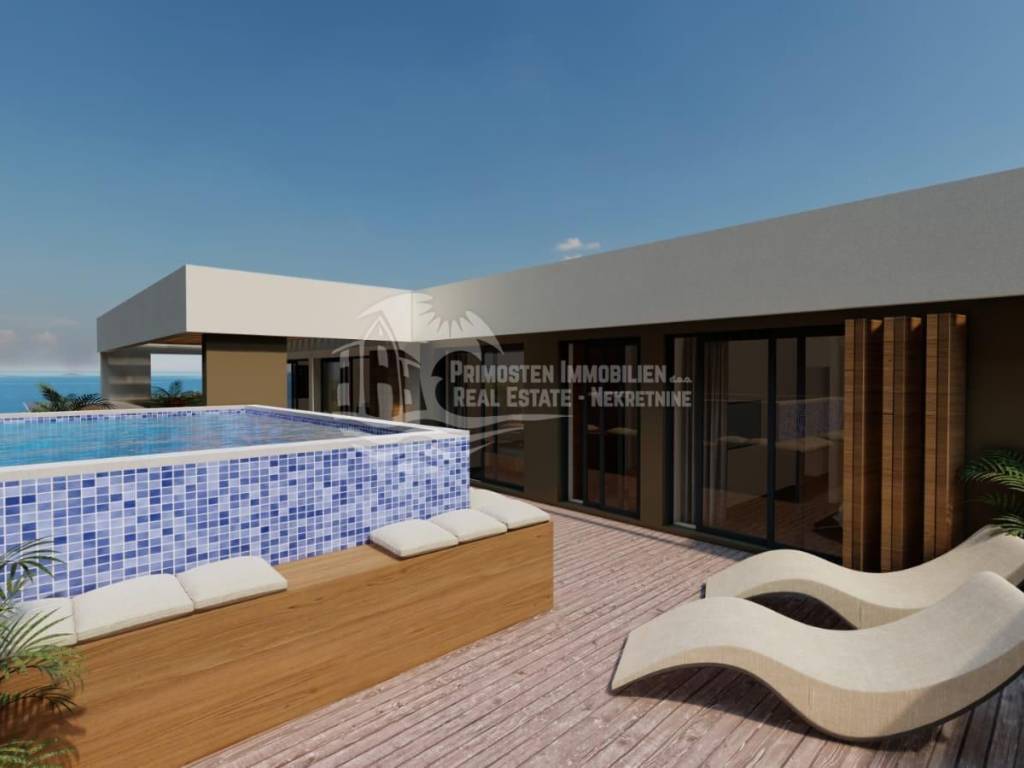 JEDINSTVENA PONUDA! Na prodaju je stan S1 koji se nalazi u prizemlju zgrade koja je trenutno u izgradnji i sastoji se od 7 stambenih jedinica. Zgrada se nalazi na iznimno dobroj lokaciji blizu svih turističkih sadržaja, te blizu prekrasnih primoštenskih plaža. Udaljenost do mora je cca 400m. Ovaj luksuzni stan ima stambenu površinu od 132,25 m2 sa koeficijentima terase, vrta i parkirnih mjesta. Stan se sastoji od dnevnog boravka, kuhinje i blagovaonice (33,73 m2), dvije spavaće sobe (11,79 m2 i 11,12 m2) i dvije kupaonice ( 5,45 m2 i 5,79 m2). Iz dnevnog dijela se izlazi na loggiu od 53,96 m2. Osim loggie stanu pripada prostrana terasa sa bazenom i vrt, jedno garažno parkirno mjesto, jedno vanjsko parkirno mjesto i spremište. Svi stanovi će biti opremljeni protuprovalnim vratima dok će sva unutrašnja vrata u stanovima biti 2,45 m visine.