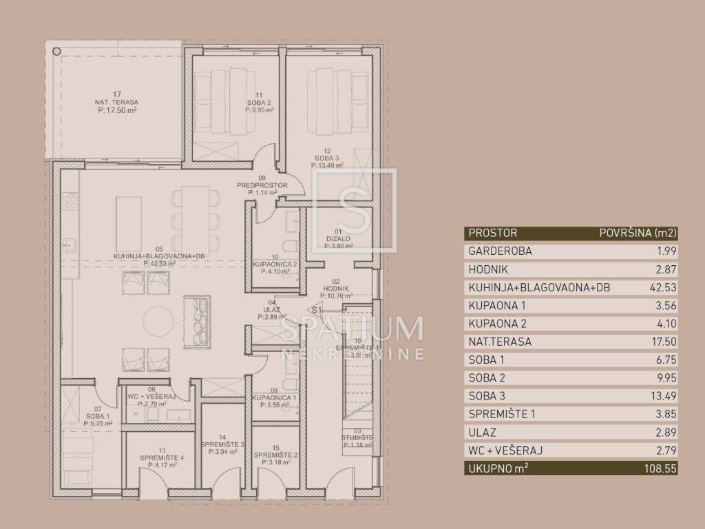 Ovaj prostrani stan ukupne površine 108 m² odlikuje se iznimno funkcionalnim rasporedom te dodatnom prednošću – privatnim vrtom od čak 240 m², koji omogućuje jedinstveni životni doživljaj na otvorenom. Sastoji se od ulaznog prostora, garderobe, hodnika, tri spavaće sobe, i dvije moderno uređene kupaonice, dodatnog WC-a s vešerajem te spremišta. Središnji prostor stana čini veliki i svijetli dnevni boravak povezan s kuhinjom i blagovaonicom iz kojeg se izlazi na natkrivenu terasu od 17,50 m² – savršeno mjesto za opuštanje, druženja ili uživanje u pogledu na vaš privatni vrt. Ispred zgrade nalaze se dva parkirna mjesta.