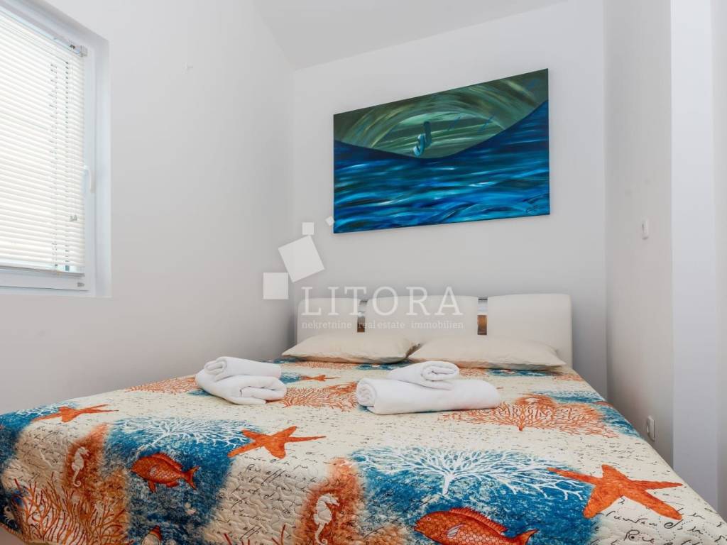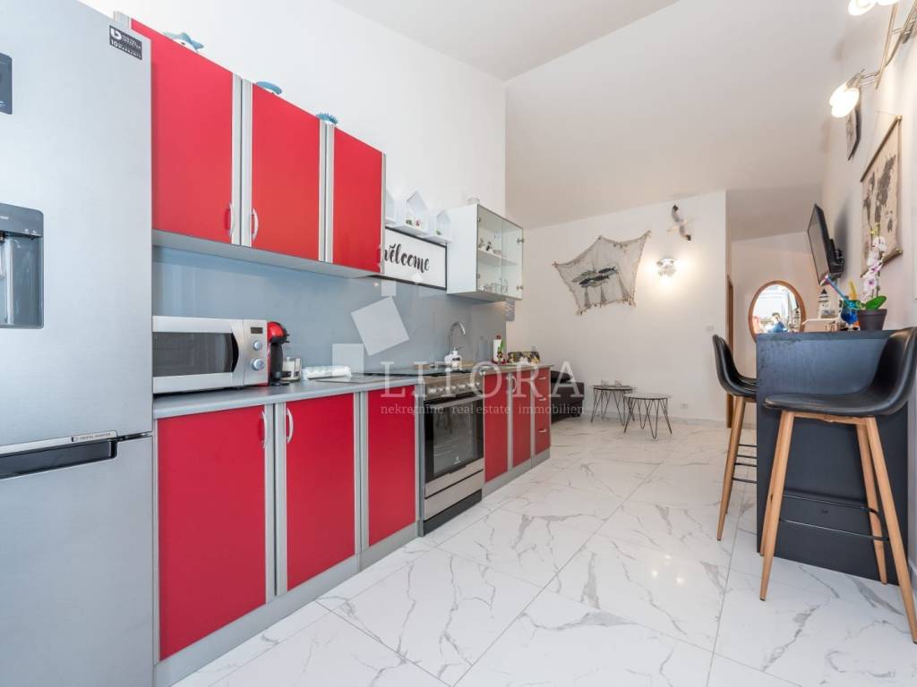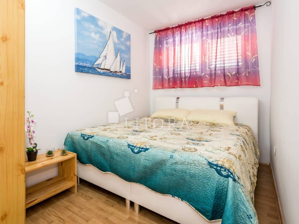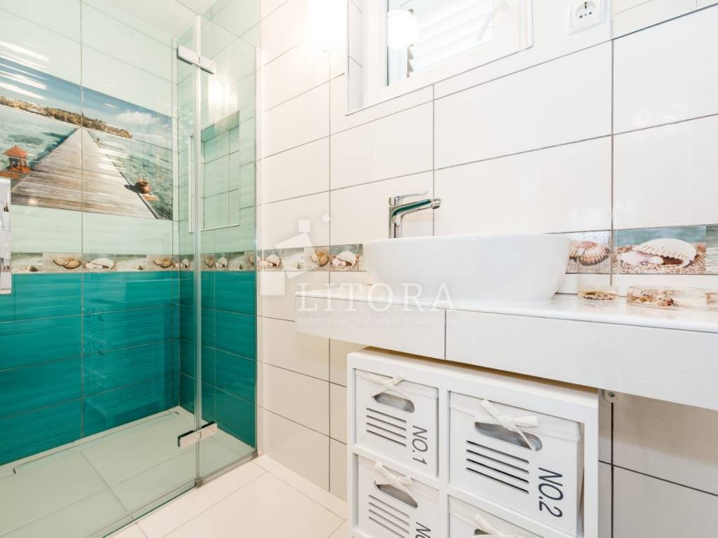 Jadrija, mirno okruženje, 3. red do plaže. Obiteljska kuća sa 99,35m2 korisne površine. Kuća je dvojni objekt na dvije etaže s dva zasebna apartmana. Kuća je orijentirana prema jugoistoku. Sastoji se od dvosobnog apartmana u prizemlju (dvije spavaće sobe, kupaonica, kuhinja s dnevnim boravkom) s natkrivenom terasom, spremištem i ostavom, te dodatnog dvosobnog apartmana u visokom potkrovlju (kuhinja s dnevnim boravkom, hodnik, dvije spavaće sobe i kupaonica) s ostakljenom terasom s pogledom na more. Kuća je renovirana 2016. godine, a novi krov postavljen je 2021. godine. Sagrađena je na parceli površine 117 m² te ima jedno popločano parkirno mjesto. Dvorište je u potpunosti ograđeno, a etaže su povezane vanjskim stubištem. U dvorištu se nalaze ozidani roštilj i vanjski tuš. Do kuće je moguć pristup osobnim vozilom, a udaljenost od plaže iznosi 120 m. Kuća je u potpunosti namještena, a namještaj je uključen u cijenu nekretnine.