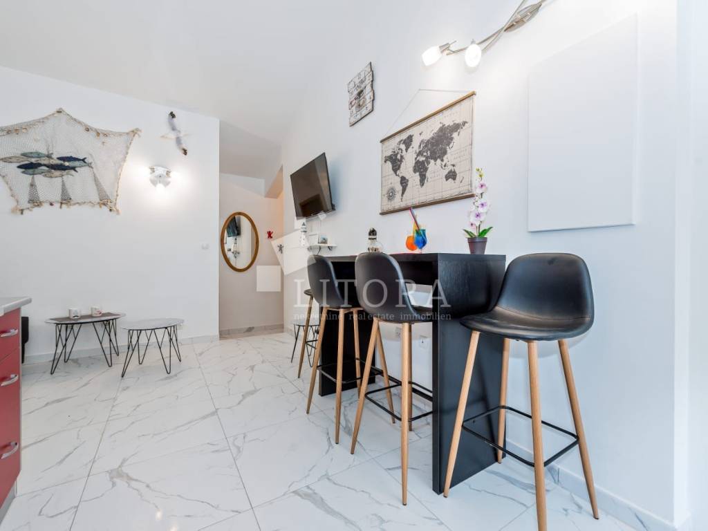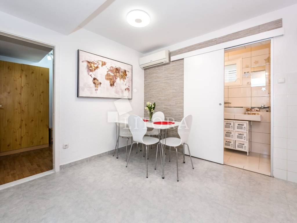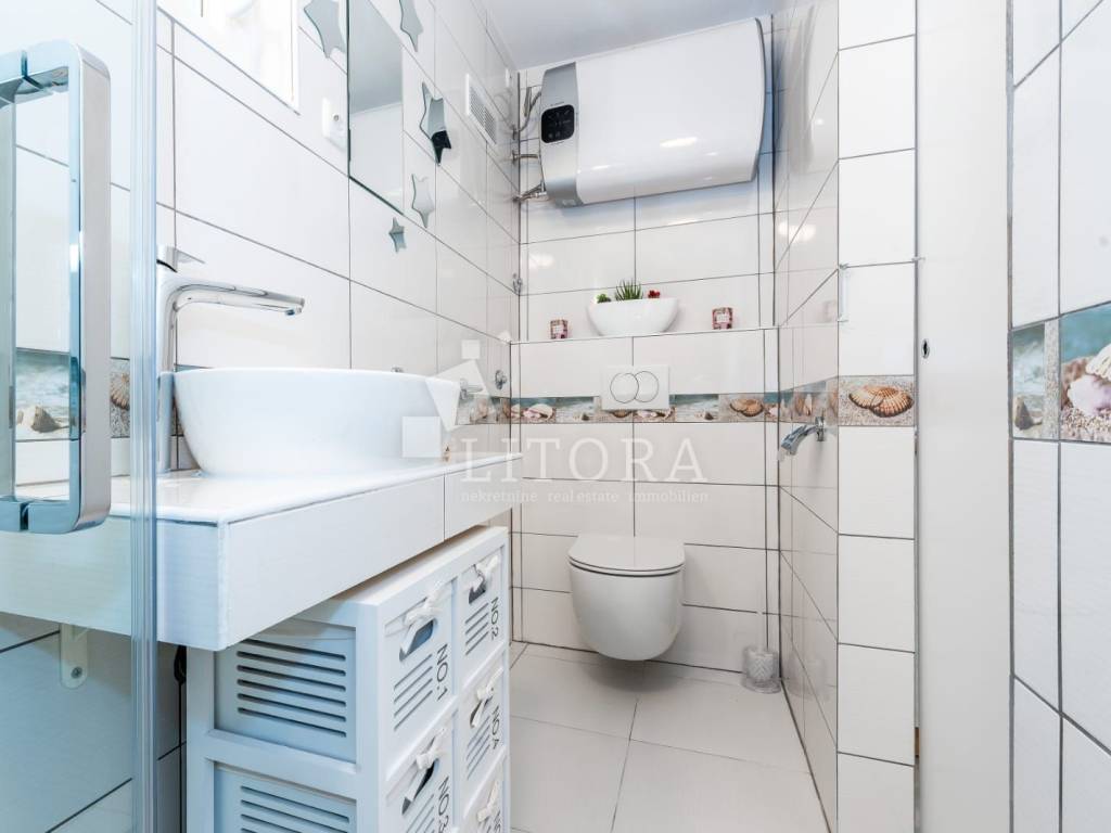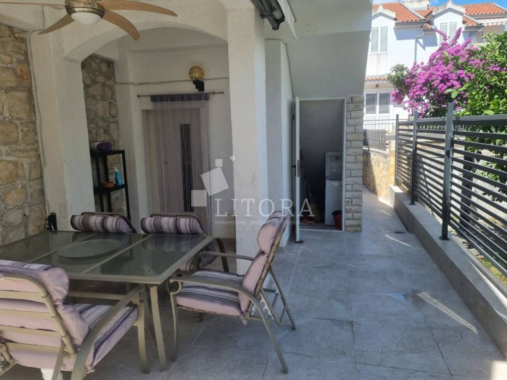 Jadrija, mirno okruženje, 3. red do plaže. Obiteljska kuća sa 99,35m2 korisne površine. Kuća je dvojni objekt na dvije etaže s dva zasebna apartmana. Kuća je orijentirana prema jugoistoku. Sastoji se od dvosobnog apartmana u prizemlju (dvije spavaće sobe, kupaonica, kuhinja s dnevnim boravkom) s natkrivenom terasom, spremištem i ostavom, te dodatnog dvosobnog apartmana u visokom potkrovlju (kuhinja s dnevnim boravkom, hodnik, dvije spavaće sobe i kupaonica) s ostakljenom terasom s pogledom na more. Kuća je renovirana 2016. godine, a novi krov postavljen je 2021. godine. Sagrađena je na parceli površine 117 m² te ima jedno popločano parkirno mjesto. Dvorište je u potpunosti ograđeno, a etaže su povezane vanjskim stubištem. U dvorištu se nalaze ozidani roštilj i vanjski tuš. Do kuće je moguć pristup osobnim vozilom, a udaljenost od plaže iznosi 120 m. Kuća je u potpunosti namještena, a namještaj je uključen u cijenu nekretnine.