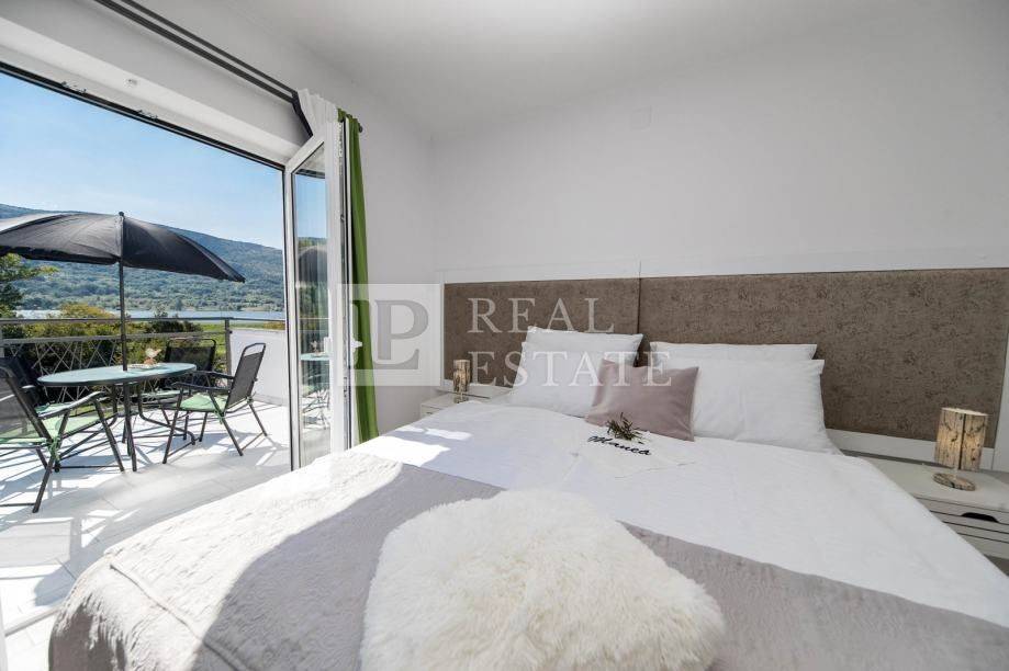 Na gornjoj etaži smjestile su se još tri spavaće sobe s vlastitim kupaonicama i terasa s koje se pruža predivan pogled na jezero.