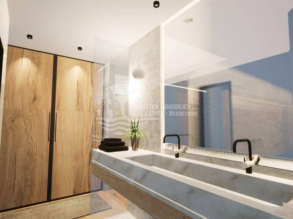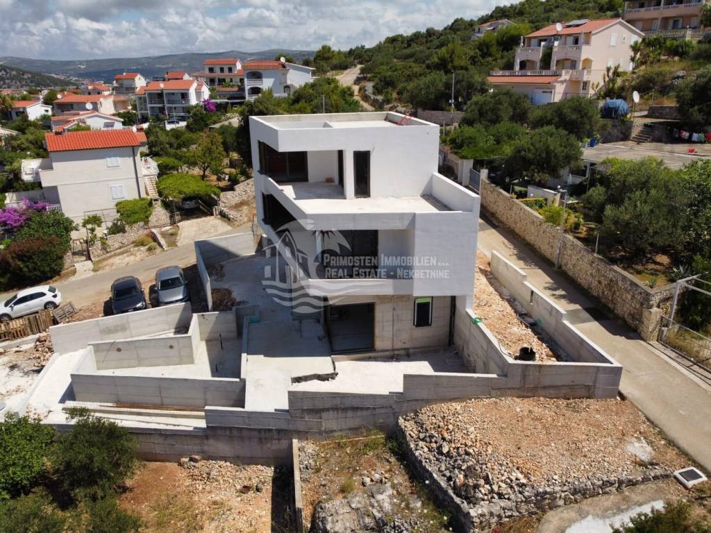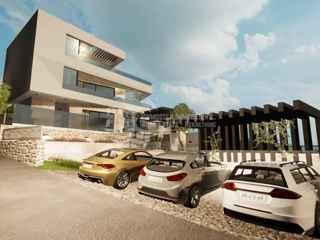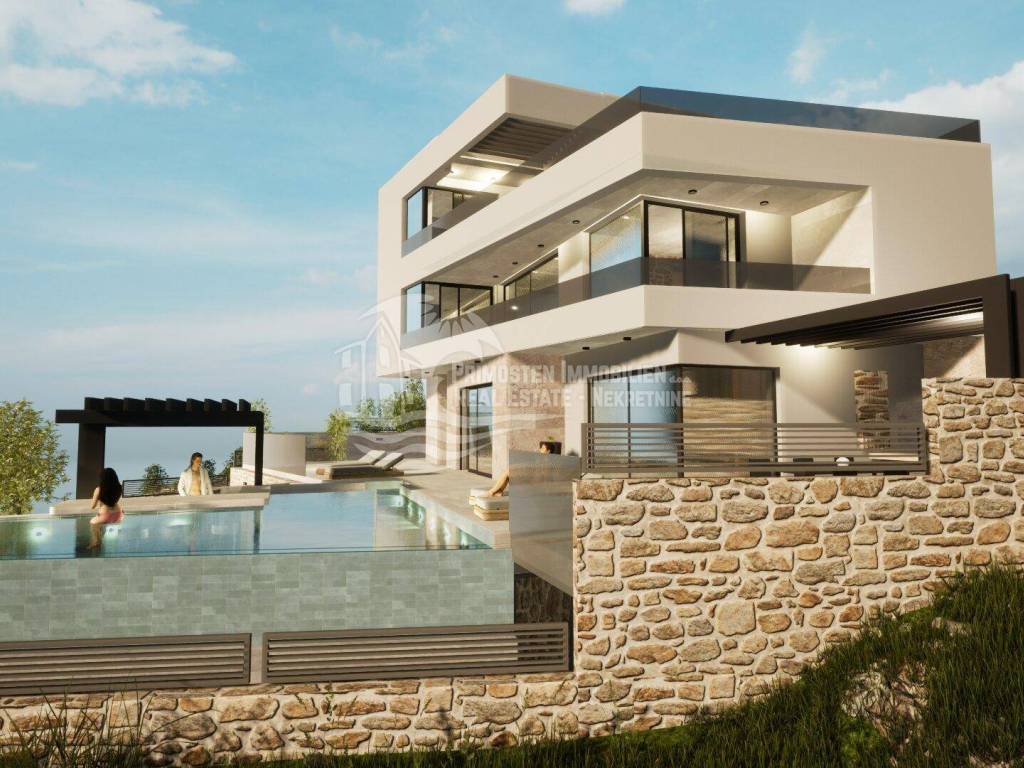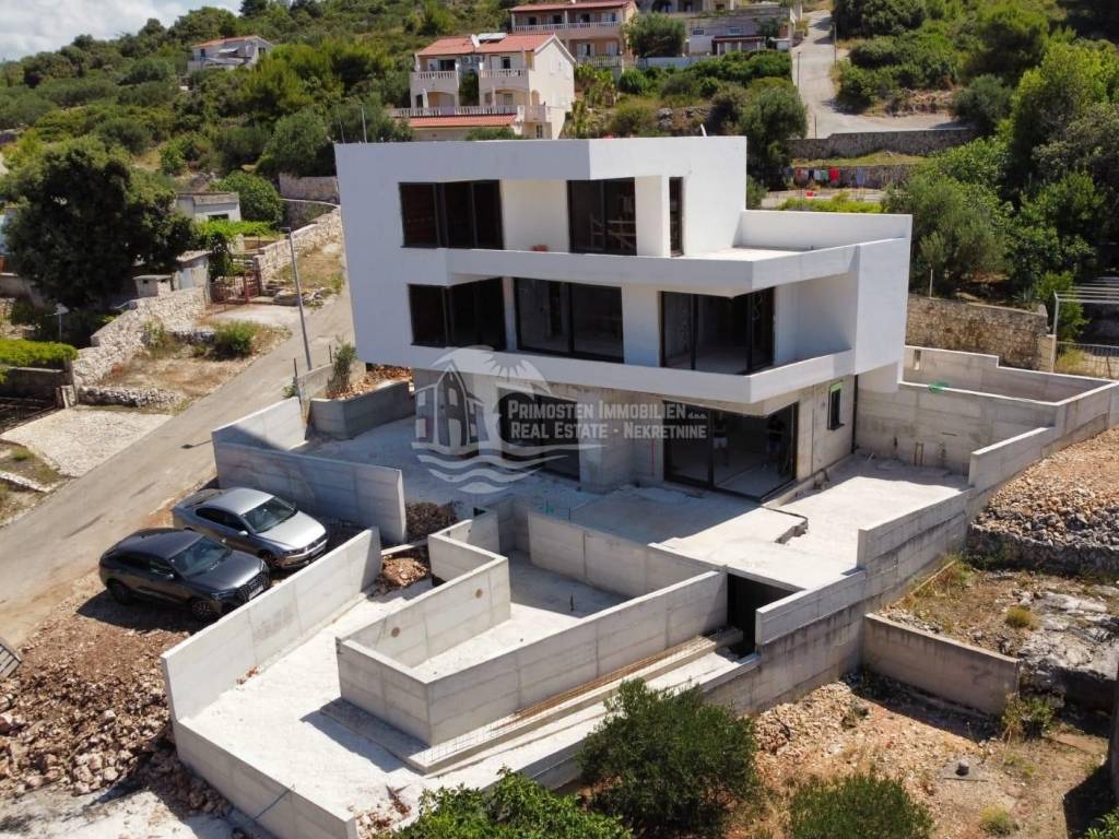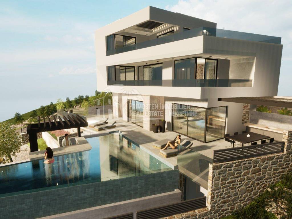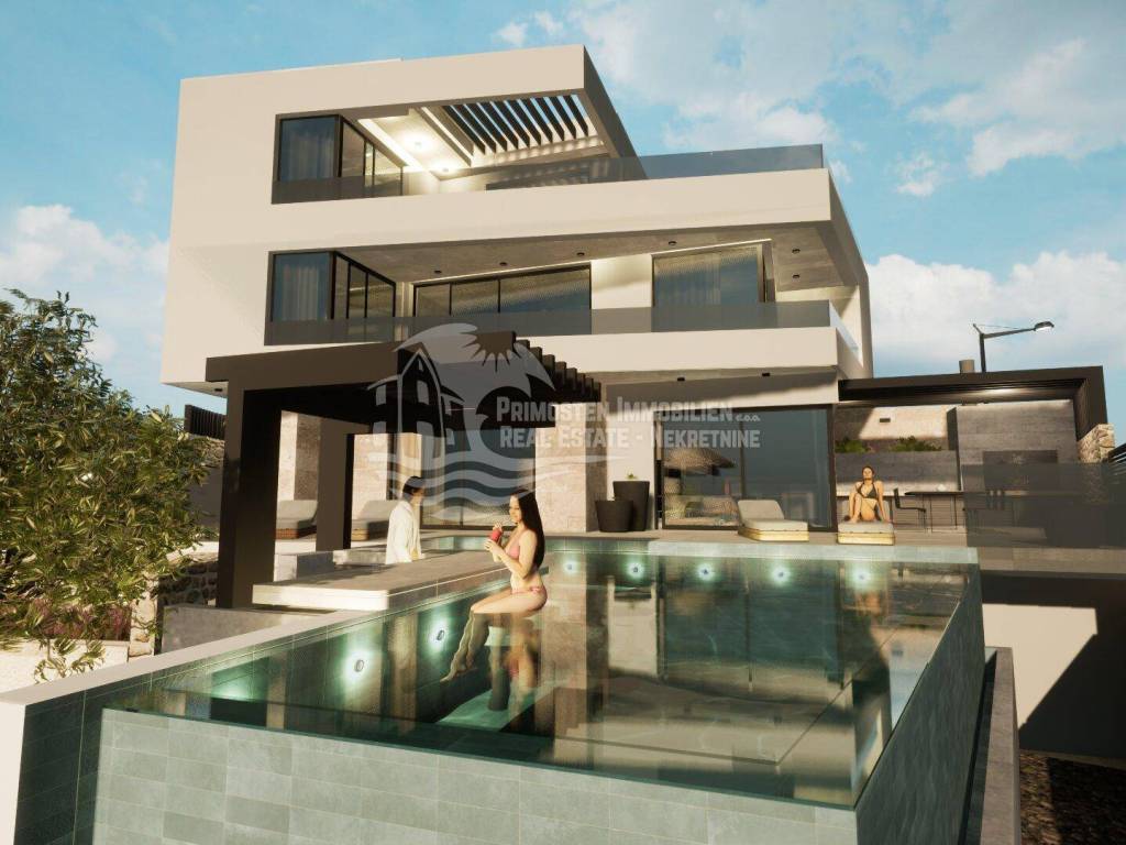 Elegantna vila u izgradnji koja se nalazi na osunčanoj jugo-istočnoj strani modernog rasporeda prostorija udaljena je samo 100 m od mora, te se nalazi na iznimno dobroj lokaciji. Površina parcele je 554 m², a stambena površina vile je 229,25 m². Vila se proteže na tri etaže. Na prizemlju se nalazi predsoblje s garderobom, prostrani dnevni dio sa blagovaonicom i kuhinjom od 55,39 m², praonicom i kupaonicom. Iz dnevnog dijela se izlazi se na djelomično natkrivenu terasu gdje se nalazi preljevni bazen i ljetna kuhinja sa roštiljem. Unutarnjim stubištem dolazi se na prvu etažu gdje se nalazi otvorena galerija od 15,86 m² koja se može koristiti kao radni prostor ili kao Lounge, dvije spavaće sobe s kupaonicom i garderobom i odvojeni WC. Na drugoj etaži se nalazi i dodatna galerija od 7,40 m², spavaća soba sa en-suite kupaonicom i garderobom, odvojeni wc, te natkrivena i otvorena prostrana terasa od 44,13 m² sa jacuzzijem. Ova vila će imati kompletnu tehničku opremu koja uključuje podno grijanje, pametnu kuću. Ispred vile se nalaze četiri parkirna mjesta.