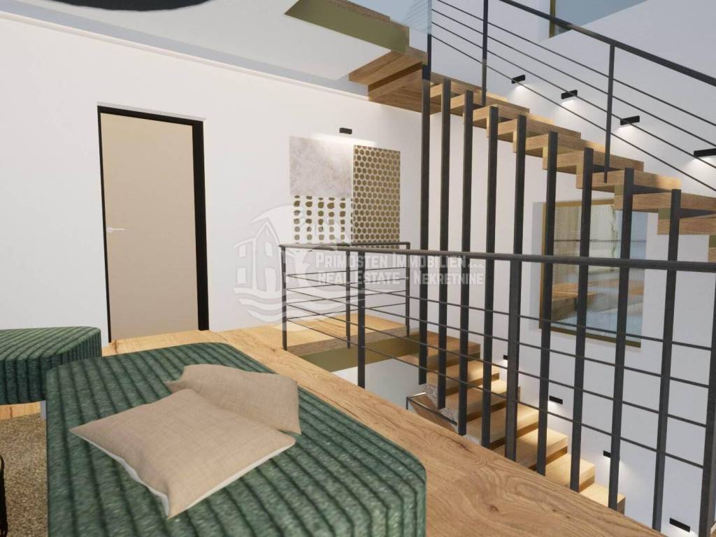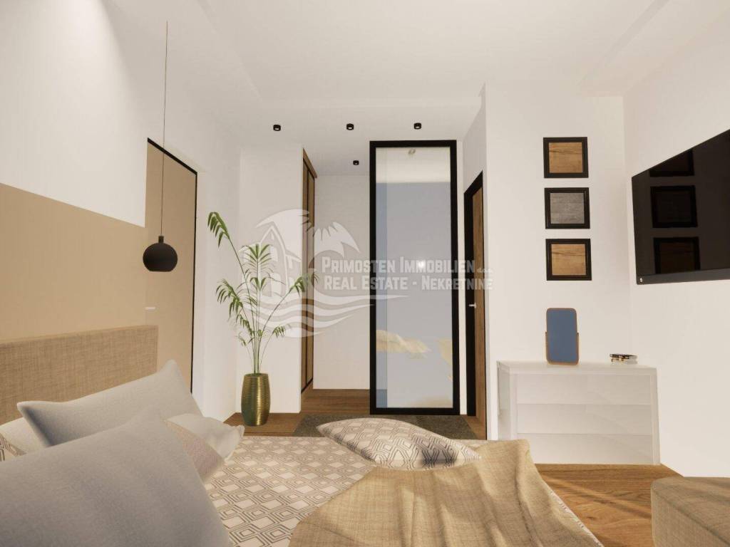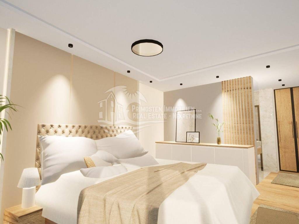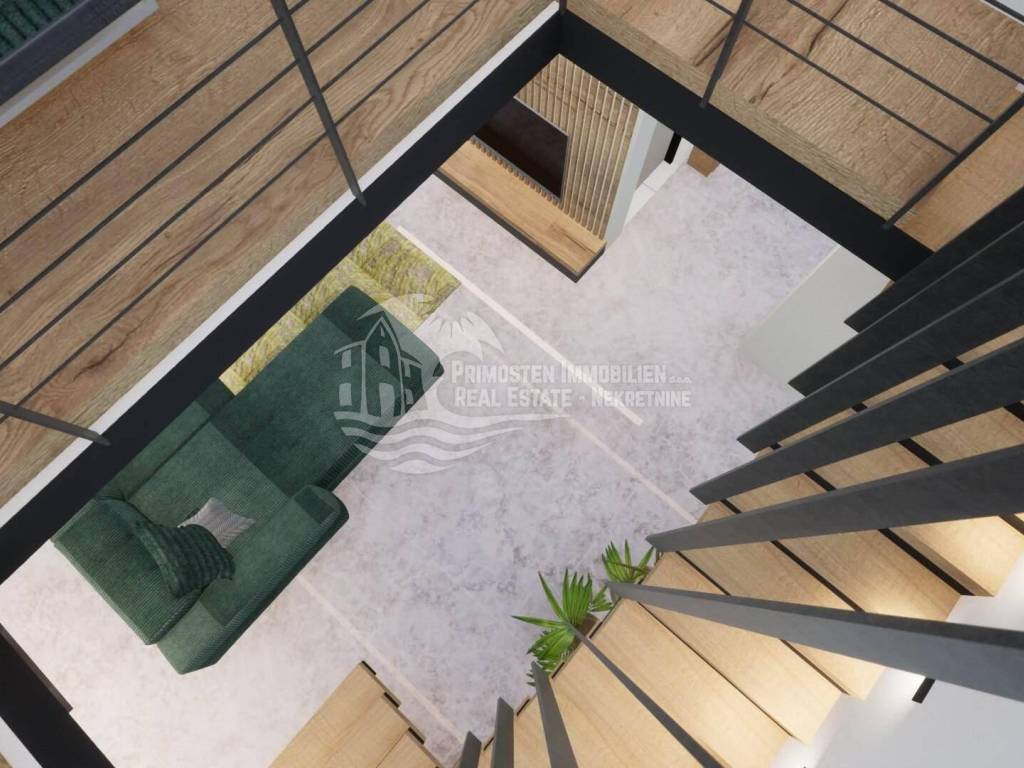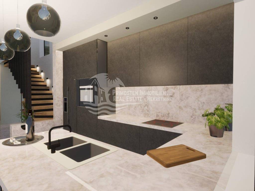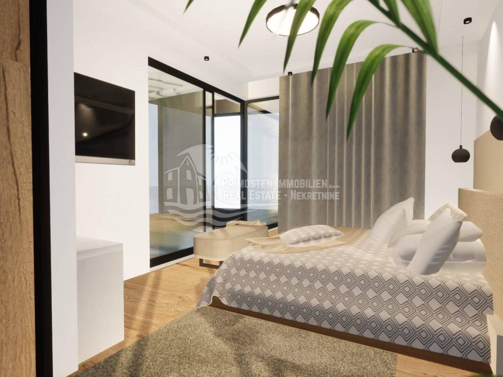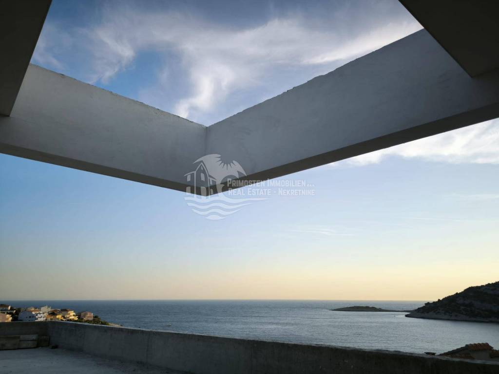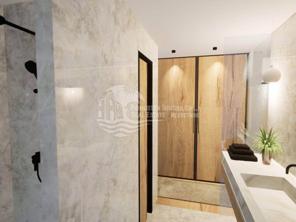 Elegantna vila u izgradnji koja se nalazi na osunčanoj jugo-istočnoj strani modernog rasporeda prostorija udaljena je samo 100 m od mora, te se nalazi na iznimno dobroj lokaciji. Površina parcele je 554 m², a stambena površina vile je 229,25 m². Vila se proteže na tri etaže. Na prizemlju se nalazi predsoblje s garderobom, prostrani dnevni dio sa blagovaonicom i kuhinjom od 55,39 m², praonicom i kupaonicom. Iz dnevnog dijela se izlazi se na djelomično natkrivenu terasu gdje se nalazi preljevni bazen i ljetna kuhinja sa roštiljem. Unutarnjim stubištem dolazi se na prvu etažu gdje se nalazi otvorena galerija od 15,86 m² koja se može koristiti kao radni prostor ili kao Lounge, dvije spavaće sobe s kupaonicom i garderobom i odvojeni WC. Na drugoj etaži se nalazi i dodatna galerija od 7,40 m², spavaća soba sa en-suite kupaonicom i garderobom, odvojeni wc, te natkrivena i otvorena prostrana terasa od 44,13 m² sa jacuzzijem. Ova vila će imati kompletnu tehničku opremu koja uključuje podno grijanje, pametnu kuću. Ispred vile se nalaze četiri parkirna mjesta.