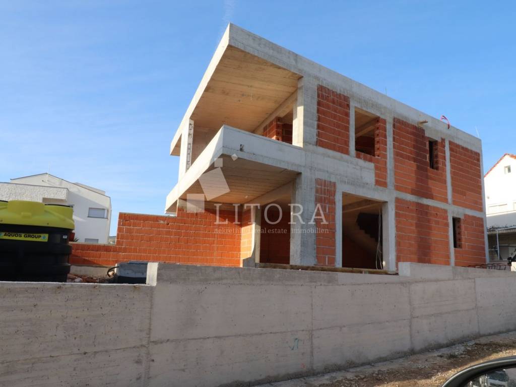 Vodice – obiteljska kuća moderne arhitekture na mirnoj lokaciji s dvorištem i bazenom. Kuća se sastoji od dvije etaže (prizemlje + 1. kat), dvojni je objekt, s ukupnom korisnom površinom od 96,93 m². Ima veliku terasu / sunčalište, vanjski bazen od 18m2 te prostrani parkirni prostor za dva vozila. Prizemlje se sastoji od predsoblja, gostinjskog WC-a te otvorenog dnevnog boravka s kuhinjom i blagovaonicom, s izlazom na terasu u sklopu koje se nalazi bazen. Na prvom katu kuće nalaze se dvije spavaće sobe, radna soba, kupaonice i terasa. Kuća je vrhunski opremljena: protuprovalna vrata, aluminijska stolarija s komarnicima i griljama, visokokvalitetne keramičke obloge te podno grijanje u dnevnom boravku i kupaonicama. Okućnica je u potpunosti ograđena. Nekretnina se nalazi na odličnoj lokaciji, 850 m od plaže Vruje i 650 m od centra grada.