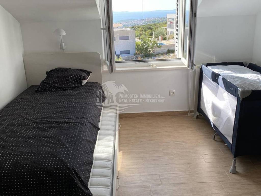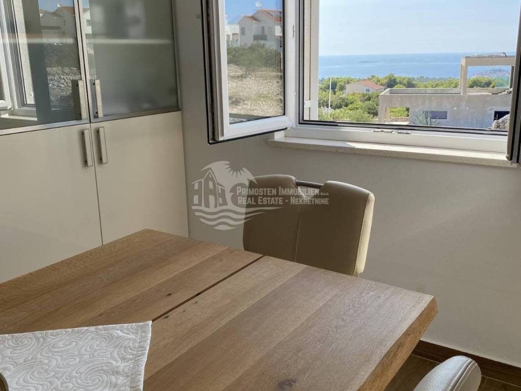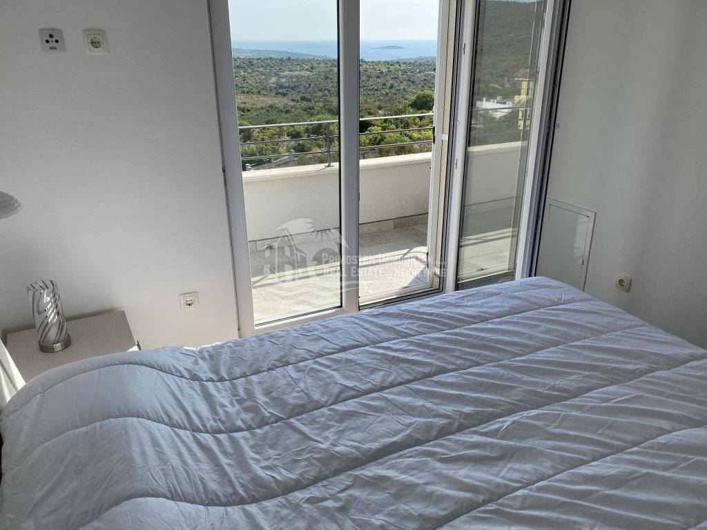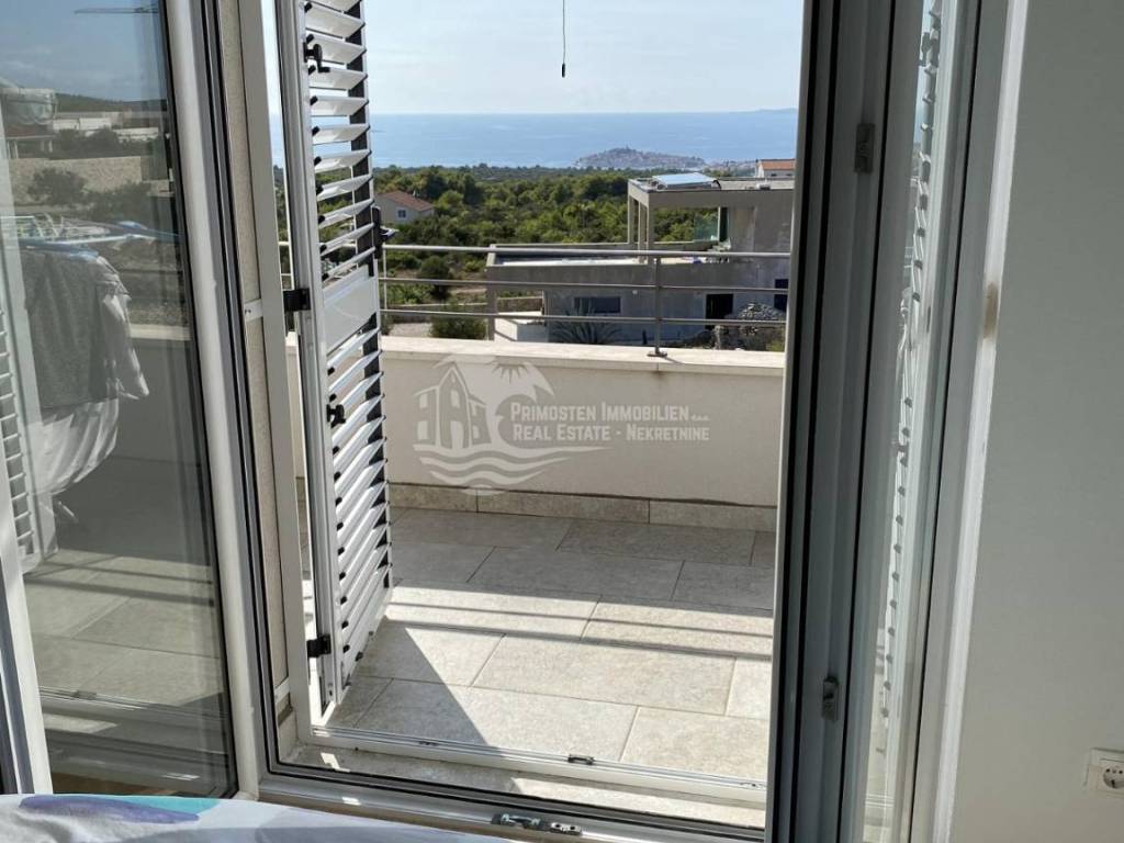 Posredujemo u prodaji kompletno namještenog dvoetažnog stana koji se nalazi u Primoštenu na prvom i drugom katu zgrade. Ovaj moderni i kompletno opremljeni stan ima stambenu površinu od 99,84m2 sa uračunatim koeficijentima. Stan se sastoji od dvije etaže. Na prvoj etaži nalazi se prostrani dnevni boravak, kuhinja i blagovaonica, kupaonica i ostava. Iz dnevnog dijela se izlazi na dvije natkrivene terase sa kojih se pruža prekrasan pogled na more. Unutrašnjim stubištem se dolazi do prve etaže gdje se nalaze kupaonica i 3 spavaće sobe od kojih dvije spavaće sobe imaju svoj vlastiti balkon. Stanu pripadaju dva vanjska parkirna mjesta. Stan je potpuno klimatiziran.