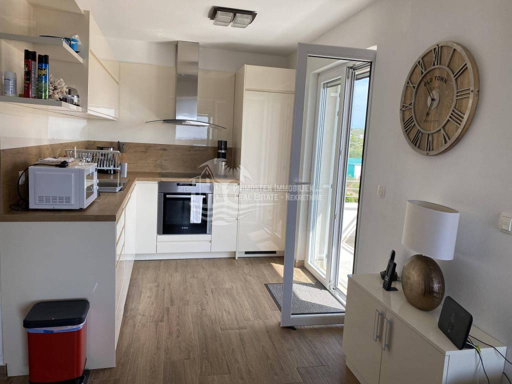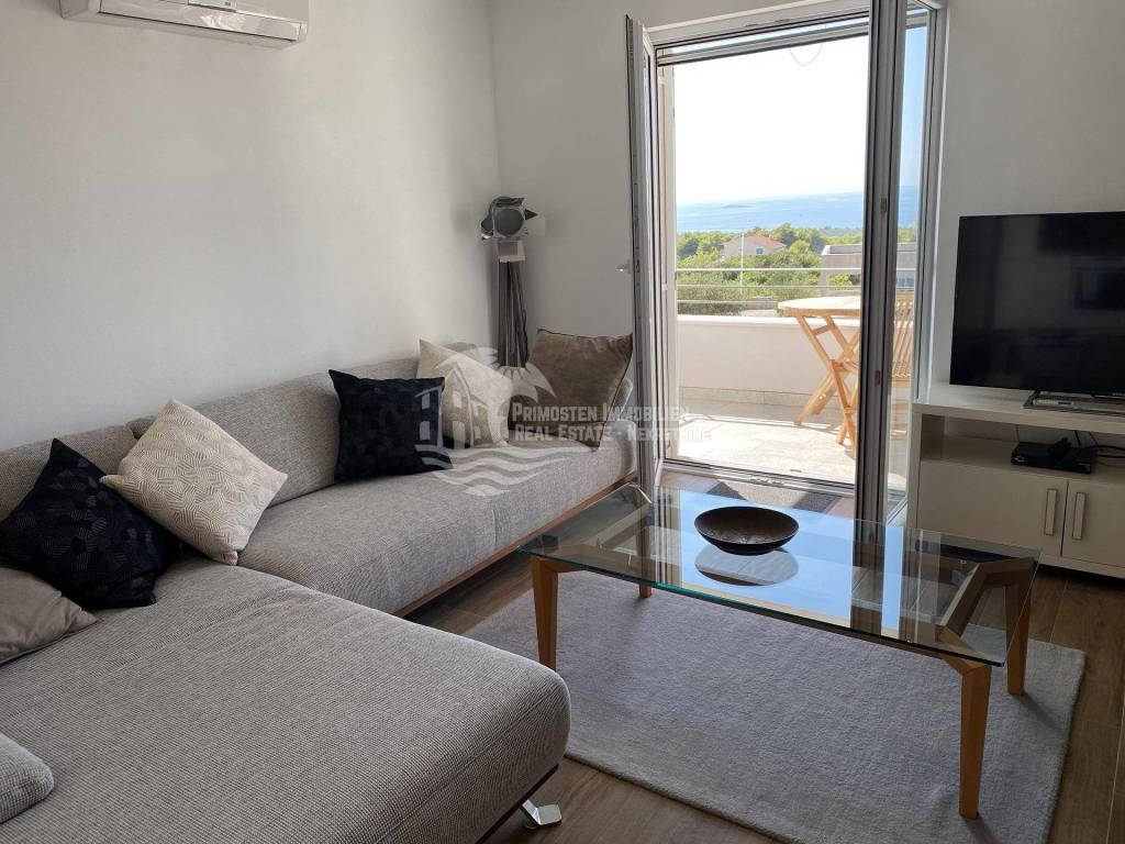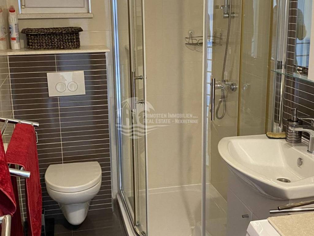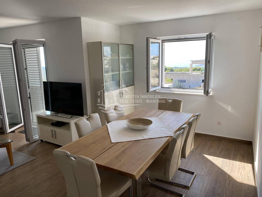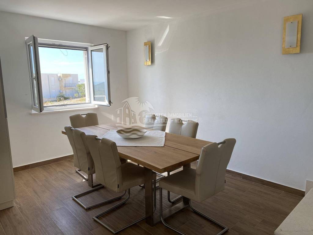 Posredujemo u prodaji kompletno namještenog dvoetažnog stana koji se nalazi u Primoštenu na prvom i drugom katu zgrade. Ovaj moderni i kompletno opremljeni stan ima stambenu površinu od 99,84m2 sa uračunatim koeficijentima. Stan se sastoji od dvije etaže. Na prvoj etaži nalazi se prostrani dnevni boravak, kuhinja i blagovaonica, kupaonica i ostava. Iz dnevnog dijela se izlazi na dvije natkrivene terase sa kojih se pruža prekrasan pogled na more. Unutrašnjim stubištem se dolazi do prve etaže gdje se nalaze kupaonica i 3 spavaće sobe od kojih dvije spavaće sobe imaju svoj vlastiti balkon. Stanu pripadaju dva vanjska parkirna mjesta. Stan je potpuno klimatiziran.