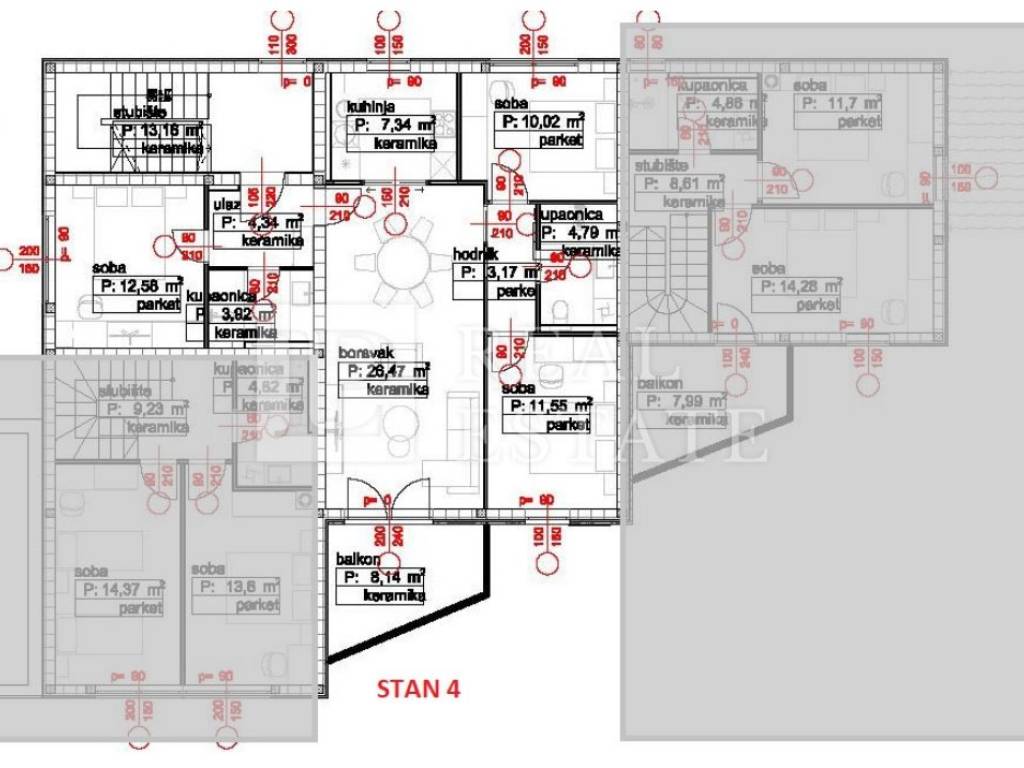 Stan S4 nalazi se na 1.katu, a sastoji se od hodnika, kuhinje s blagovaonom i dnevnog boravka, tri spavaće sobe, dvije kupaonice i balkona. Iz stana se pruža lijepi pogled na more.