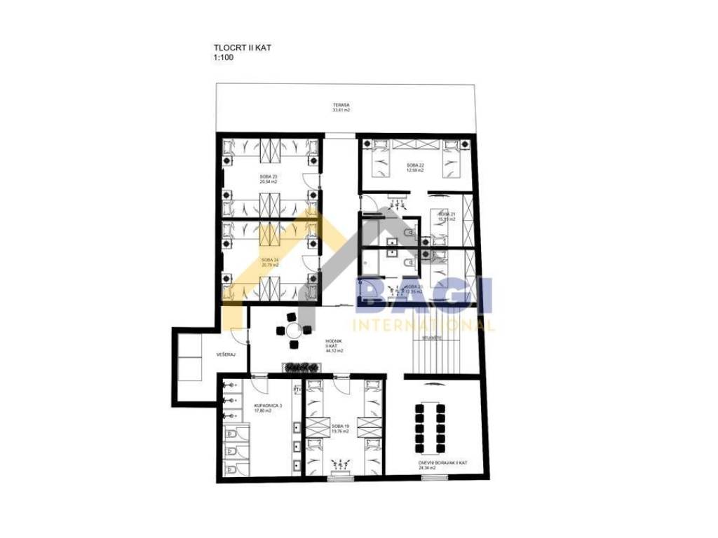 Svaka etaža raspolagat će sa kuhinjom i blagovaonicom/dnevnim boravkom. Unutar objekta u mogućnosti smo ponuditi 2 skupine soba • Sobe sa zajedničkim sanitarnim čvorom – pri čemu se poštovalo načelo gdje na najviše svakih 5 korisnika smještaja dolazi jedan tuš, wc i umivaonik • Sobe sa vlastitom kupaonicom (tuš+wc+umivaonik) Raspored soba može se vidjeti po tlocrtima u prilogu. Objekt je u postupku renovacije, ali na slikama mogu vidjeti vizuali budućeg izgleda prostora. Osim samog smještaja, prema potrebi u mogućnosti smo ponuditi i dodatne usluge: • Prijevoz do i od mjesta rada • Usluga pranja odjeće • Organiziranje obroka unutar objekta (doručak/večera) • Eventualne dodatne usluge prema zahtjevu za koje ćemo Vam rado dostaviti odvojenu ponudu. U slučaju uzimanja u najam kompletne etaže, u ovoj je fazi moguće napraviti prilagodbe prema zahtjevu korisnika. U prostor se prema zahtjevima korisnika mogu postaviti jednostruki kreveti ili kreveti na kat Osnovna cijena u kombinaciji s krevetima na kat iznosi 200€ + PDV Osim režijskih troškova cijena će uključivati i čišćenje soba i zajedničkih prostorija.