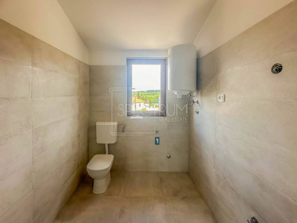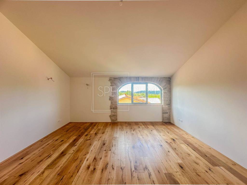 Stan se nalazi na 2.katu nedavno renovirane stambene zgrade. Površina stana iznosi 61.77 m2. Stan se sastoji od open space dnevnog boravka sa kuhinjom i blagovaonicom, spavaće sobe, još jedne sobe koja može poslužiti kao dodatna spavaća soba, kupaonice i hodnika. Iz dnevnog boravka se izlazi na terasu sa koje se pruža pogled na more i na Buje. Zbog visine stropova, postoji mogućnost ugradnje galerije u stanu. Stan se grije putem klima uređaja, postoji mogućnost i ugradnje peći na drva ili pelete, a napravljena je i priprema za centralno grijanje. Stan je renoviran kvalitetnim materijalima, kombinirajući moderne elemente sa tradicionalnim elementima, poput kamenih zidova. Iz stana se pruža lijepi pogled na Buje i na prirodu. Stan ima i vlastito parkirno mjesto koje se nalazi odmah pored ulaza u samu zgradu.