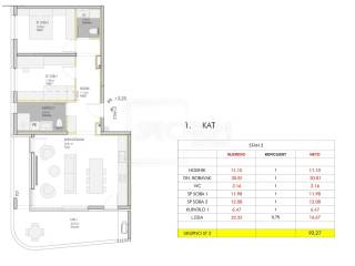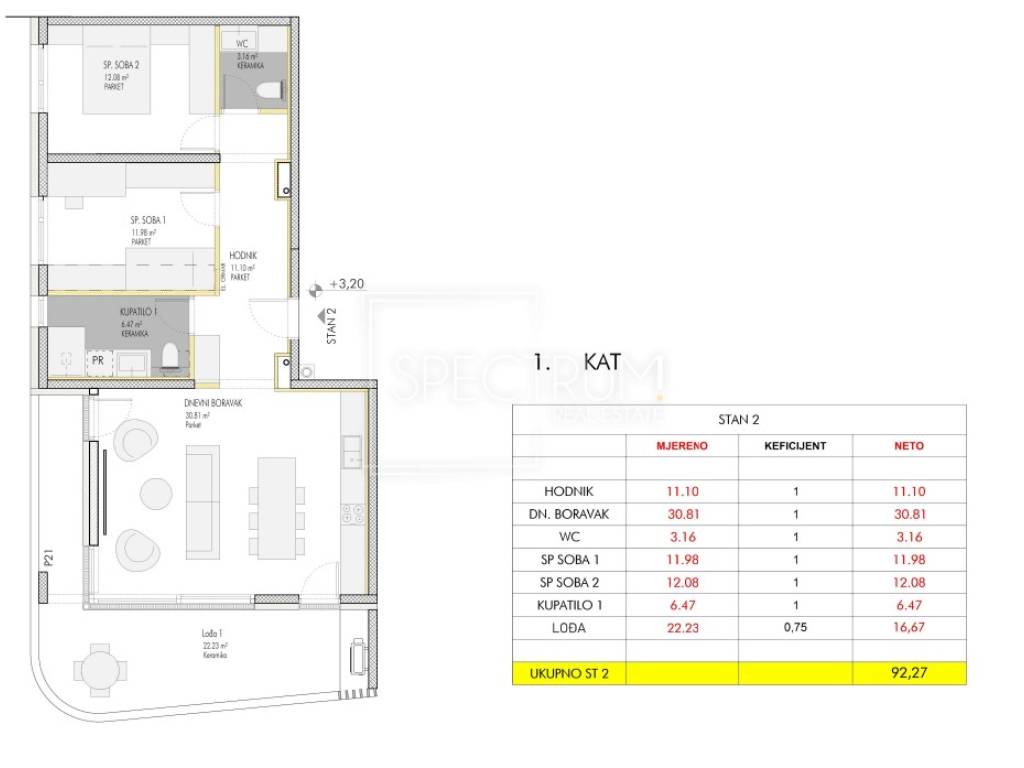 Stan se nalazi na 1.katu novoizgrađene stambene zgrade. Površina stana iznosi 92.27 m2. Stan se sastoji od open space dnevnog boravka sa kuhinjom i blagovaonicom, 2 spavaće sobe, kupaonice, wc-a, hodnika i loggie. Na loggiu se izlazi iz dnevnog boravka. Iz stana se pruža pogled na prirodu. Stan se grije putem podnog grijanja na dizalicu topline te klima uređaja. Stan se gradi vrlo kvalitetnim materijalima, od podova, sanitarija, ALU stolarije, protuprovalnih vrata. Zgrada ima i lift te nadzorne kamere. U vlasništvu stana je i parkirno mjesto sa električnim priključkom za punjenje električnih vozila.