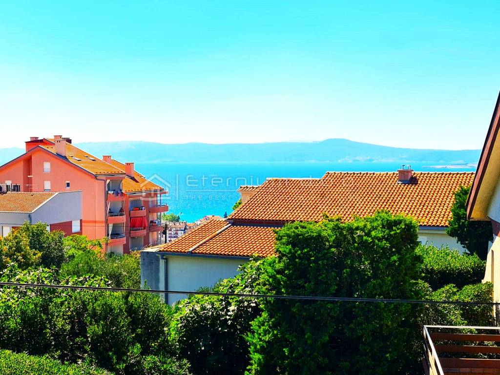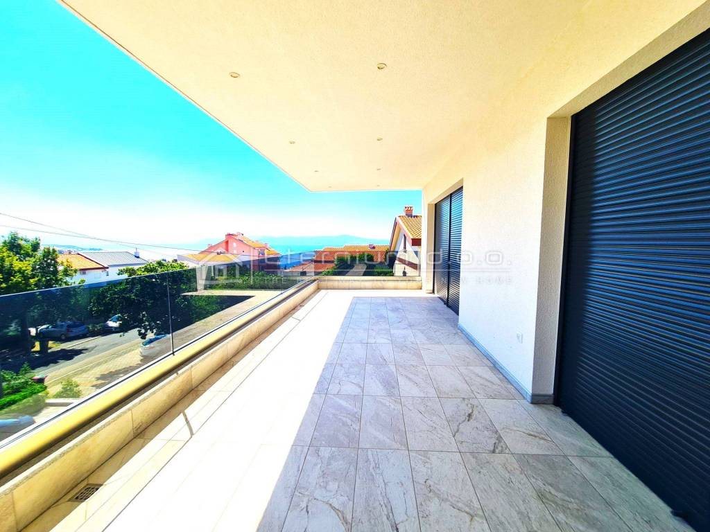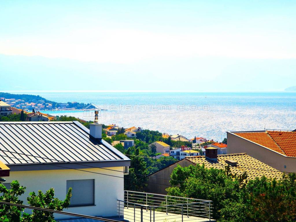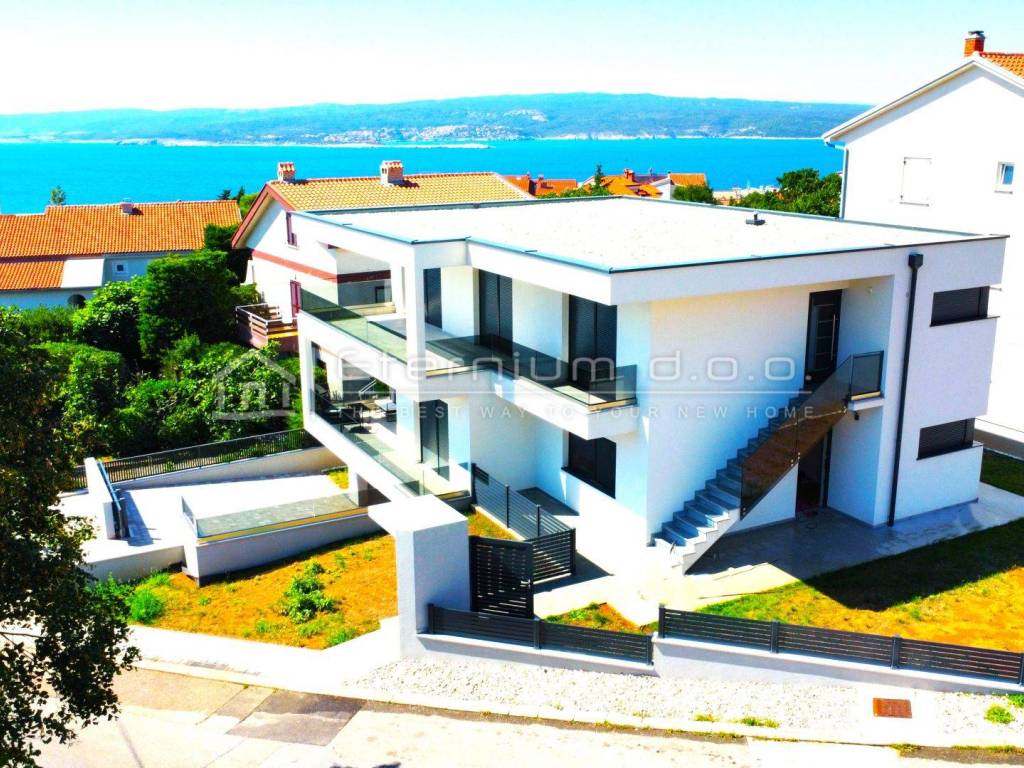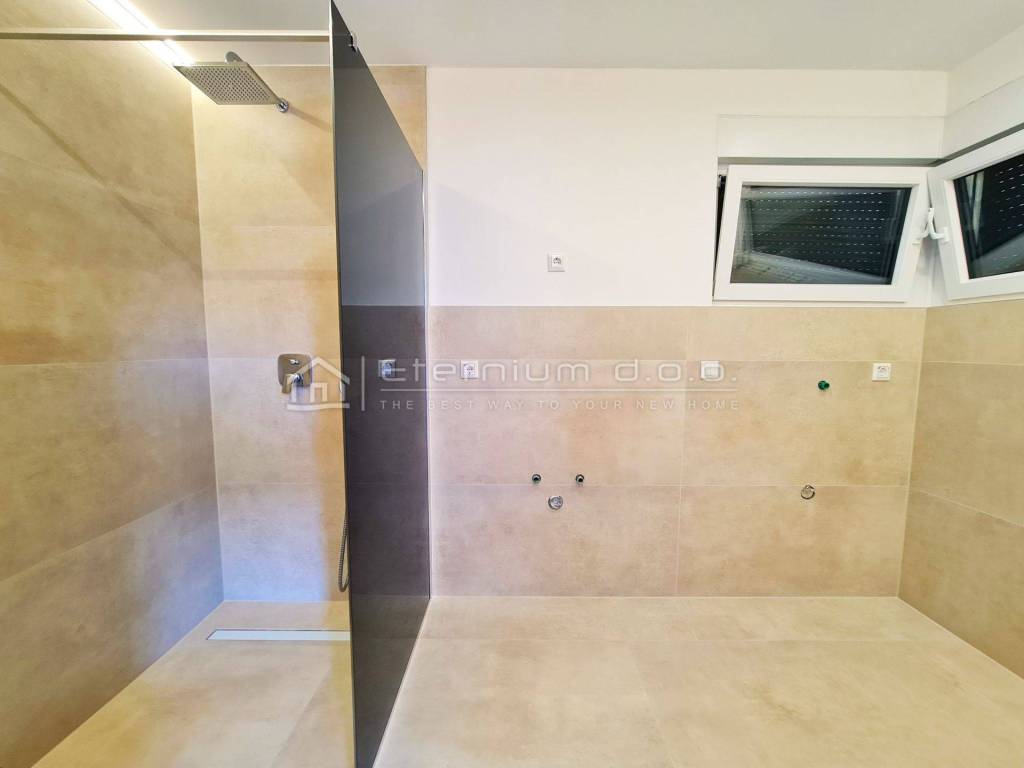 Podijeljena je u tri etaže - u suterenu se nalazi prostrana garaža od cca 90m2 u kojoj je ukomponirana i kotlovnica dok su prizemlje i prvi kat rezervirani za dva stana koja se sastoje od ulaznoga hodnika, predsoblja i kupaone, dvije spavaće sobe od kojih master bedroom ima walk in ormar te vlastitu kupaonu, kuhinje i blagovaone te prostranoga dnevnoga boravka. Cijeli dnevnii dio ima izlaz na prekrasnu natkrivenu terasu sa koje se pruža lijepi pogled na more (odnosi se na prvi kat - prizemlje ima djelomičan pogled)!