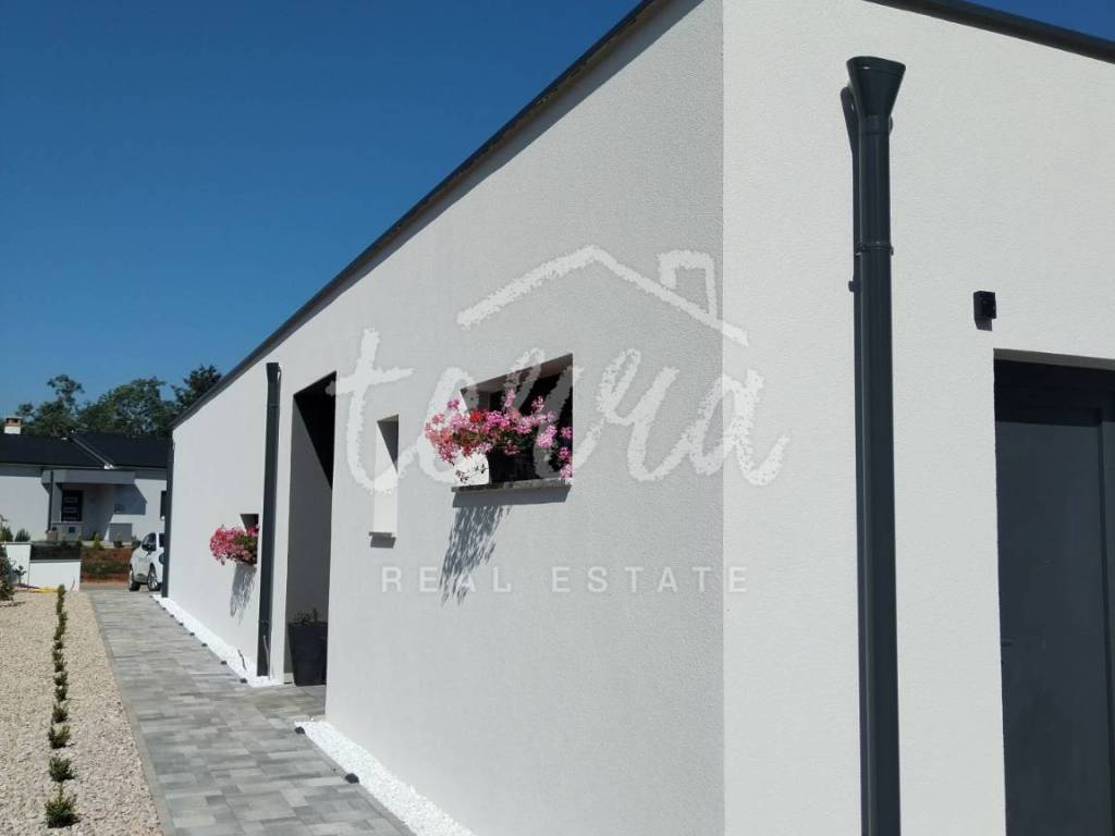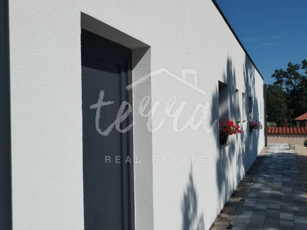 Na besprijekorno uređenoj okućnici nalazi se bazen sa sunčalištem, vanjska natkrivena terasa sa garniturama za sjedenje i uživanje u toplim ljetnim mjesecima.