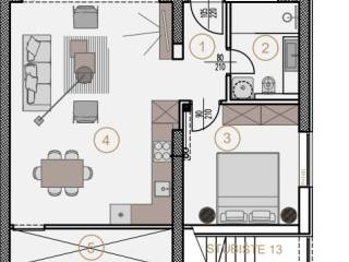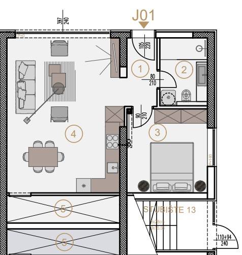 Stan se nalazi u prizemlju novoizgrađenog stambeno - poslovnog kompleksa koji se sastoji od centralnog, južnog i sjevernog dijela. Površina stana iznosi 54.57 m2. Stan se sastoji od dnevnog boravka zajedno sa kuhinjom i blagovaonicom, spavaće sobe, kupaonice, hodnika i ostave. Stan se prodaje po sistemu „ključ u ruke" s kompletno uređenom kupaonicom (namještaj i sanitarije), podnim oblogama u svim prostorijama (keramika 1. klase, laminat), provedenim elektroinstalacijama, ugrađenim klima uređajem, unutarnjom stolarijom, vanjskom PVC ili ALU stolarijom, protuprovalnim i protupožarnim ulaznim vratima, antenskim sustavom, UTP mrežom, te zidovima i stropovima bijele boje.