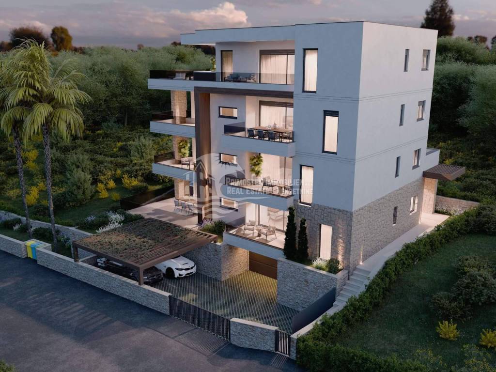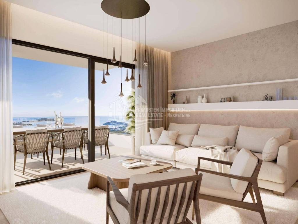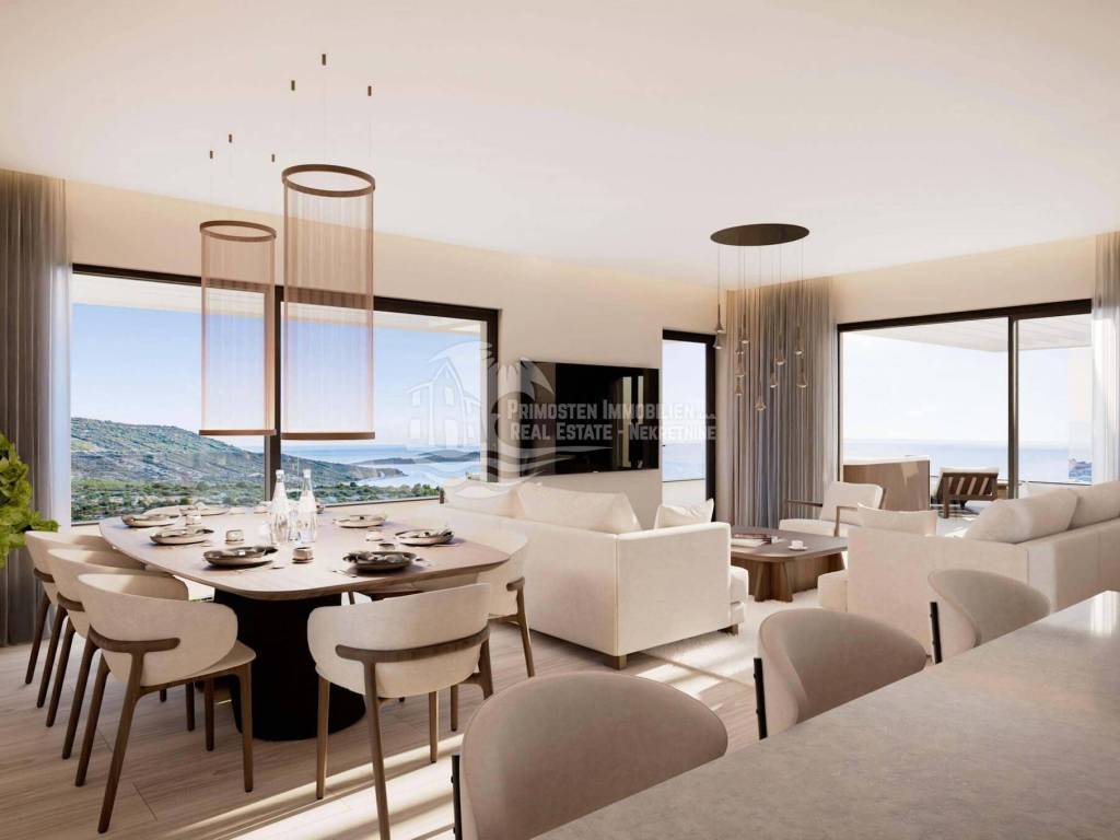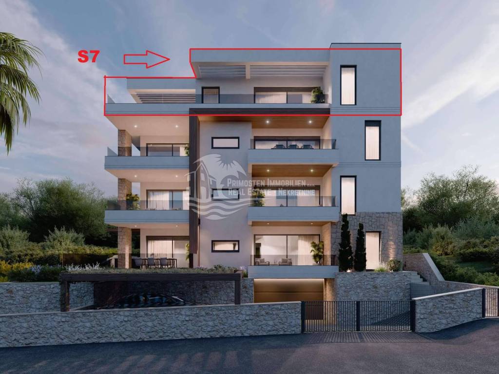 Penthouse apartman u izgradnji, nalazi se u stambenoj zgradi od ukupno sedam stambenih jedinica. Stambeni prostor iznosi 109,86 m², a korisni prostor približno 123,70 m². Sastoji se od predsoblja, prostrane kuhinje s blagovaonicom i dnevnog boravka, tri spavaće sobe, dvije kupaonice, praonice rublja i terase površine 42,72 m² s jacuzzijem okrenute prema jugu. U unutarnjem i vanjskom prostoru biti će postavljene visokokvalitetne pločice, a spavaće sobe će imati hrastov parket sa uzorkom riblje kosti. Pogled na otvoreno more i na Primošten sa terase jednostavno oduzima dah. Od tehničke opreme biti će opremljeno sa četiri klima uređaja, električnim podnim grijanjem u dnevnom borovku i kupaonicama, te ujedno i električnim roletama s komarnicima na prozorima. U cijenu je uključeno veliko garažno mjesto od 27,67 m² s punionicom za električna vozila, što pruža dovoljno prostora za korištenje garaže kao skladišnog prostora. Stan se prodaje nenamješten, ali uz dodatnu naknadu možete koristiti dizajnera interijera za opremanje, kao što je prikazano na našoj web stranici. Sadržaji poput supermarketa, pekare i kafića nalaze se na pješačkoj udaljenosti od oko 5 minuta. Udaljenost do centra grada i plaže je 2 km, a do zračne luke Split je cca. 35 km. Završetak gradnje predviđen je za lipanj 2026. Kontaktirajte nas za više detalja!