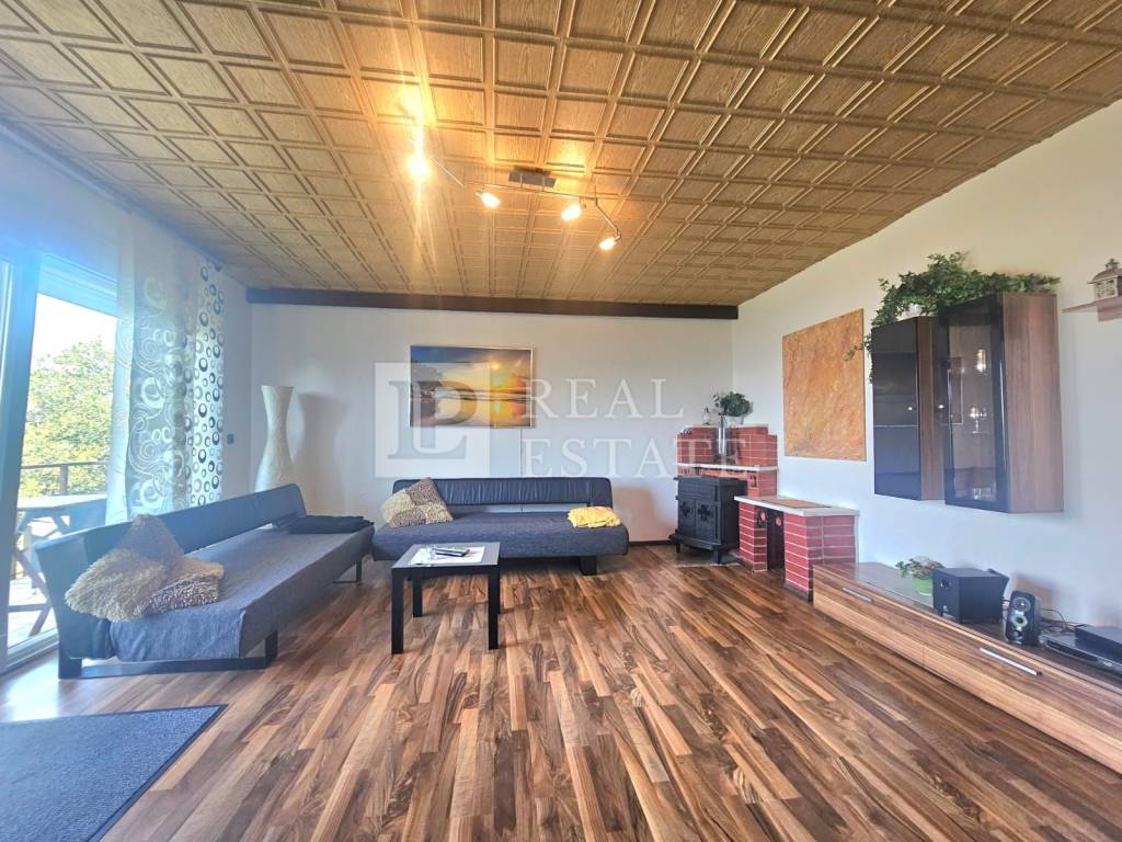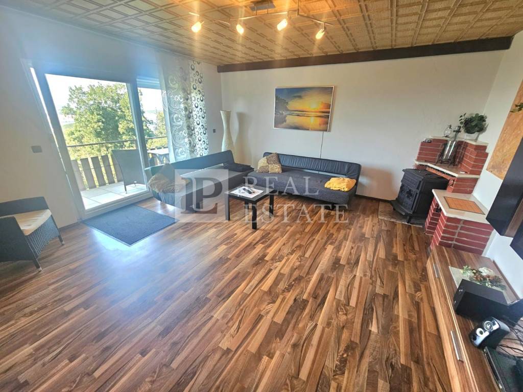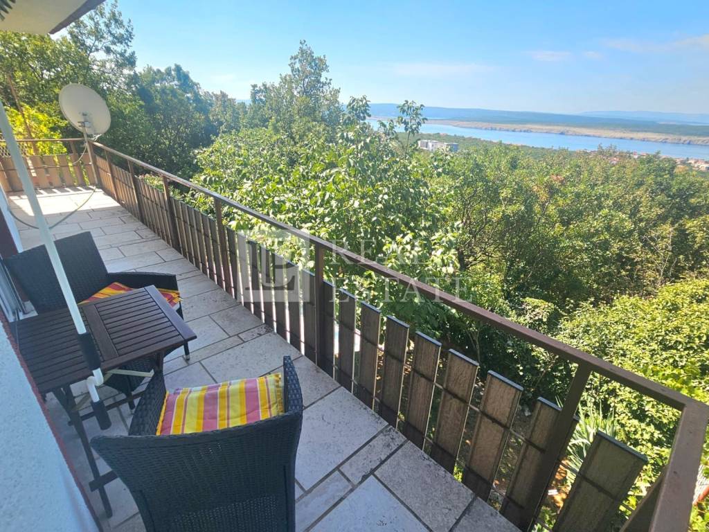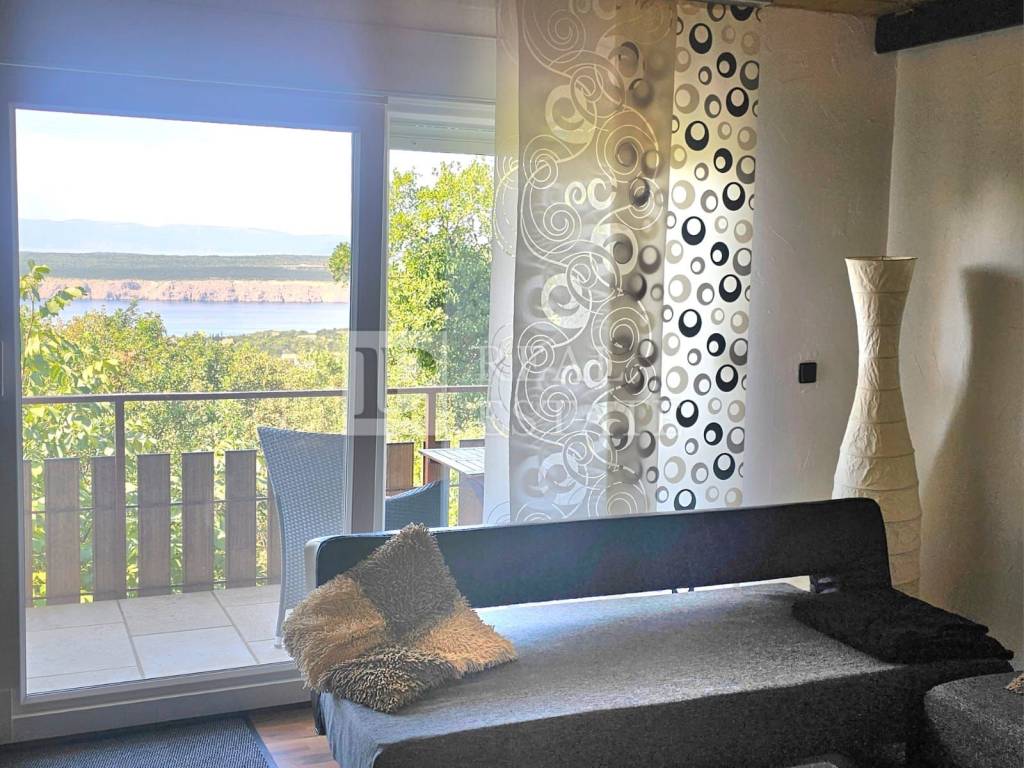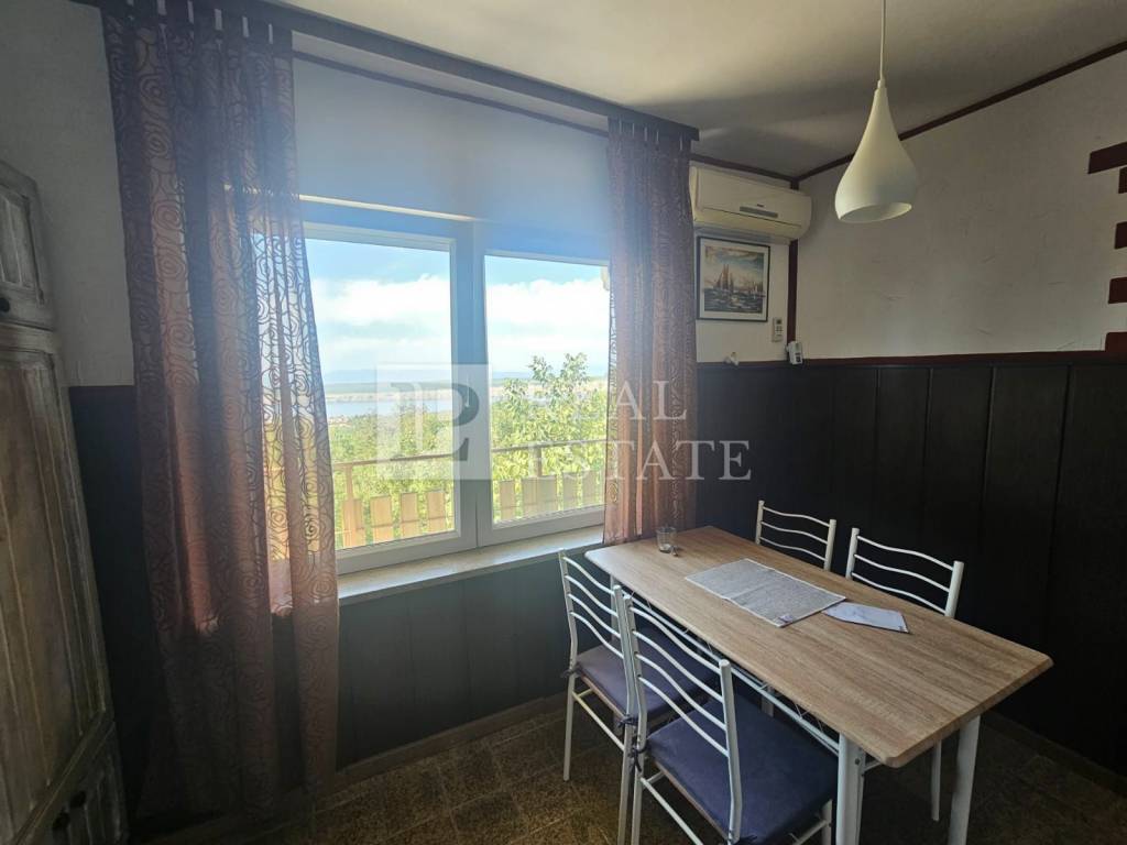 Stan na katu je potpuno fizički odvojen i ima zaseban ulaz. On se sastoji od kuhinje s blagovanicom, kupaonice, dvije zaista ogromne spavaće sobe i dnevnog boravka iz kojeg se izlazi na terasu koja se proteže dužinom cijele kuće. S terase se prostire otvoreni pogled na more i otok Krk.