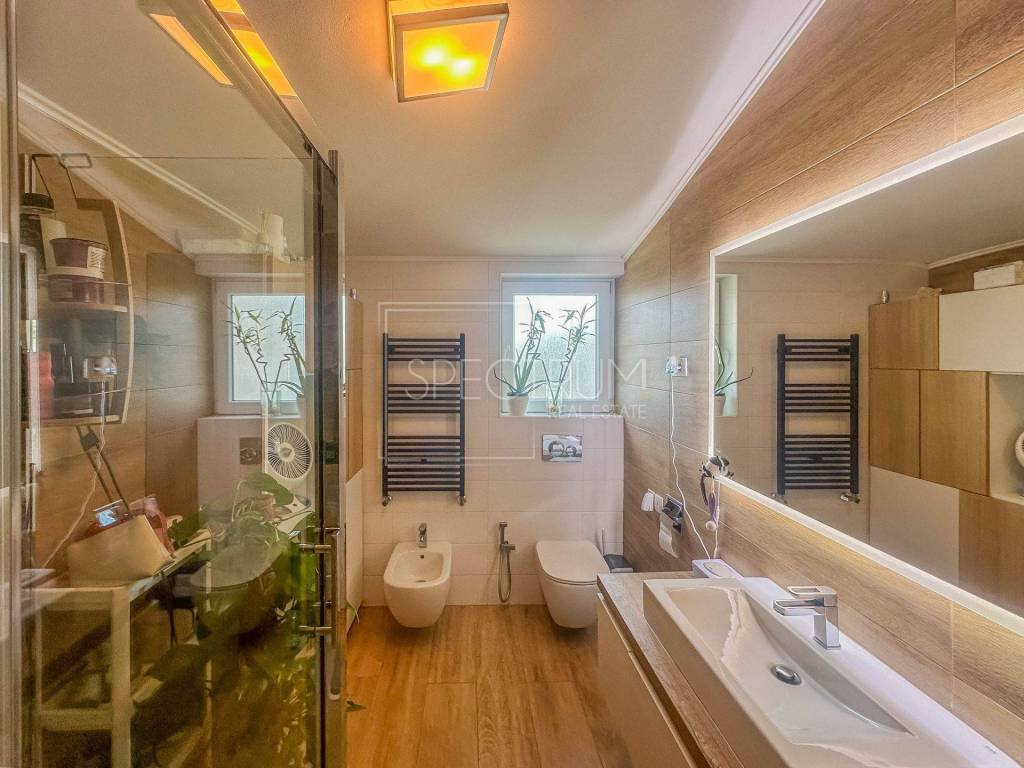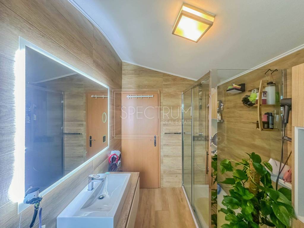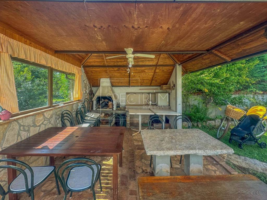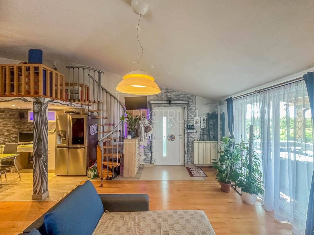 Stan se nalazi na 1.katu, a površina stana iznosi 91.31 m2. Stan se sastoji od zatvorenog ulaznog prostora, open space dnevnog boravka sa kuhinjom i blagovaonicom, 3 spavaće sobe, kupaonice, hodnika, praonice te natkrivene terase na kojoj se nalazi jacuzzi. Na terasu se dolazi iz dnevnog boravka, a sa terase se pruža čak i djelomičan pogled na more. Na terasi se nalazi i ostava. Stan je nedavno opremljen novim kvalitetnim namještajem i tehnikom, te se kao takav namješten i prodaje. Nedavno je i obnovljena fasada te je postavljena nova izolacija. Grijanje je putem centralnog grijanja na naftu i klima uređaja. Stanu pripada i vanjsko stubište koje vodi do stana. Na korištenje stanu pripada i zajednička natkrivena ljetna kuhinja sa kaminom, kao i vrt. Stanu također pripada i vrtna kućica, idealna za spremište bicikala i raznih alata. Pored stana se nalazi natkriveni prostor za parking.