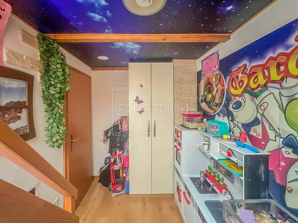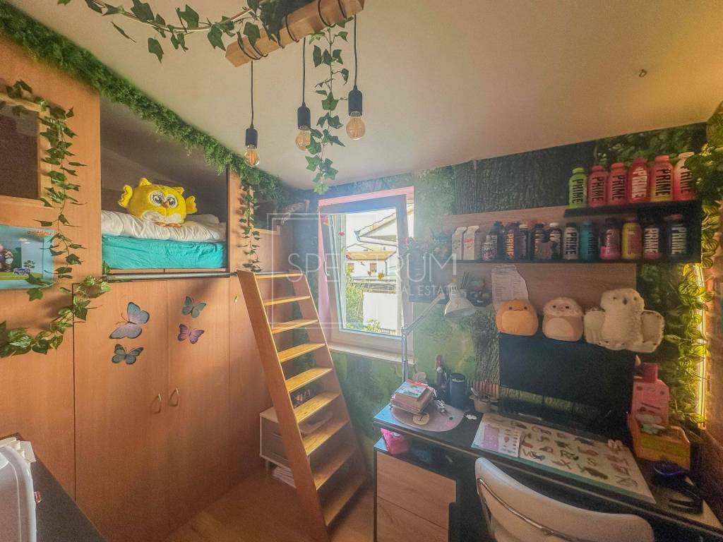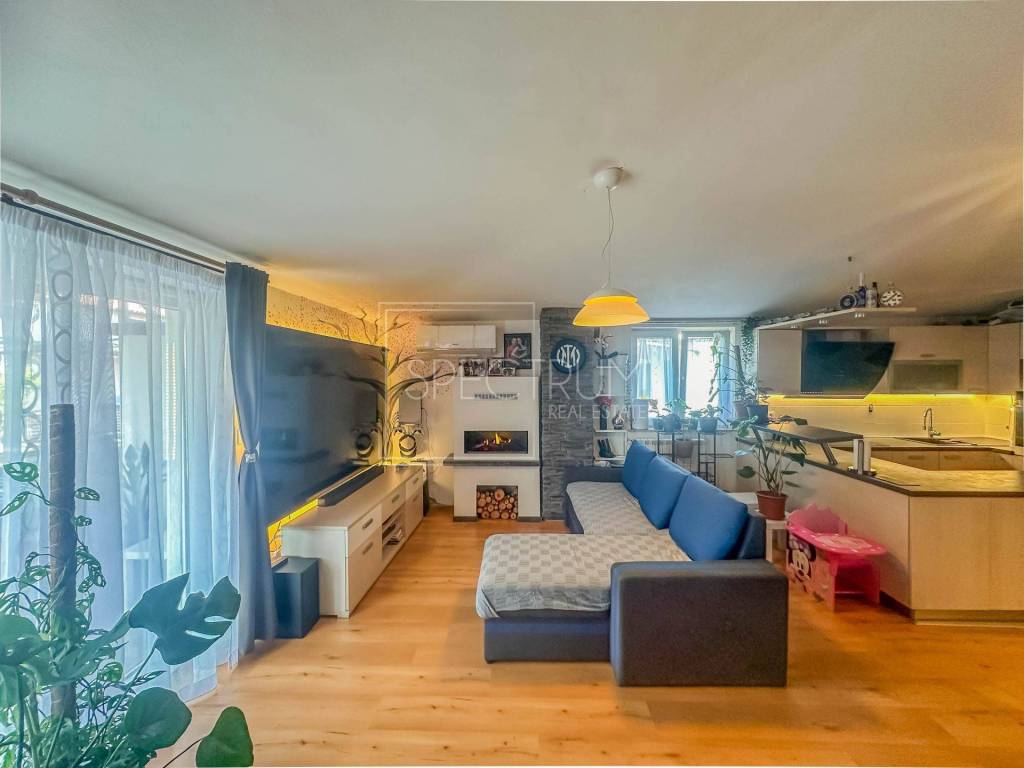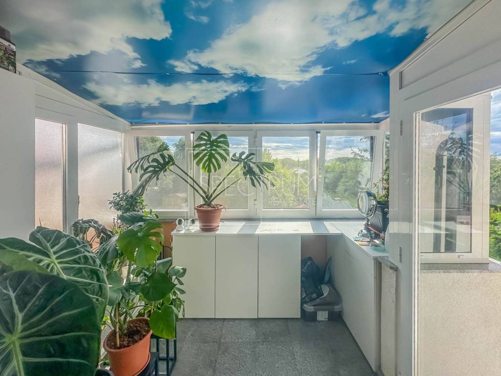 Stan se nalazi na 1.katu, a površina stana iznosi 91.31 m2. Stan se sastoji od zatvorenog ulaznog prostora, open space dnevnog boravka sa kuhinjom i blagovaonicom, 3 spavaće sobe, kupaonice, hodnika, praonice te natkrivene terase na kojoj se nalazi jacuzzi. Na terasu se dolazi iz dnevnog boravka, a sa terase se pruža čak i djelomičan pogled na more. Na terasi se nalazi i ostava. Stan je nedavno opremljen novim kvalitetnim namještajem i tehnikom, te se kao takav namješten i prodaje. Nedavno je i obnovljena fasada te je postavljena nova izolacija. Grijanje je putem centralnog grijanja na naftu i klima uređaja. Stanu pripada i vanjsko stubište koje vodi do stana. Na korištenje stanu pripada i zajednička natkrivena ljetna kuhinja sa kaminom, kao i vrt. Stanu također pripada i vrtna kućica, idealna za spremište bicikala i raznih alata. Pored stana se nalazi natkriveni prostor za parking.