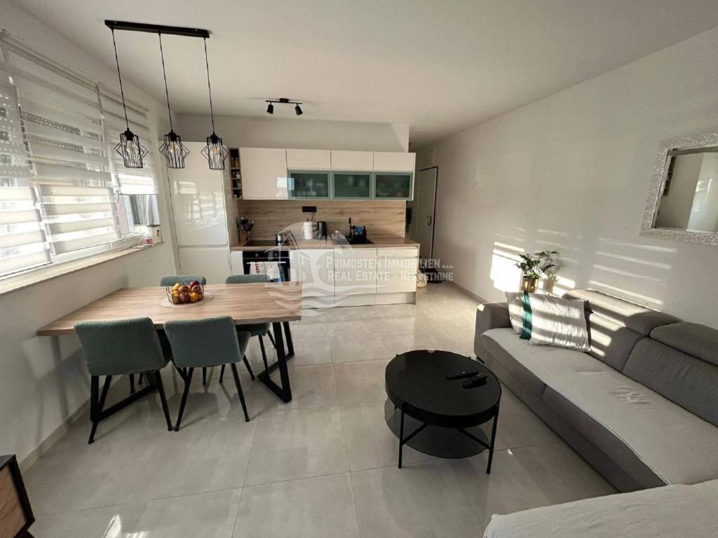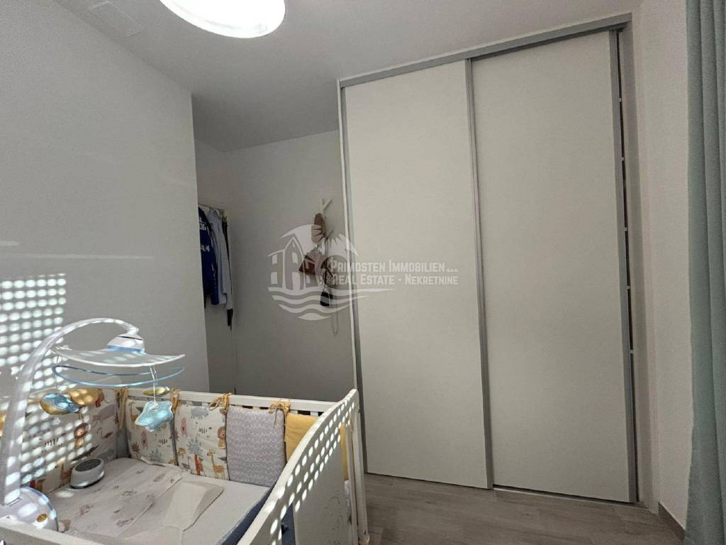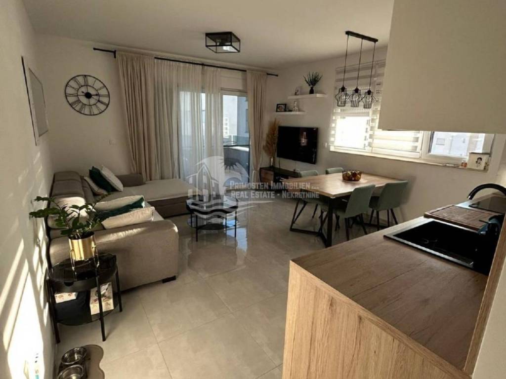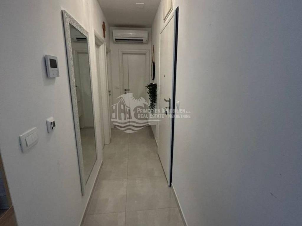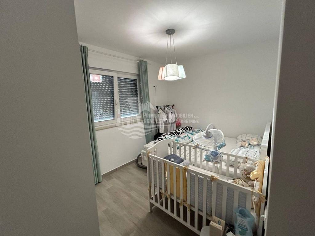 Kompletno namješten stan na drugom katu u Segetu udaljeno 300m zračne linije od mora, te u blizini svih sadržaja. Stan se nalazi u stambenoj zgradi novije gradnje koja ima lift i zajednički bazen. Stambena površina stana sa balkonom iznosi 60 m2. Stan se sastoji od hodnika, dvije spavaće sobe, kupaonice, te prostranog dnevnog boravka sa kuhinjom. Iz dnevnog dijela se izlazi na balkon sa kojeg se pruža pogled na more. Stanu pripada jedno vanjsko parkirno mjesto. Stan se prodaje kompletno namješten i u stanu je postavljeno podno grijanje i klima uređaj. Kompletna dokumentacija je uredna, te postoji mogućnost kupnje kreditom. Udaljenost od zračne luke Split je 6 km.