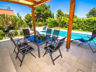 Velika okućnica s bazenom dimenzija 8x3 metra, vanjskim tušem, natkrivenom kamenom popločanom terasom s vanjskim stolom i stolicama i plinskim roštiljem. Okućnica površine 450 četvornih metara ima bujnu mediteransku vegetaciju.