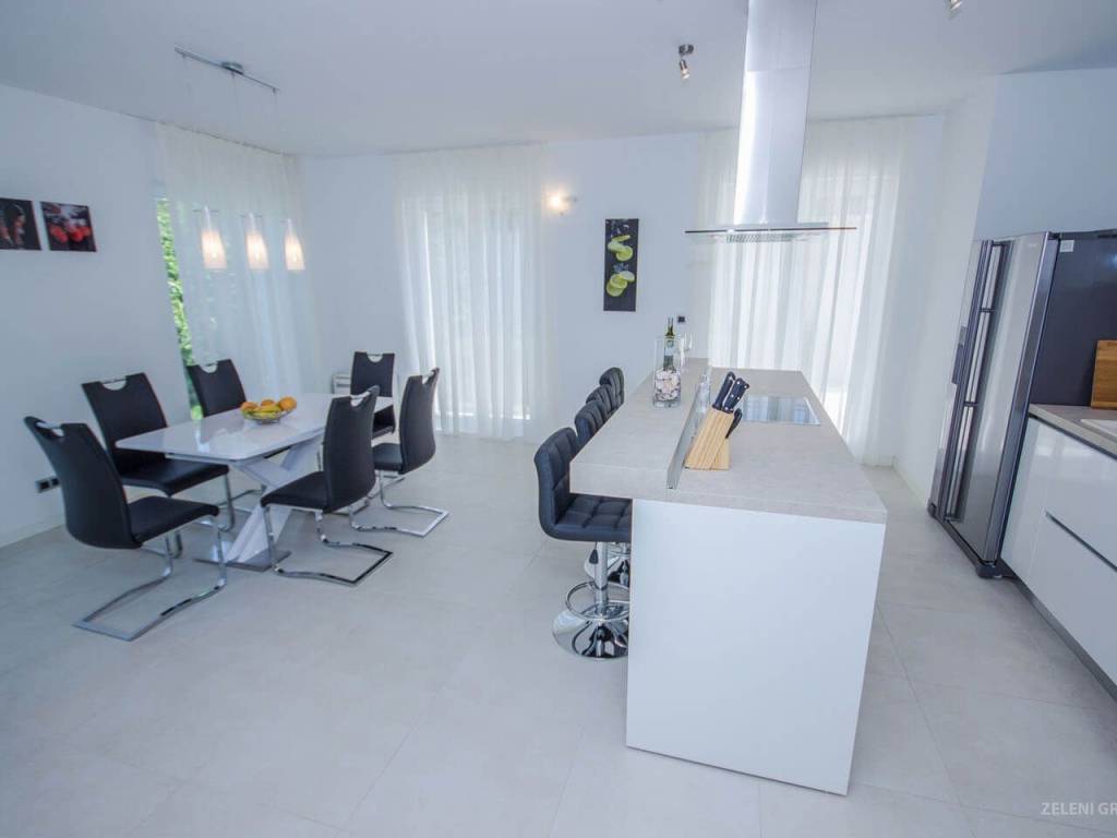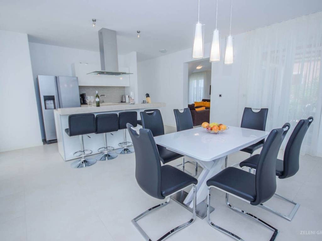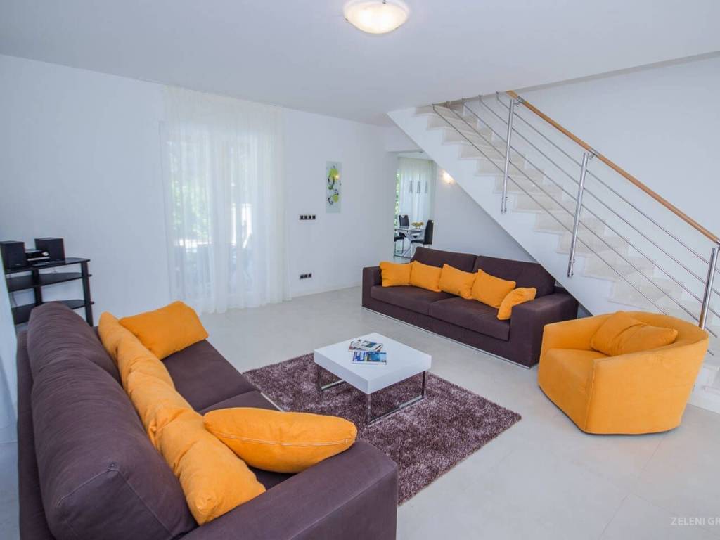 U prizemlju se nalazi dnevni boravak sa dosta sjedećih mjesta, zatim odvojena blagovaonica sa stolom za objedovanje za šest osoba. Šank za doručak ima tri barske stolice, a tu je i moderna kuhinja s perilicom posuđa, hladnjakom/zamrzivačem, štednjakom, pločom za kuhanje, kuhalom za vodu, aparatom za kavu, posuđem za kuhanje i jelo. Obiteljska garderoba u prizemlju sastoji se od umivaonika i WC-a. Perilica rublja, glačalo, daska za glačanje i sušilo za kosu su također isporučeni. Dnevna soba ima troja, gotovo od poda do stropa, francuska vrata koja vode u privatni vrt i bazen.