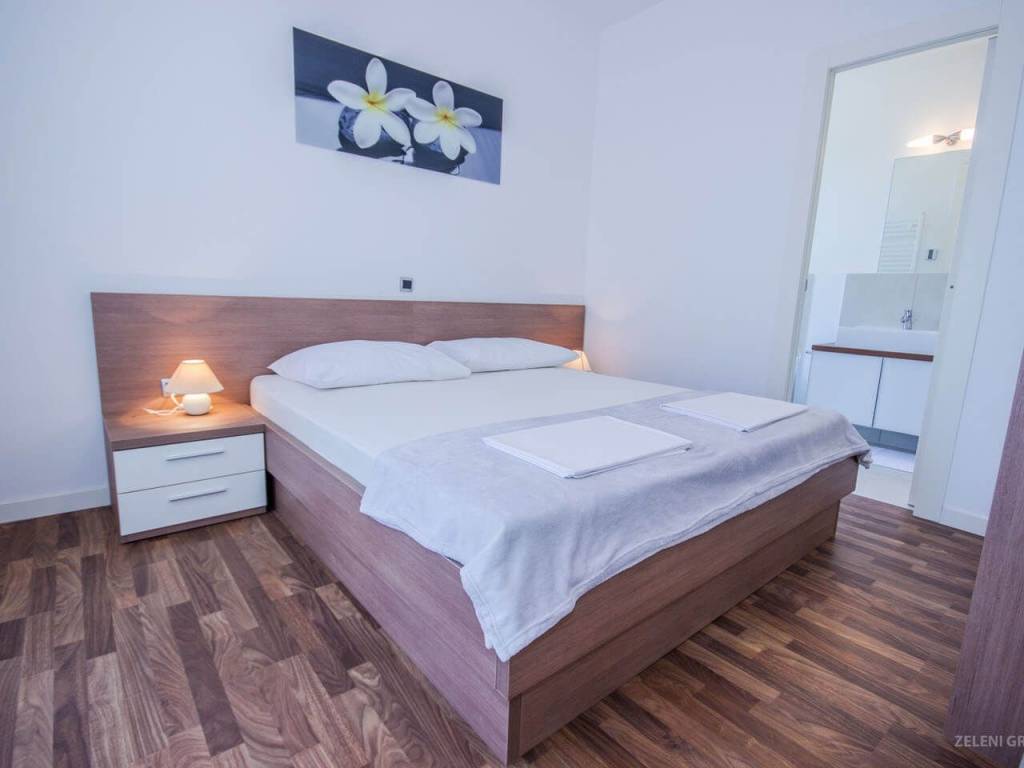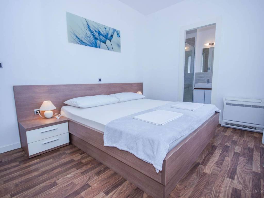 Stubište vodi na prvi kat s tri dvokrevetne spavaće sobe i tri kupaonice. Glavna spavaća soba ima kupaonicu s kadom, a druge dvije kupaonice imaju moderne tuš kabine. Spavaće sobe imaju bračne krevete (160 x 200 cm) i ugradbene ormare.