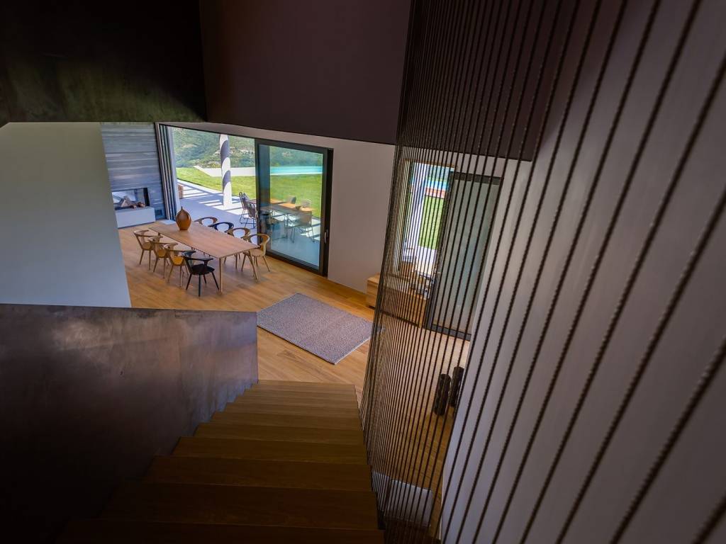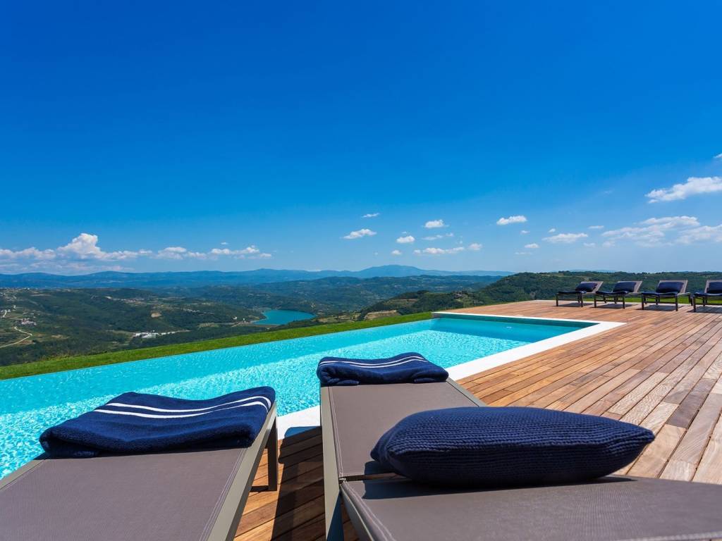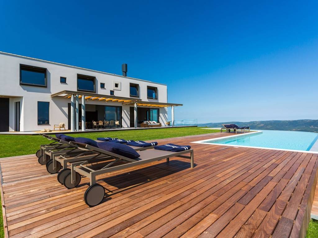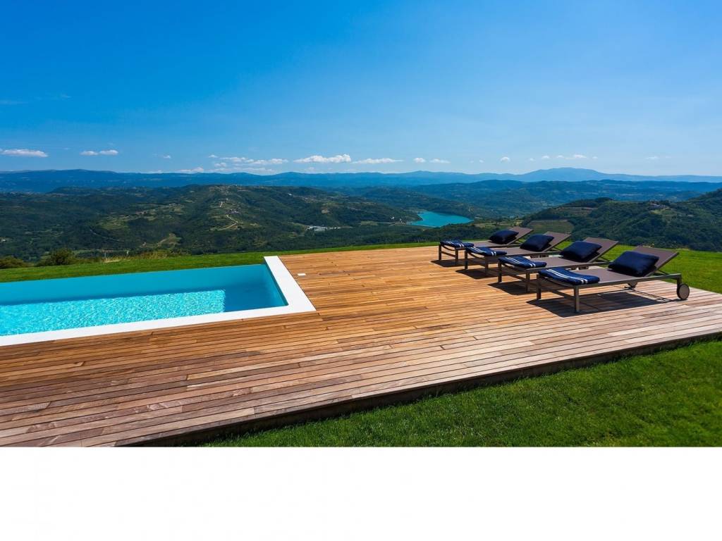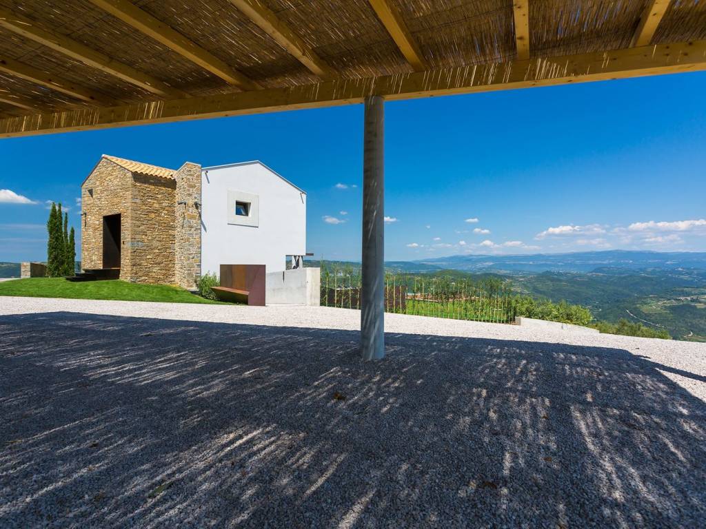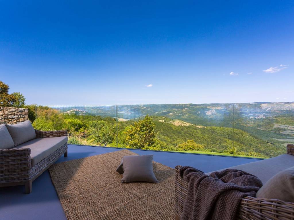 Ova nagrađivana kuća idealna za potpunu privatnost nalazi se na 5 hektara privatnog zemljišta (uključujući 300 stabala maslina) ima zadivljujući pogled na prirodu koja oduzima dah, biovrt i voćnjak, 60m2 infinity bazen. U prizemlju se nalazi otvorena kuhinja, blagovaonica i dnevni boravak s prekrasnim kaminom koji se otvara na dvije terase s prekrasnim pogledom i infinity bazenom. Gornji kat ima tri spavaće sobe s vlastitim kupaonicama. Sve je namješteno i uređeno s velikom pažnjom za detalje. Vila ima privatni parking za 4 automobila. Malo ruralno selo, sa ukupno smješteno na brežuljku s pogledom na dolinu rijeke Mirne i jezero Butoniga, nudi neke od najspektakularnijih pogleda na Istru. Gledajući iz kuće ili njenog epskog beskonačnog bazena, možete nabrojati stotinjak malih zaselaka i sela raštrkanih u daljini okruženih prekrasnim krajolikom s valovitim zelenim brežuljcima, nepreglednim livadama, vinogradima i maslinicima. Za vedrog dana pogled seže sve do obale Italije i najvišeg vrha Slovenije. Nalazi se u blizini zapanjujuće lijepog srednjovjekovnog gradića Motovuna na brežuljku koji je poznat kao grad-spomenik i odiše pravim istarskim šarmom i poviješću nudeći spektakularne poglede na brežuljke prekrivene vinogradima, zaseoke i seoske kuće te čarobnu dolinu Mirne. Dodatni troškovi koje snosi kupac nekretnine u Hrvatskoj: porez na promet nekretnina (3% od vrijednosti nekretnine), agencijska provizija (3% + PDV na vrijednost nekretnine), Za fotografije, tlocrte i sve daljnje informacije molimo kontaktirajte agenciju.