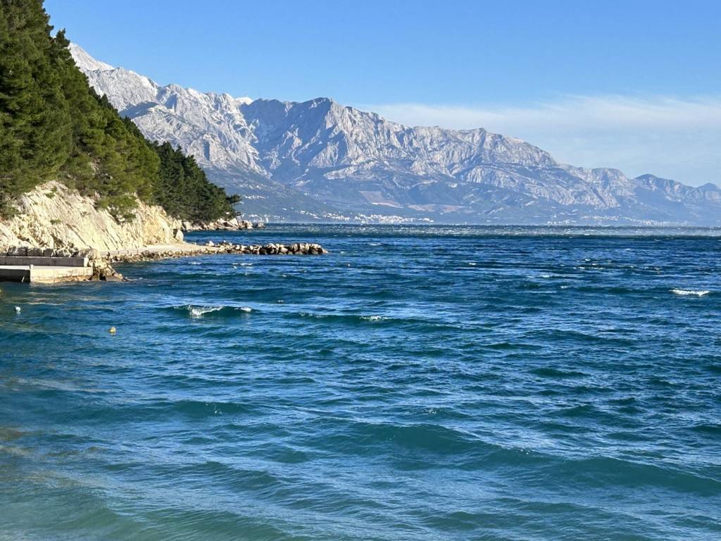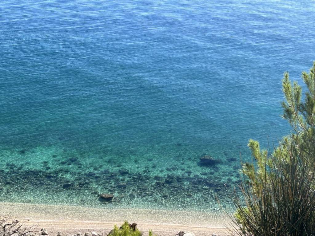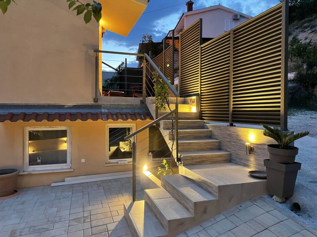 Parking: cca. 45 m² s 2 privatna mjesta + zajedničko parkiralište. Ukupna veličina parcele: 370 m². Orijentacija: Okrenuta prema jugu, osunčana cijeli dan, s nesmetanim pogledom na more.