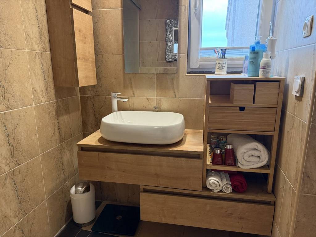 Gostinski apartman (55 m², gornji kat) sastoji se od dnevnog boravka i čajne kuhinje, spavaće sobe s ugrađenim king size krevetom, kupaonice s kišnim tušem i pametnim WC-om, privatne praonice/spremišta i stražnje terase od 12,7 m² + balkona s pogledom na more od 2,5 m².