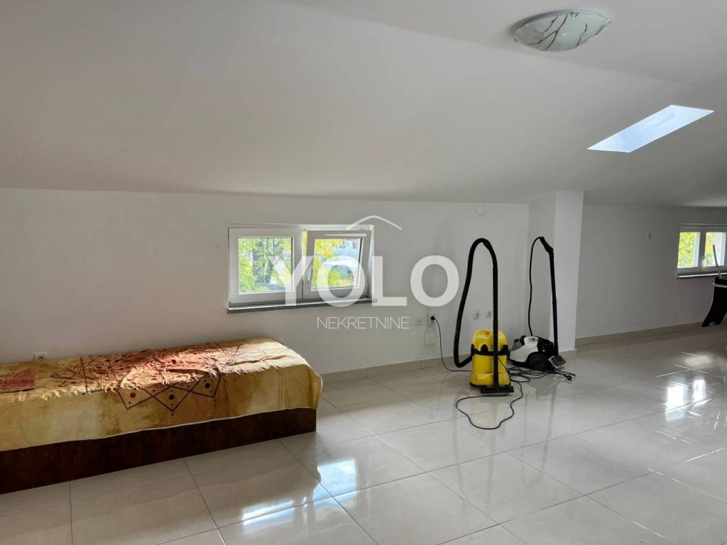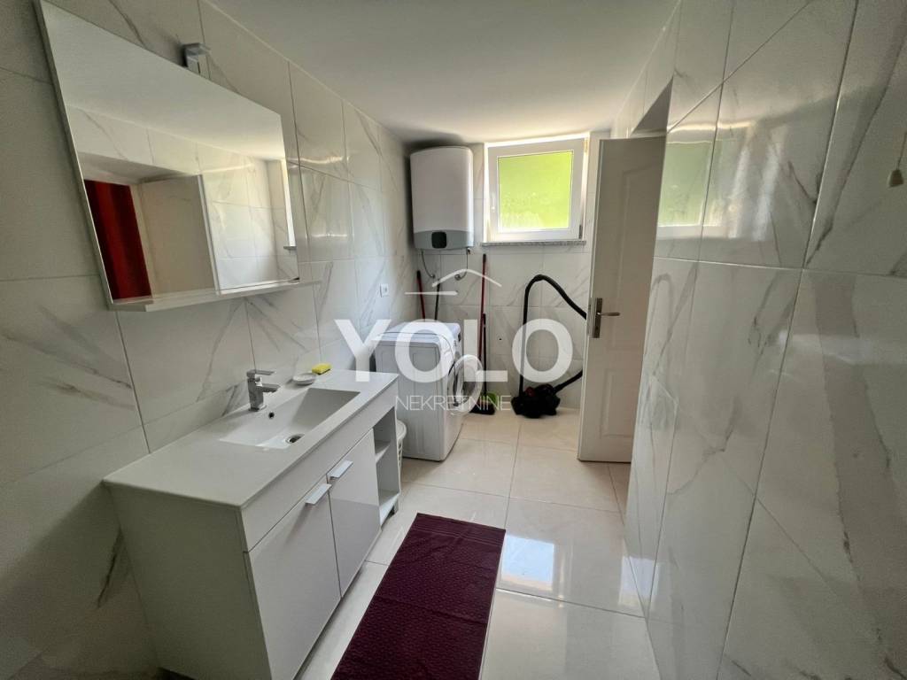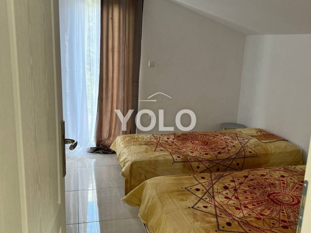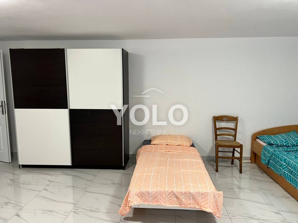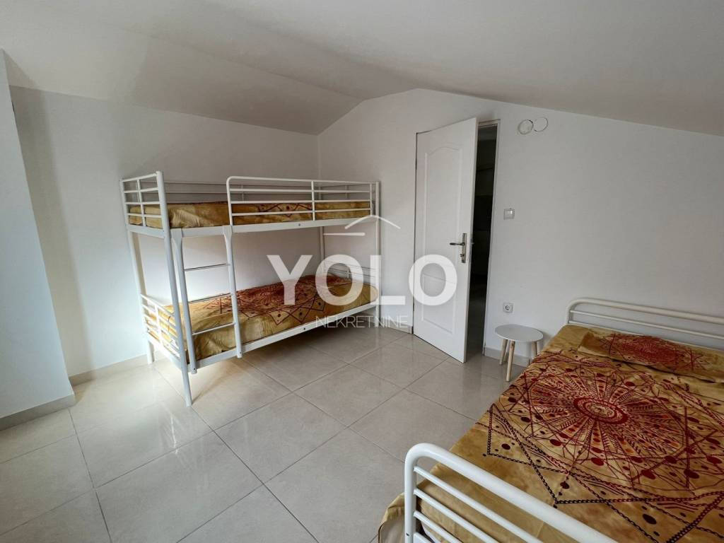 U prizemlju kuće sa lijeve strane ulaz je u jednosobni stan gdje je su zajedno dnevnim boravak kuhinja te blagovaona, kupaonicom i malim ulaznim hodnikom, stan se grije i hladi pomoću klima uređaja. Također u prizemlju kuće ali sa desne strane iste ulaz je za drugi jednosobni stan istog rasporeda osim šta ovaj stan ima dodatni ugradbeni ormar u hodniku. Na prvom katu kuće odmah sa lijeve strane je prostor najsličniji studio apartmanu ali u ovom slučaju iskorišten je za prostor vešeraja. Na tom istom katu je ulaz za drugu stambenu jedinicu gdje se nalazi dvosoban stan sa dnevnim boravkom, blagovaonom i kuhinjom u istom prostoru , kupatilom , stan se grije i hladi pomoću klime. U potkrovlju kuće smještena je zadnja peta jedinica koja se sastoji od trosobnog stana, dnevnog boravka zajedno sa blagovaonicom i kuhinjom te kupatilom. Stan se grije i hladi pomoću klima uređaja. Kuća idealna za investiciju. Cijena na upit.