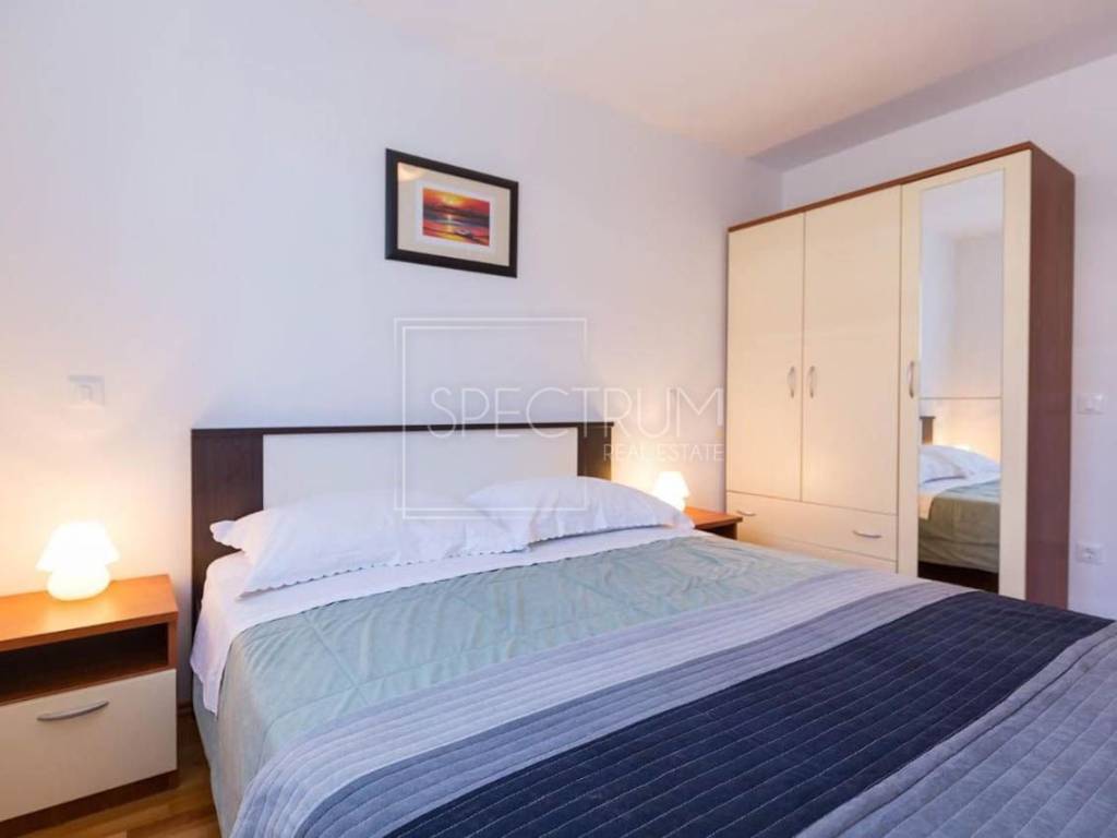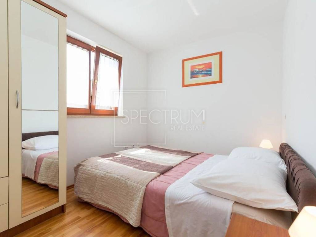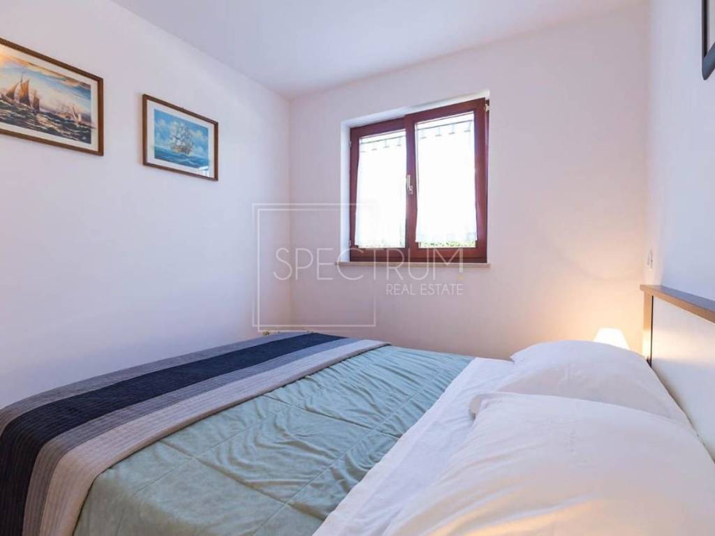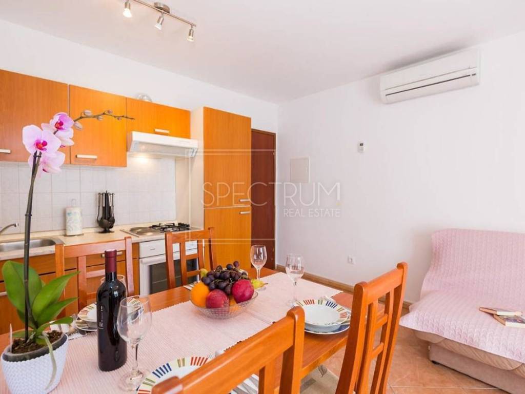 Stan se nalazi na 1.katu stambene zgrade. Površina stana iznosi 67.45 m2. Stan je trenutno podijeljen na 2 manje zasebne stambene jedinice, koje se opet mogu povezati u jednu veću, ovisno o želji novog vlasnika. Prva stambena jedinica sastoji se od dnevnog boravka sa kuhinjom i blagovaonicom, spavaće sobe, kupaonice te natkrivene terase na kojoj se nalazi i kamin. Sa terase se pruža i pogledom na more. Druga stambena jedinica sastoji se od dnevnog boravka sa kuhinjom i blagovaonicom, spavaće sobe i kupaonice. Ispred stambenih jedinica nalazi se predprostor. Grijanje je putem klima uređaja. Stan se prodaje namješten. U prizemlju se nalazi spremište koje pripada stanu.