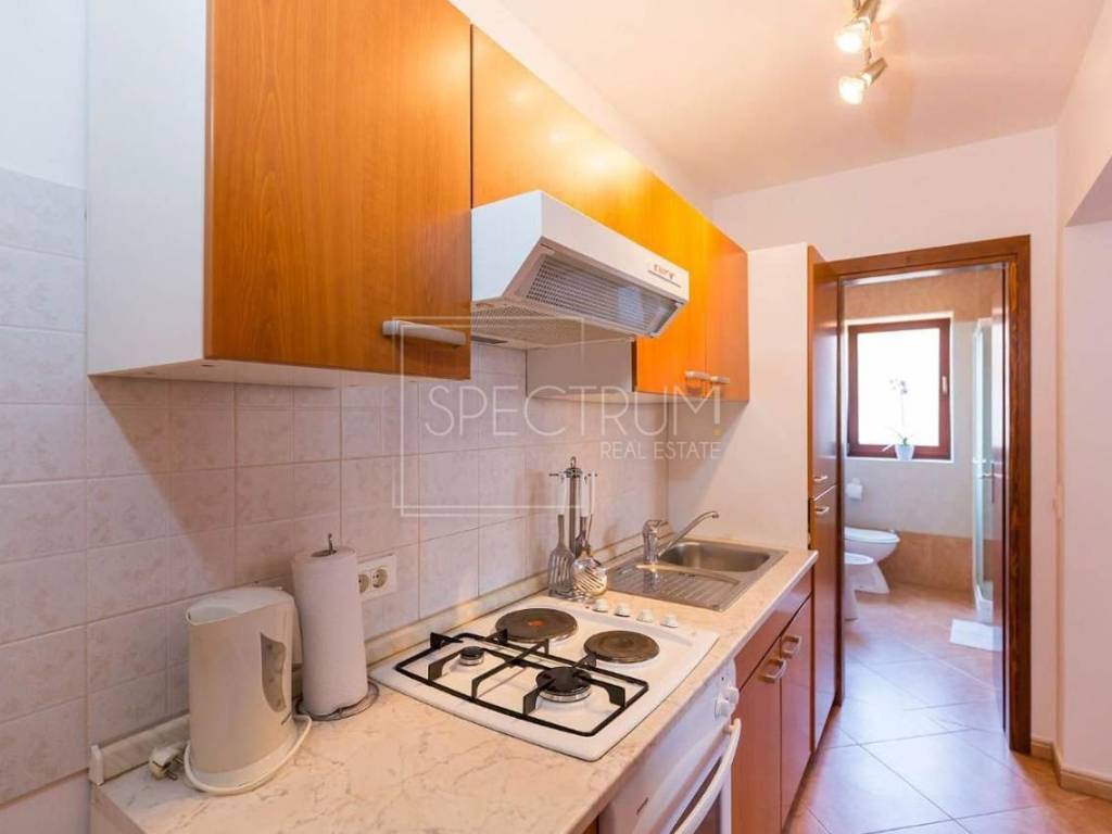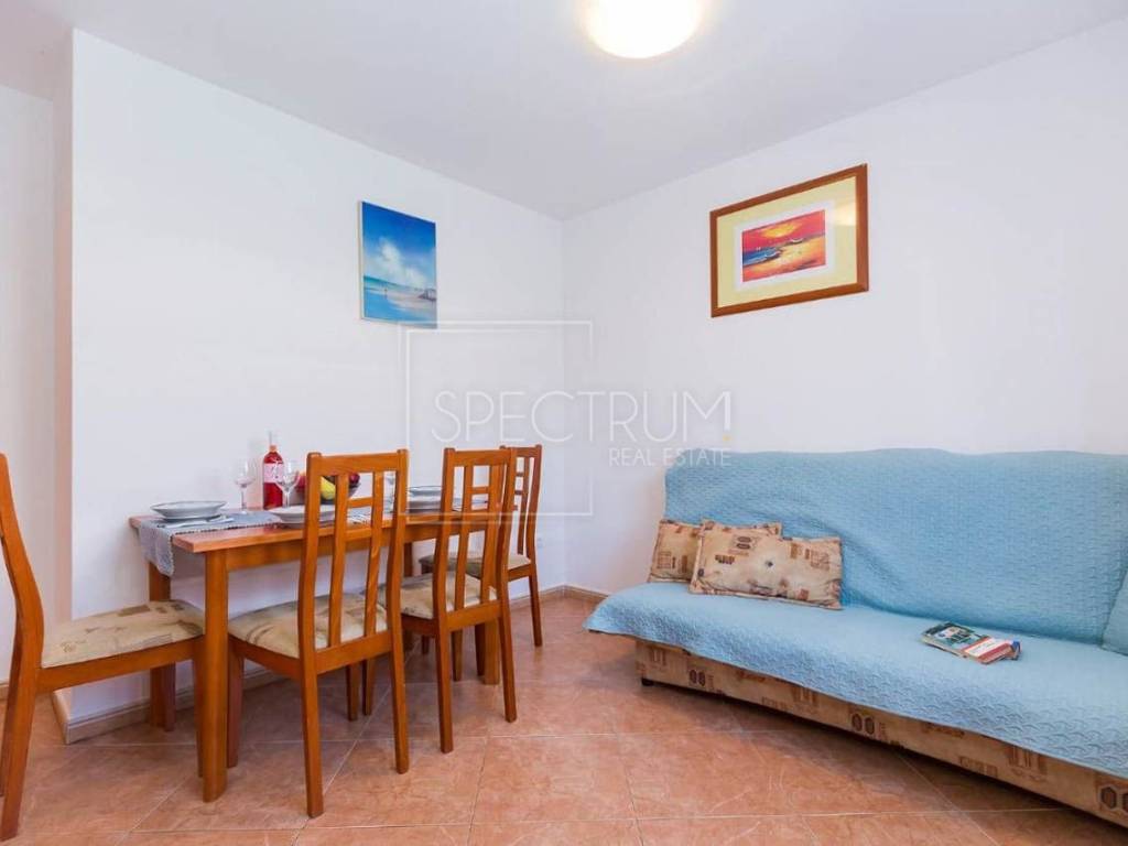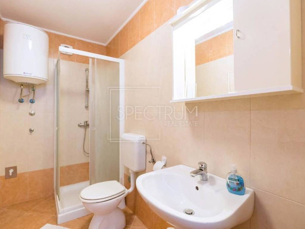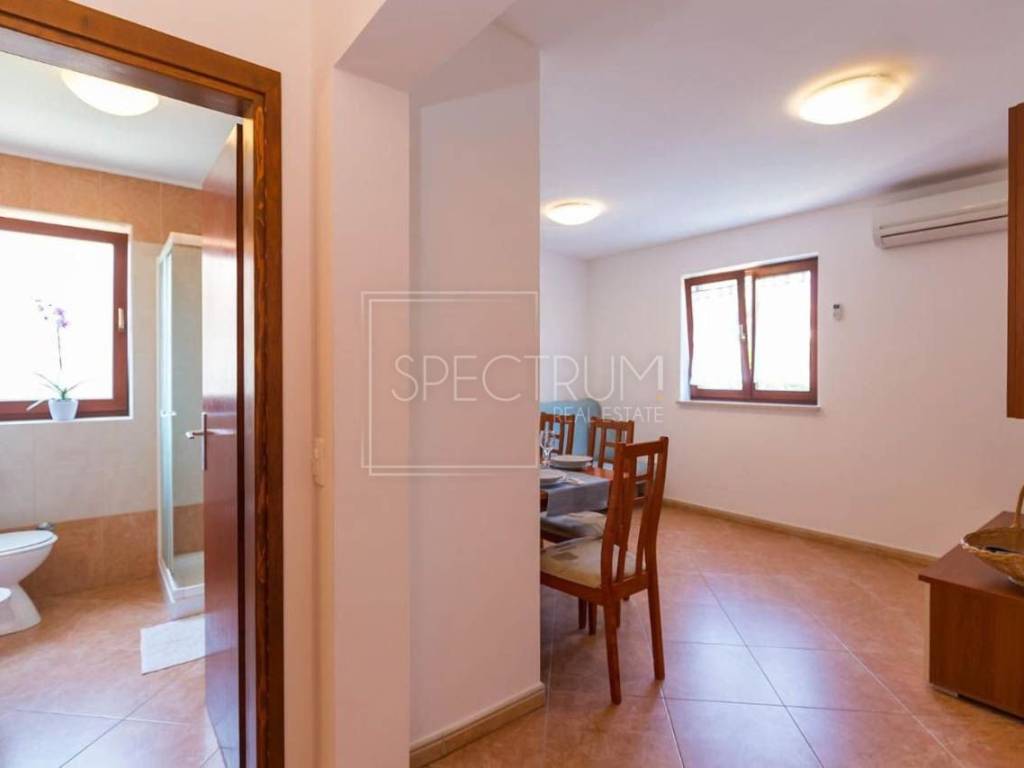 Stan se nalazi na 1.katu stambene zgrade. Površina stana iznosi 67.45 m2. Stan je trenutno podijeljen na 2 manje zasebne stambene jedinice, koje se opet mogu povezati u jednu veću, ovisno o želji novog vlasnika. Prva stambena jedinica sastoji se od dnevnog boravka sa kuhinjom i blagovaonicom, spavaće sobe, kupaonice te natkrivene terase na kojoj se nalazi i kamin. Sa terase se pruža i pogledom na more. Druga stambena jedinica sastoji se od dnevnog boravka sa kuhinjom i blagovaonicom, spavaće sobe i kupaonice. Ispred stambenih jedinica nalazi se predprostor. Grijanje je putem klima uređaja. Stan se prodaje namješten. U prizemlju se nalazi spremište koje pripada stanu.