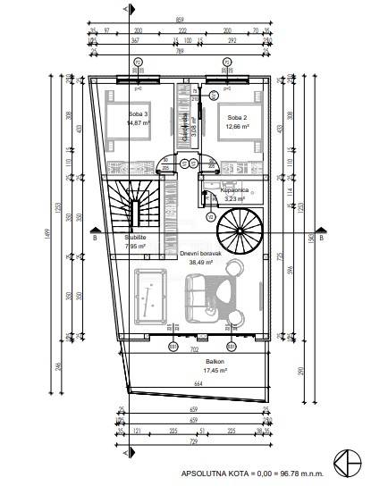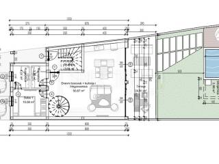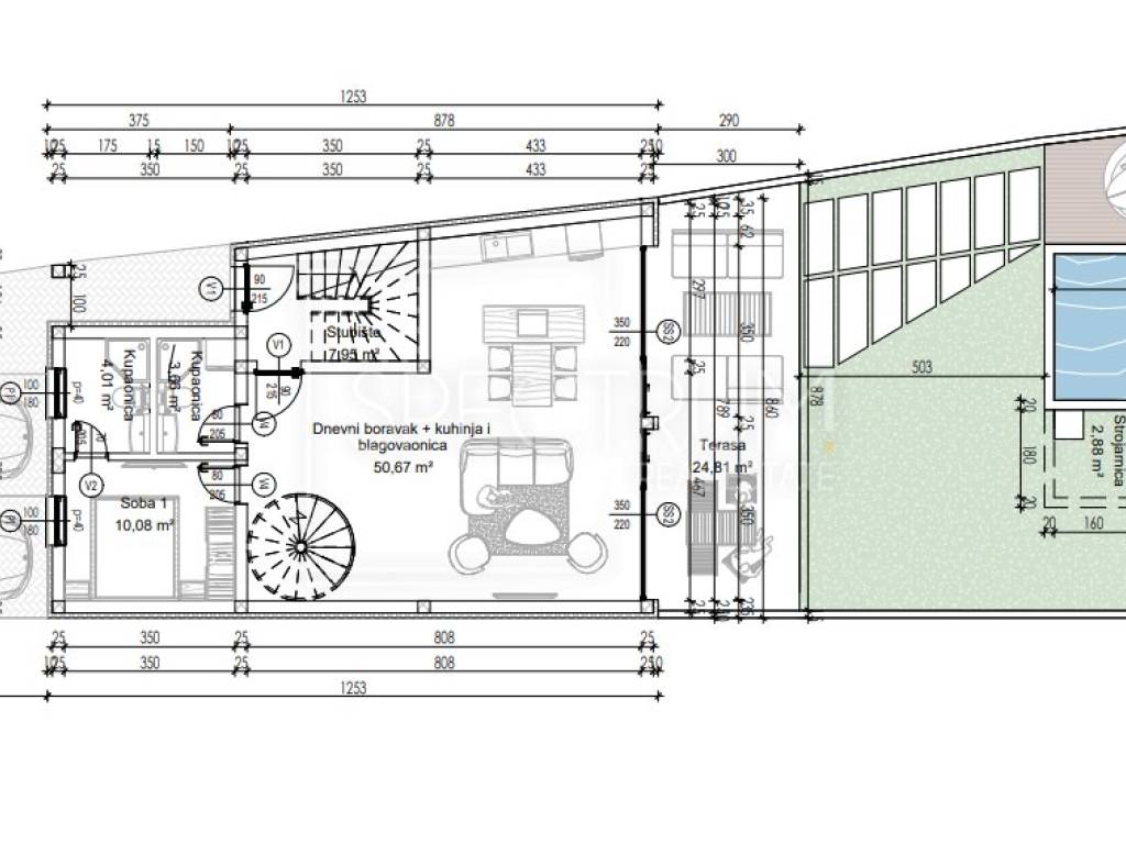 Stan se proteže kroz prizemlje i 1.kat novoizgrađene stambene zgrade. Površina stambenog prostora iznosi 140.75 m2. U prizemlju se nalazi dnevni boravak sa kuhinjom i blagovaonicom open space koncepta, spavaća soba i 2 kupaonice. Iz dnevnog boravka se izlazi na prostranu terasu površine 24.81 m2. Unutarnjim stepenicama se dolazi do kata gdje se nalazi još jedan prostrani dnevni boravak, 2 spavaće sobe, garderobna prostorija, kupaonica i hodnik. Iz dnevnog boravka se izlazi na natkrivenu terasu površine 17.45 m2.