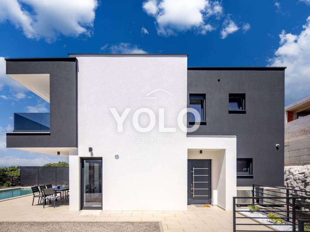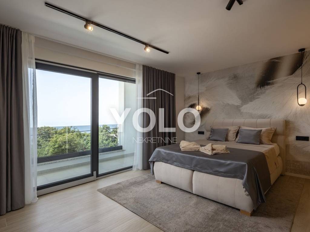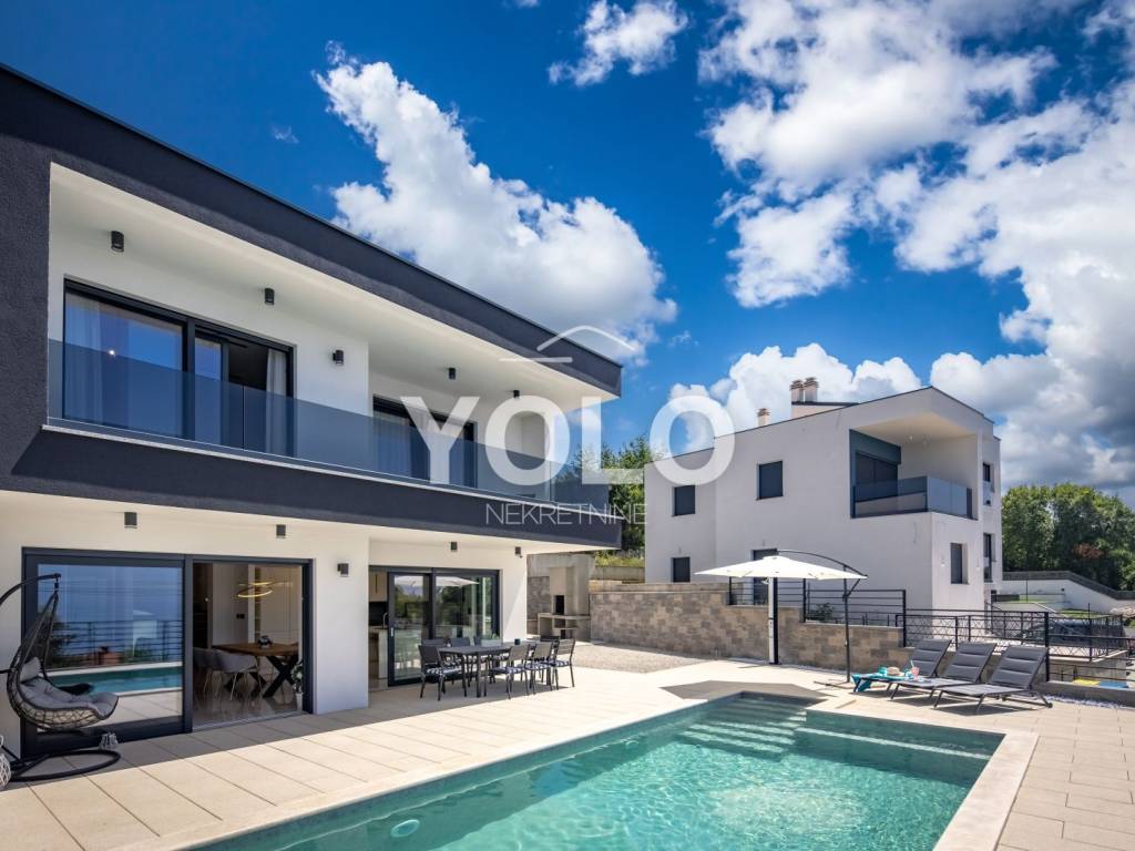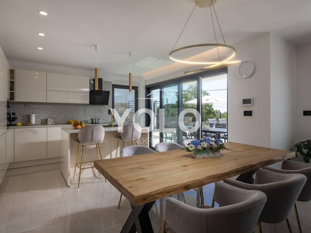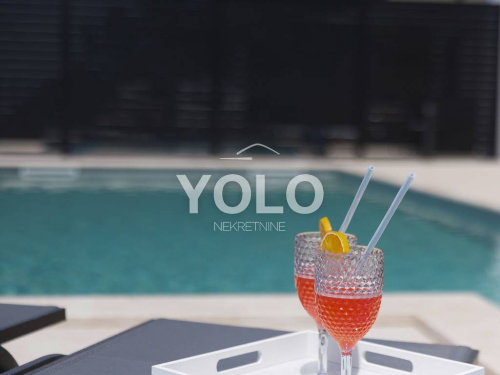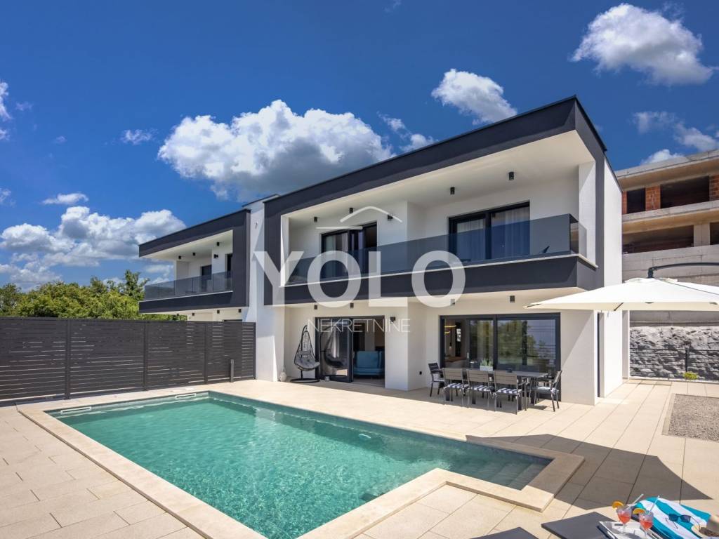 Na prodaju je ekskluzivna luksuzna dvojna vila s privatnim bazenom i otvorenim pogledom na more, smještena na atraktivnoj i mirnoj lokaciji. Vila se prodaje u potpunosti namještena s pažljivo biranim kvalitetnim namještajem i opremom, spremna za useljenje ili odmah za turistički najam.