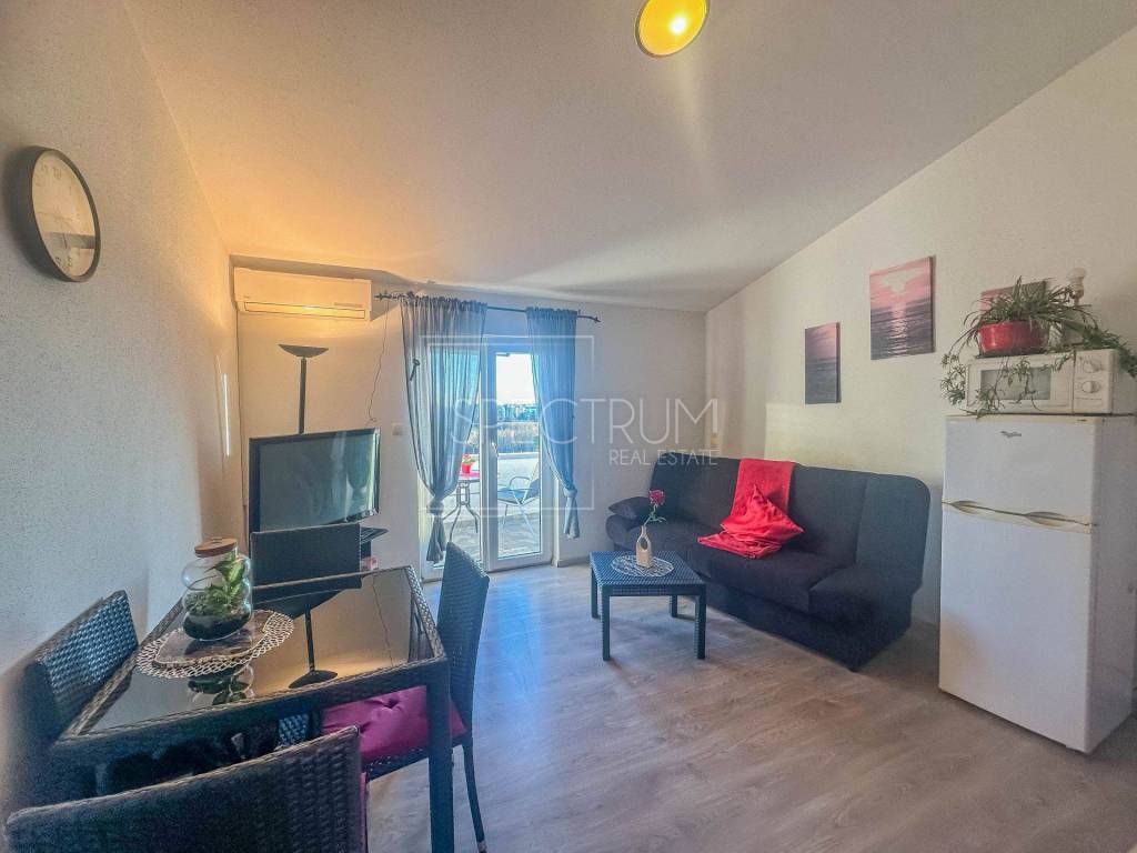 Stan se nalazi na 1.katu kuće sa 4 stambene jedinice. Površina stana iznosi 38.75 m2. Stan se sastoji od ulaznog hodnika, dnevnog boravka sa kuhinjom i blagovaonicom, spavaće sobe, kupaonice i terase sa koje se pruža predivan pogled na more i na grad Novigrad. Na terasu se dolazi iz dnevnog boravka. Grijanje je regulirano putem klima uređaja. Stan se prodaje namješten. Stanu pripada parkirno mjesto koje se nalazi u sklopu okućnice.