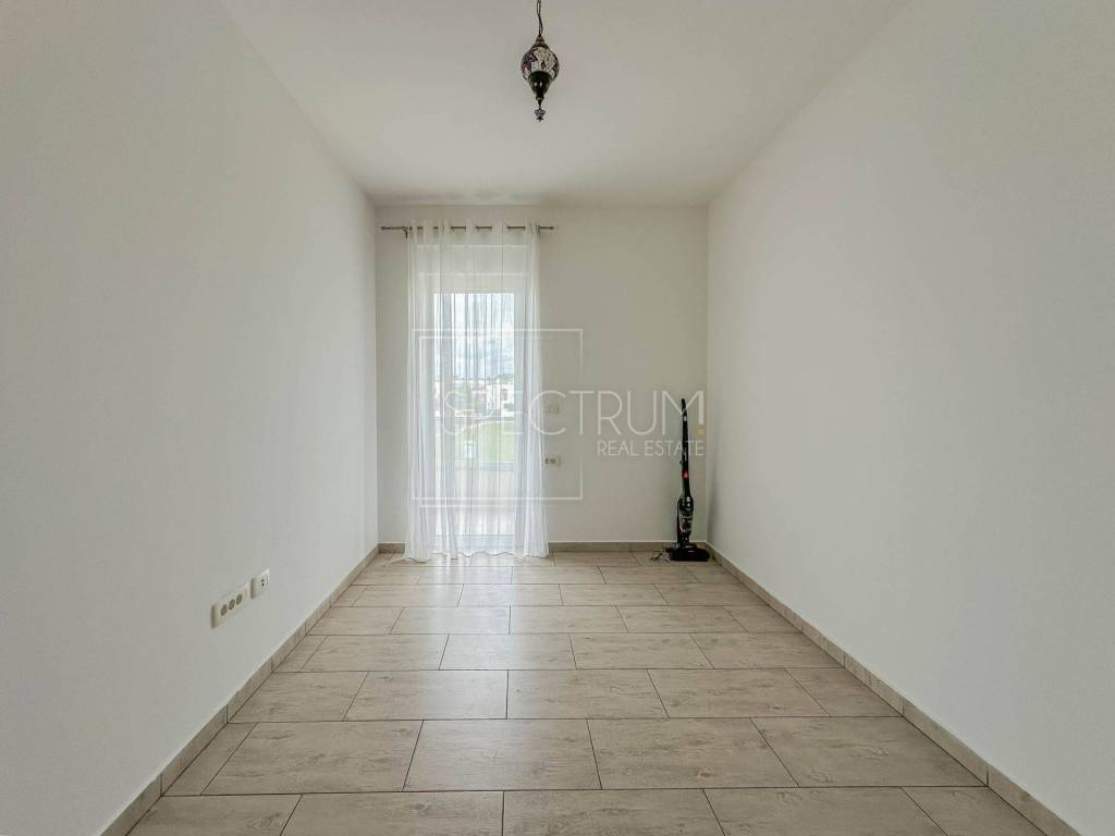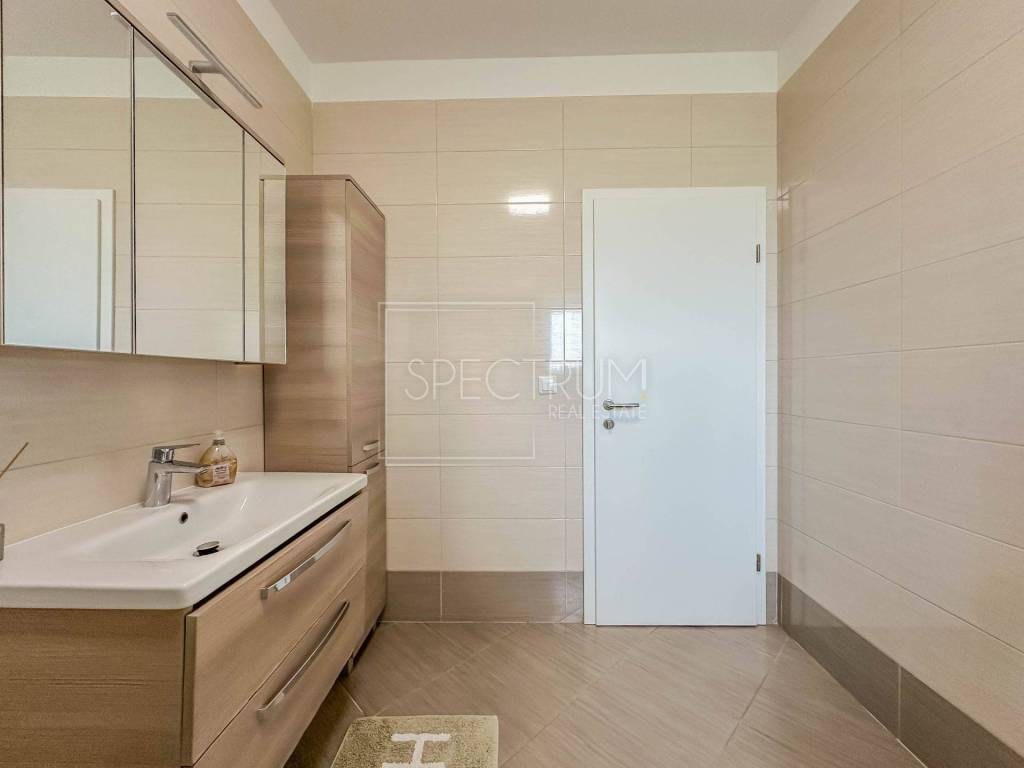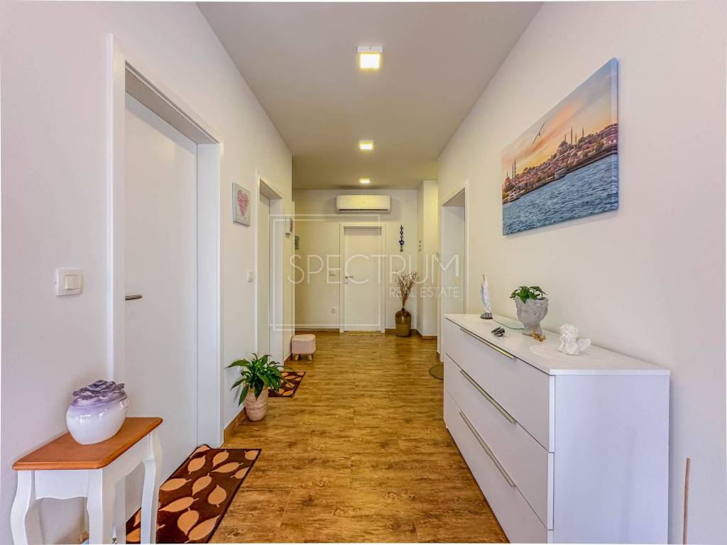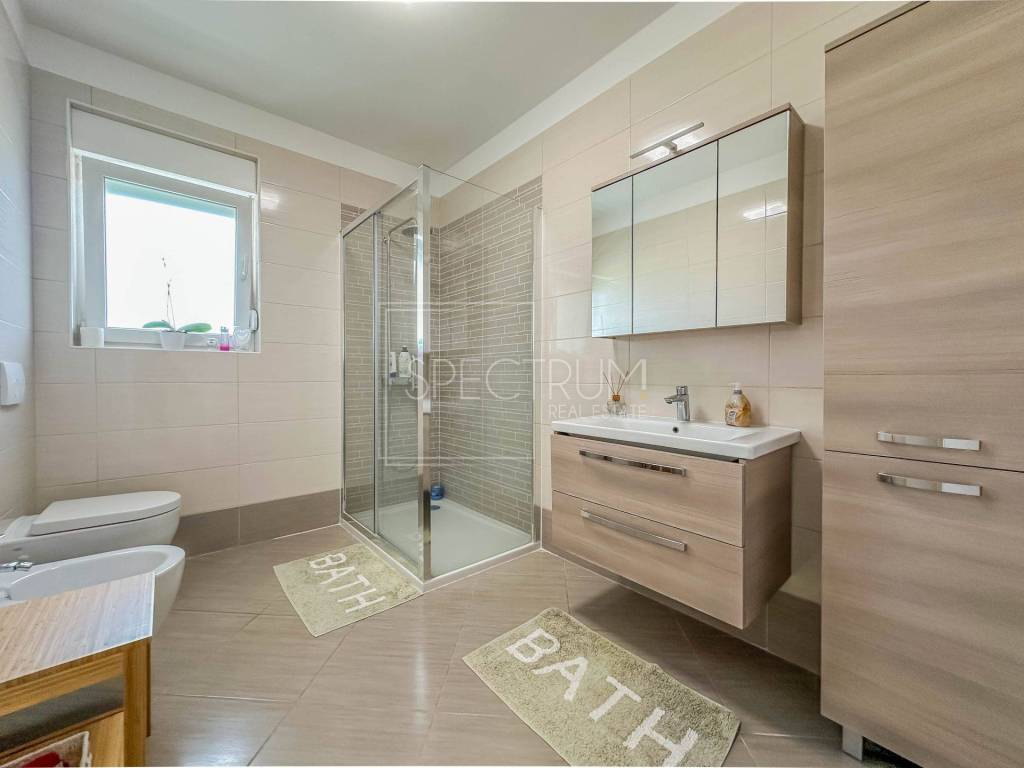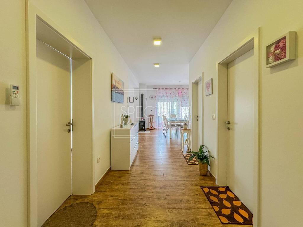 Stan se nalazi na 1.katu manje stambene zgrade. Površina stana iznosi 120.50 m2. Stan se sastoji od ulaznog hodnika, dnevnog boravka sa kuhinjom i blagovaonicom open space koncepta, 3 spavaće sobe, kupaonice, wc-a, ostave, prostrane natkrivene terase i još jedne manje terase. Unutarnjim stepenicama dolazi se do prostrane krovne terase sa koje se pruža predivan pogled na grad Novigrad i na more. Ova krovna terasa predstavlja idealan prostor za uživanje i druženje. Na krovnoj terasi postoji mogućnost ugradnje jacuzzija i vanjskog tuša. Zbog svoje veće površine, stan pruža veliki komfor. Stan se prodaje namješten. Grijanje je regulirano putem podnog grijanja na struju, klima uređaja i peći na drva. U vlasništvu stana su i 2 parkirna mjesta.